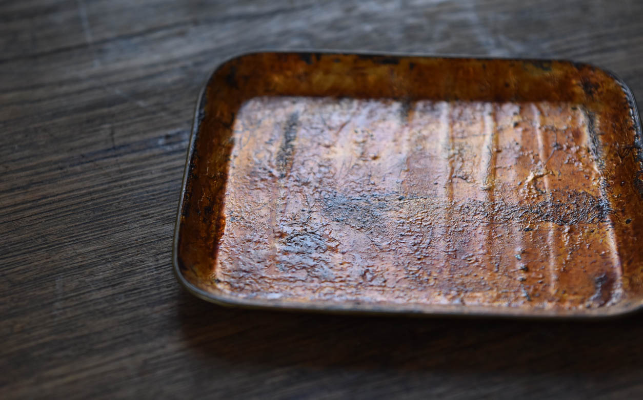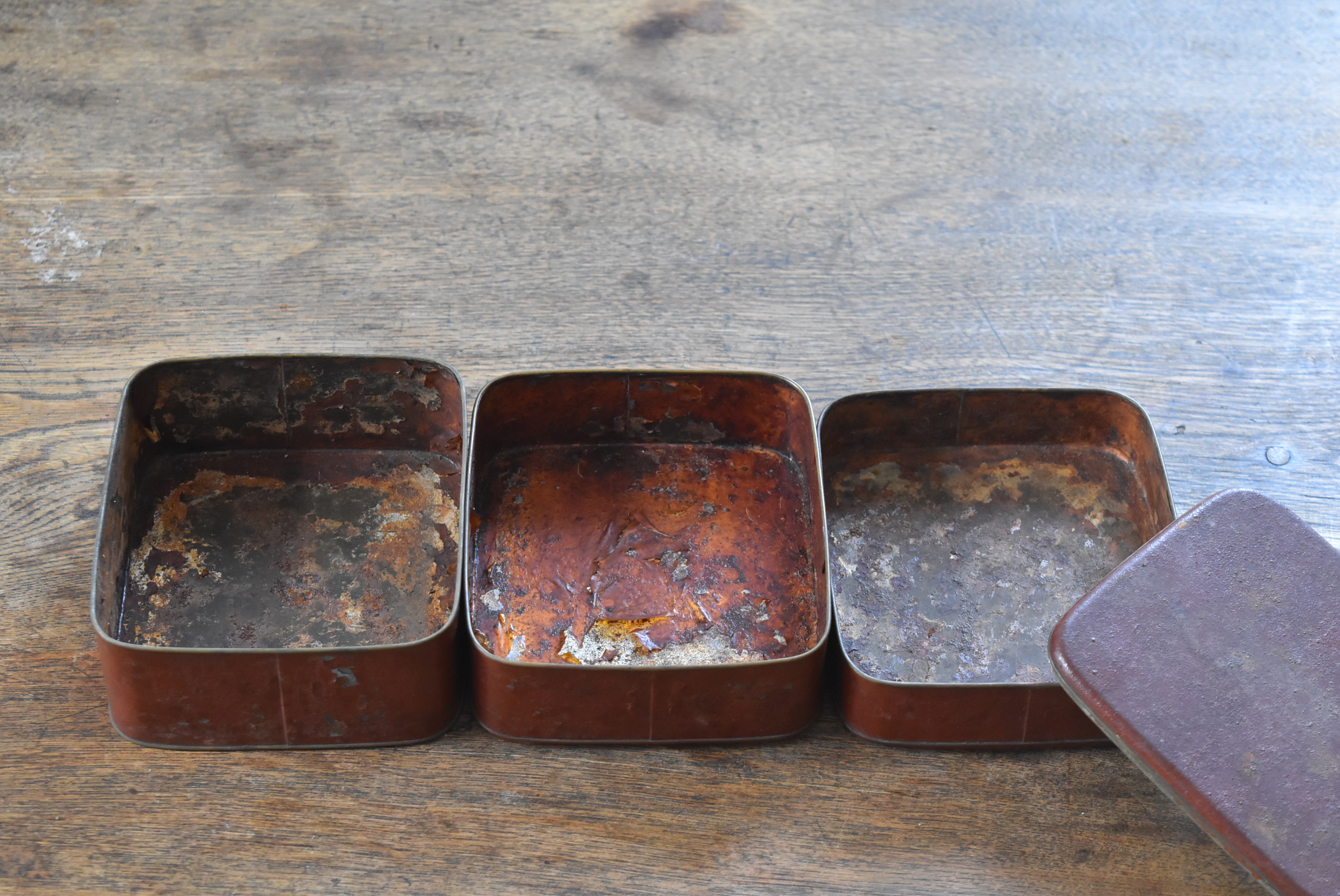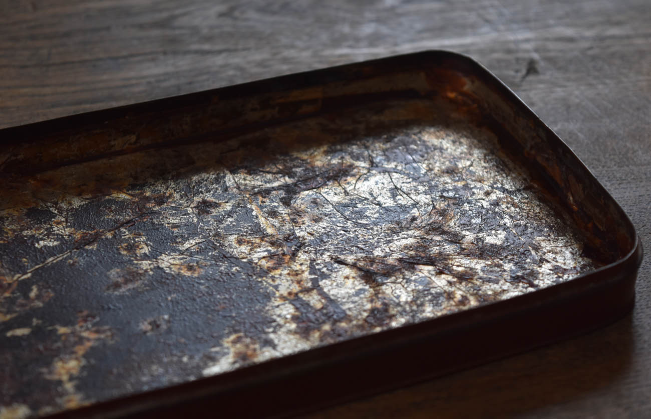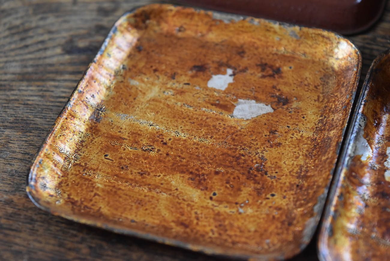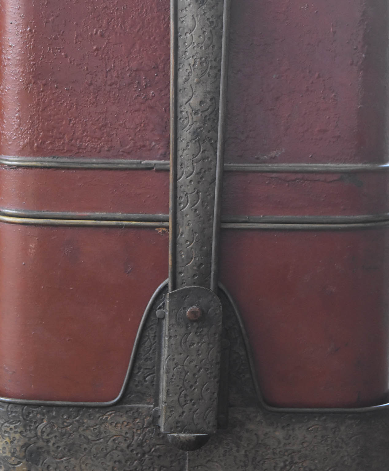 ブリキ製の野弁当一式です。三段重に水筒、箸や器を入れられる箱が全てピッタリとはまります。真鍮の枠にのみ彫りや透かし模様が施されています。縁は真鍮で表面には漆が塗られています。小皿は20枚、皿の表と箱の内側には箔が貼られていたようです。収まりも美しく、シンプルながら日本の生活文化を感じる美しい手仕事です。