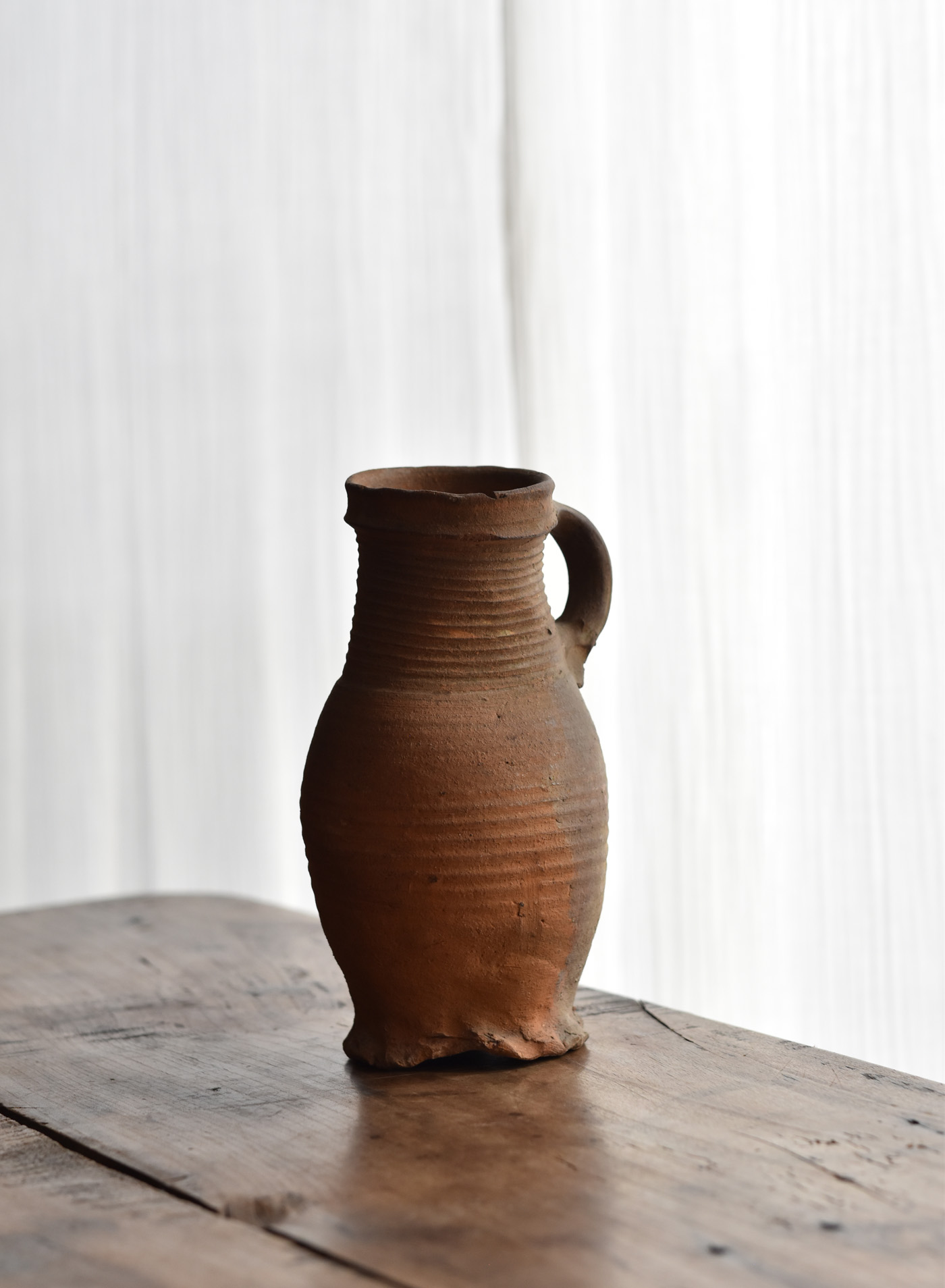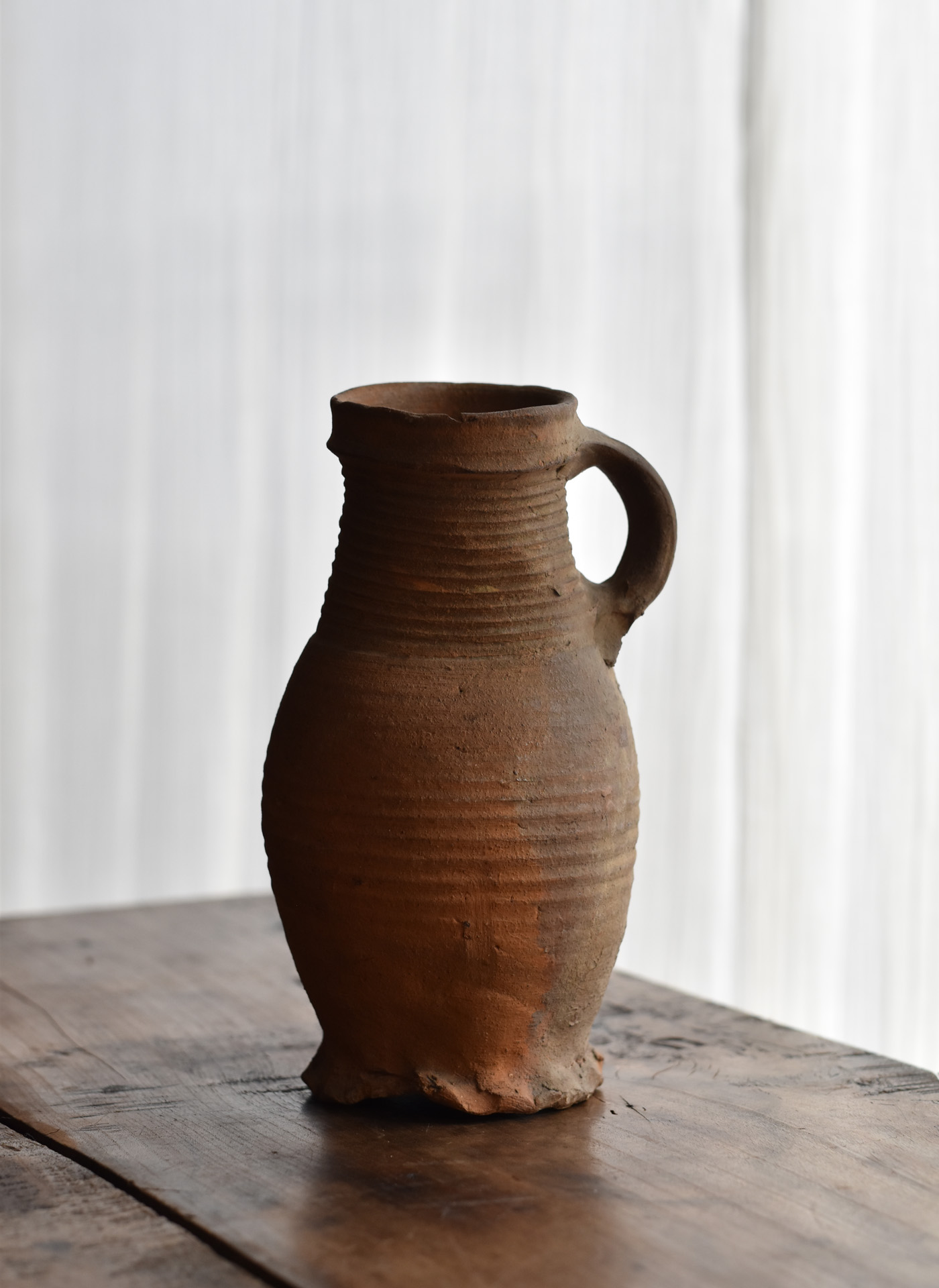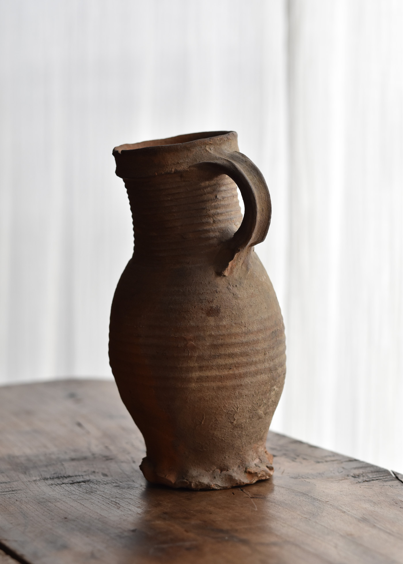 ブリューゲルの絵画に度々見られるライン古陶。底に欠けはありますが、ニュウやリペアなど無く当時の状態を保っています。首を傾げたような愛くるしいカタチ。轆轤目やひだ状の高台の作りなど、しっかりと特徴のある、絵になるものです。