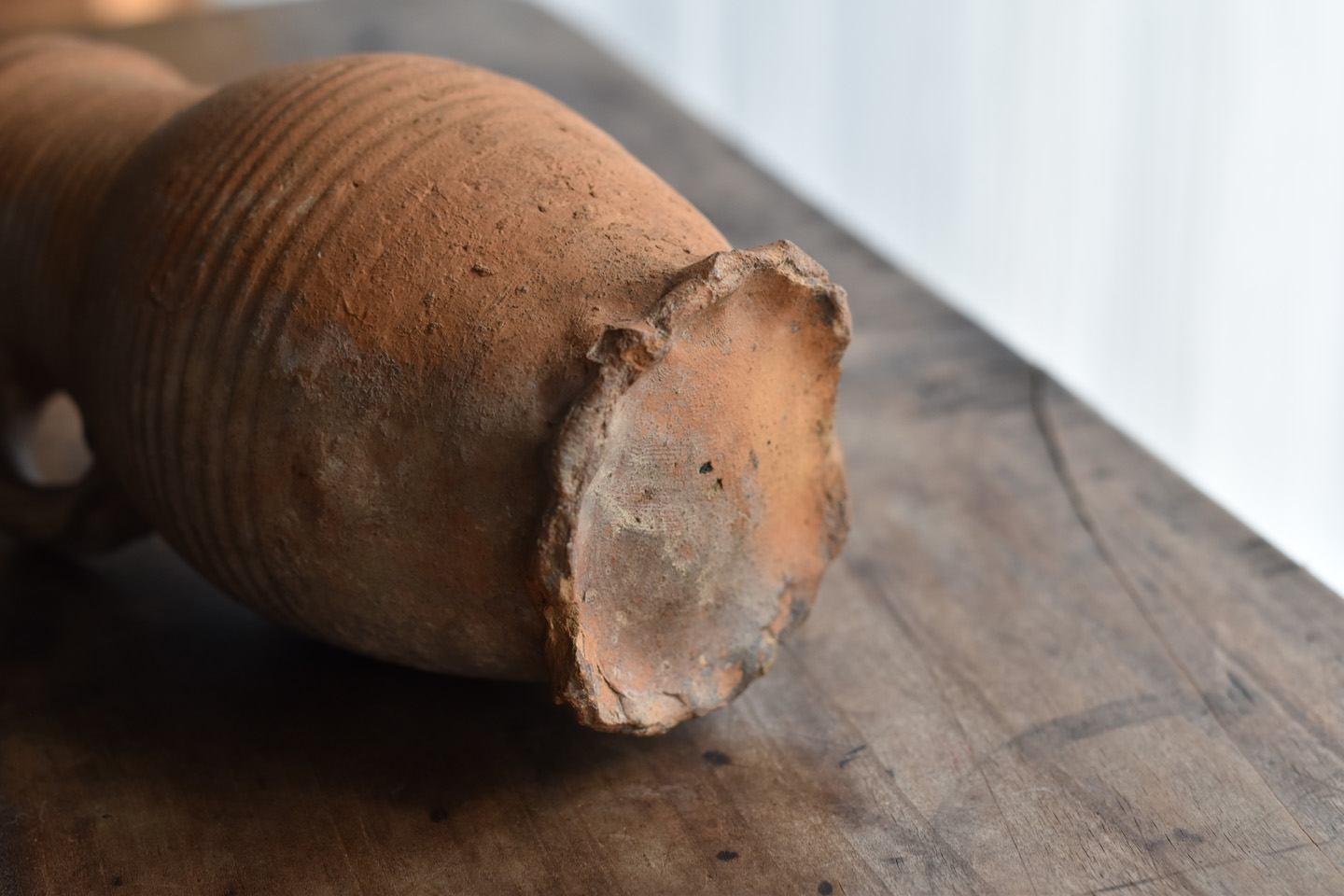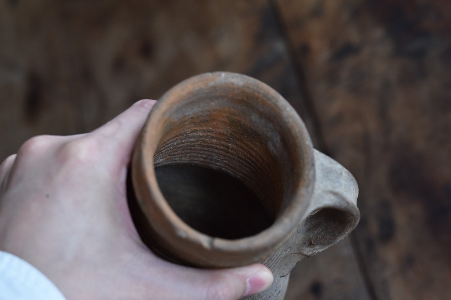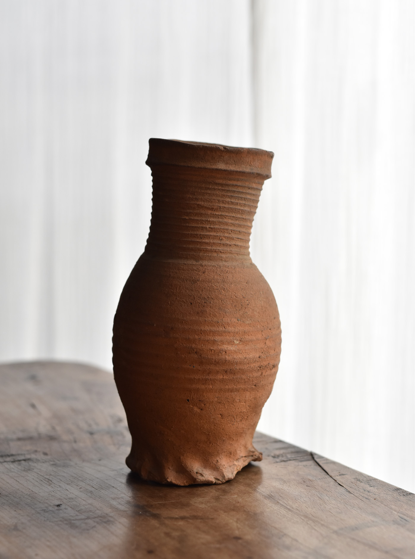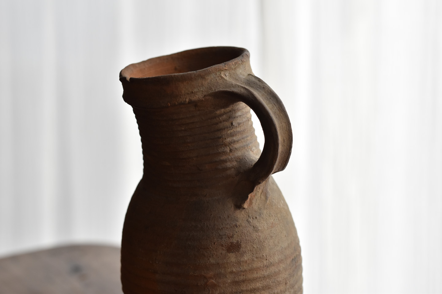 ブリューゲルの絵画に度々見られるライン古陶。底に欠けはありますが、ニュウやリペアなど無く当時の状態を保っています。首を傾げたような愛くるしいカタチ。轆轤目やひだ状の高台の作りなど、しっかりと特徴のある、絵になるものです。