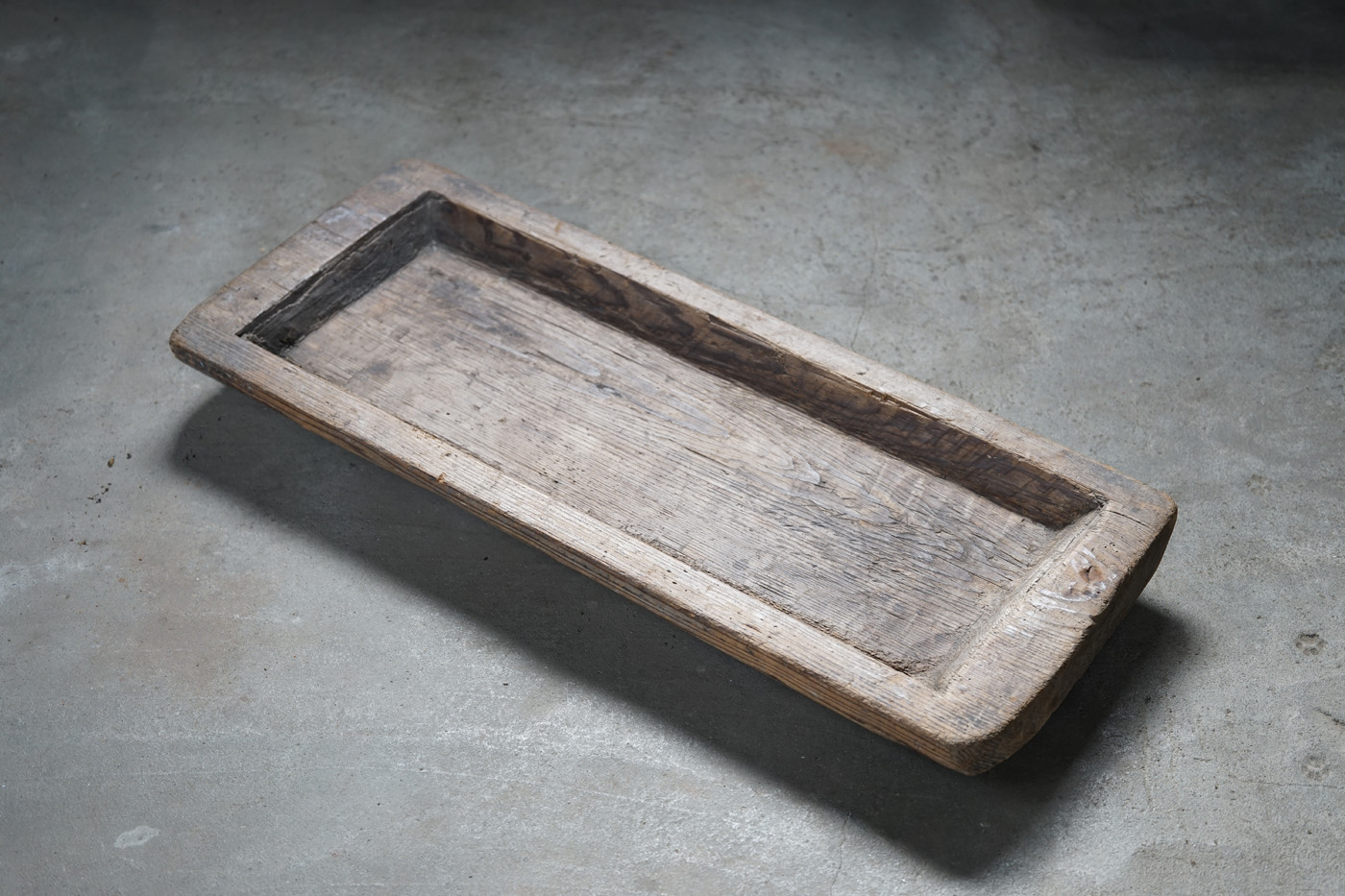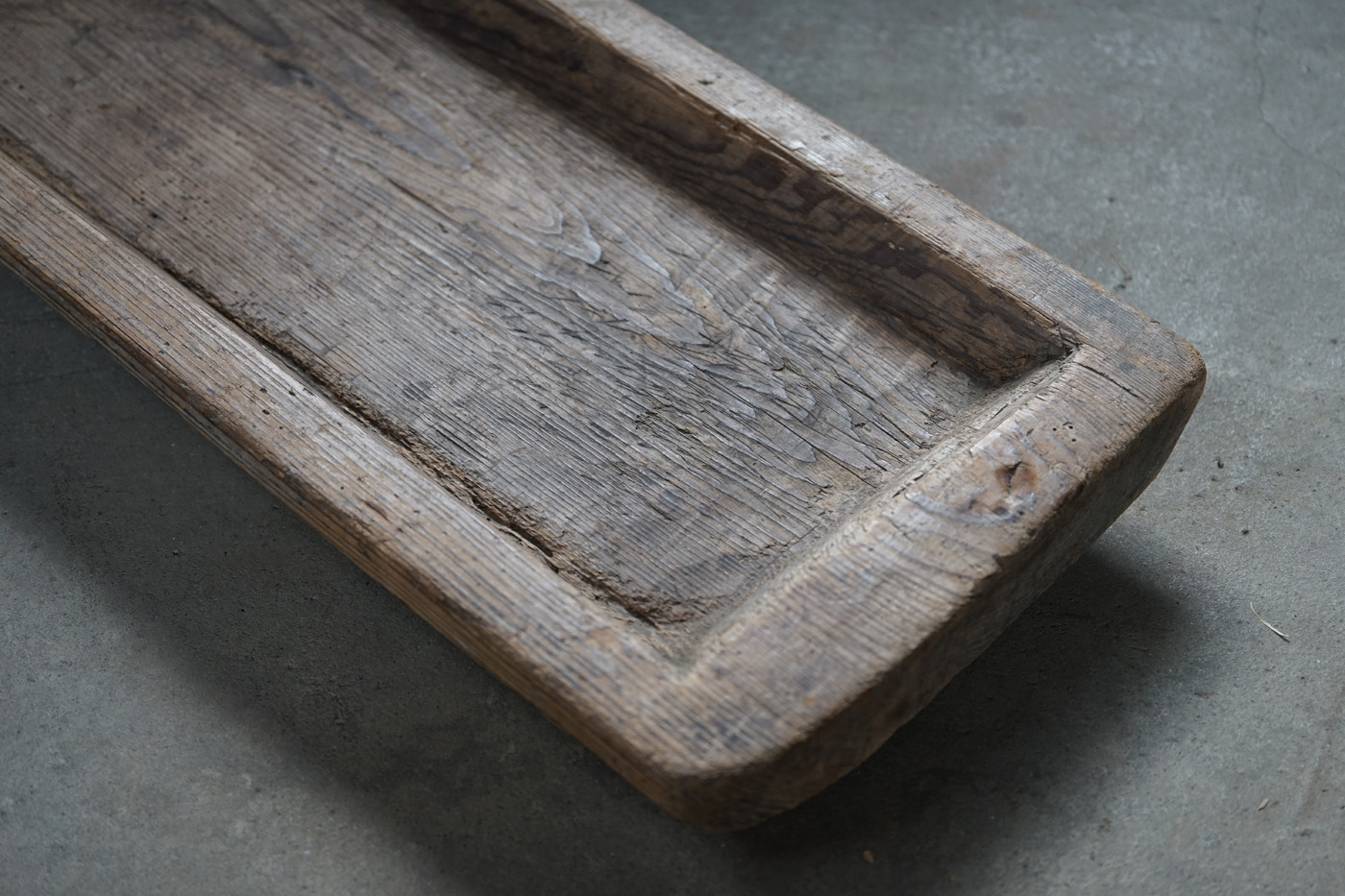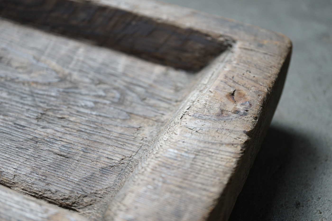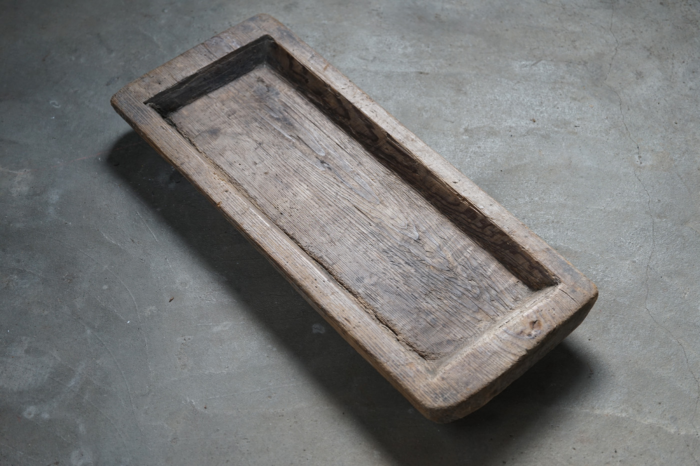 杉の無垢を掘り出して作られています。草系の餌入れではないかとのこと。裏面は柔らかな造形で敷板や置床にも良いです。