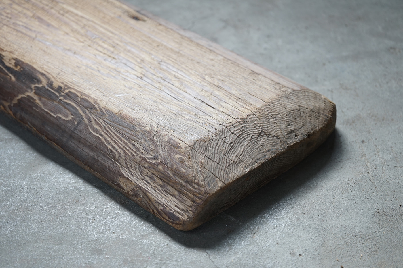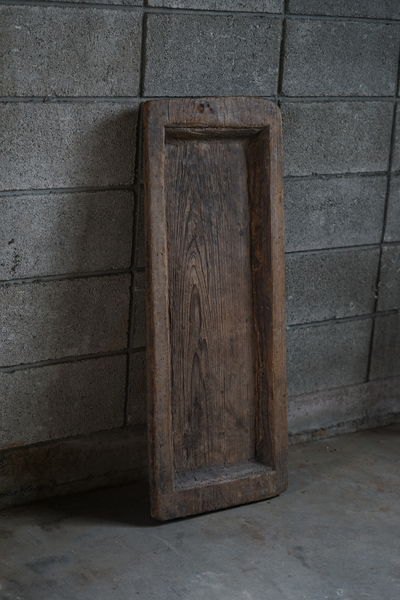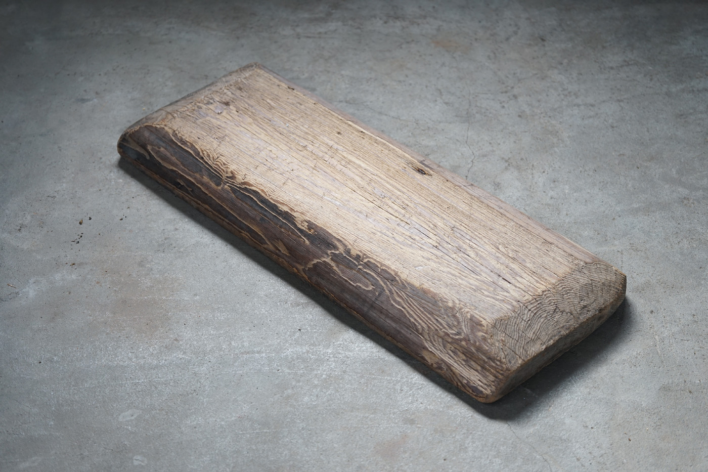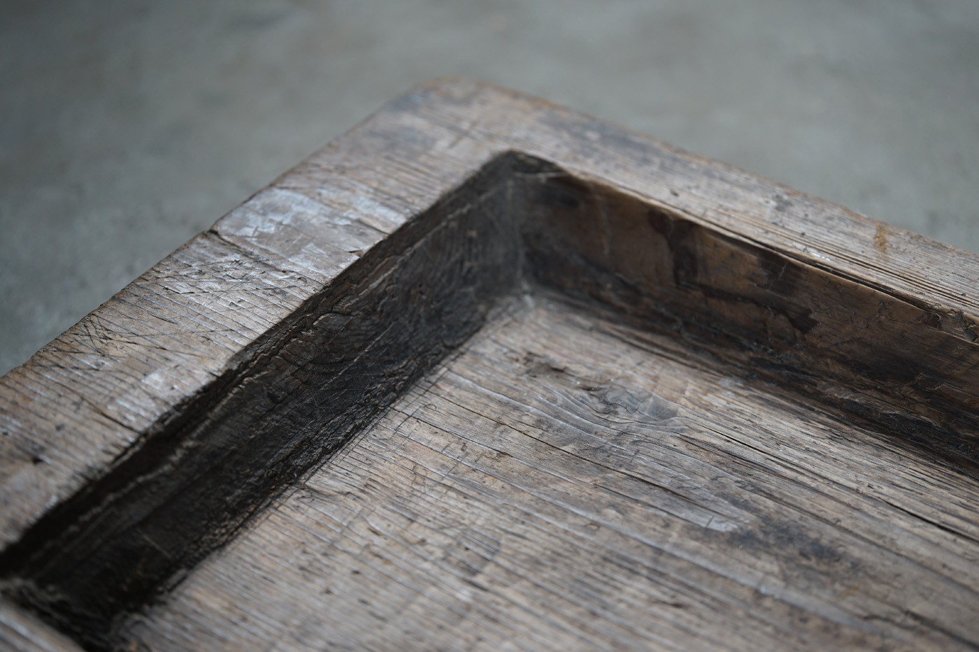 杉の無垢を掘り出して作られています。草系の餌入れではないかとのこと。裏面は柔らかな造形で敷板や置床にも良いです。
