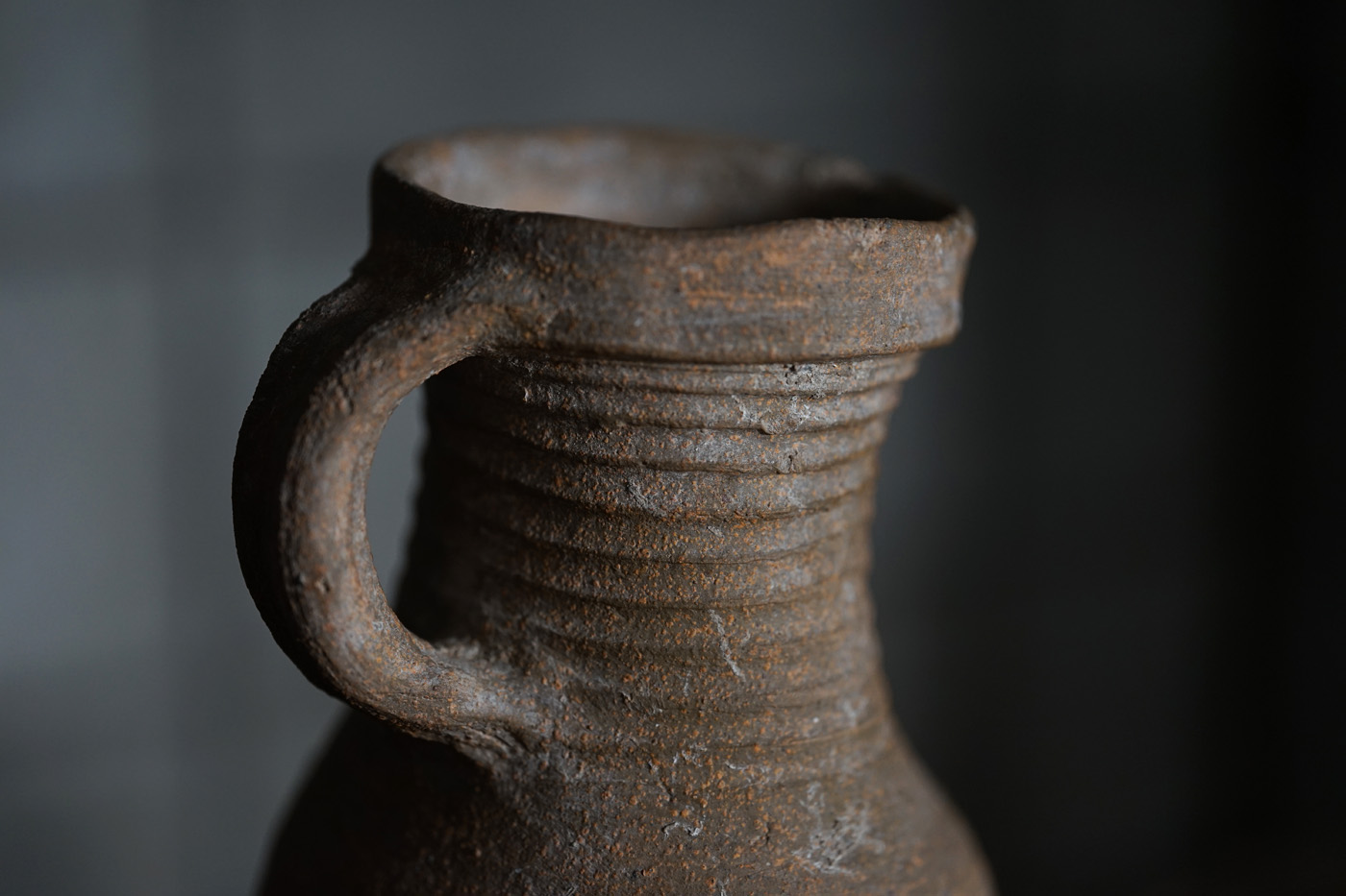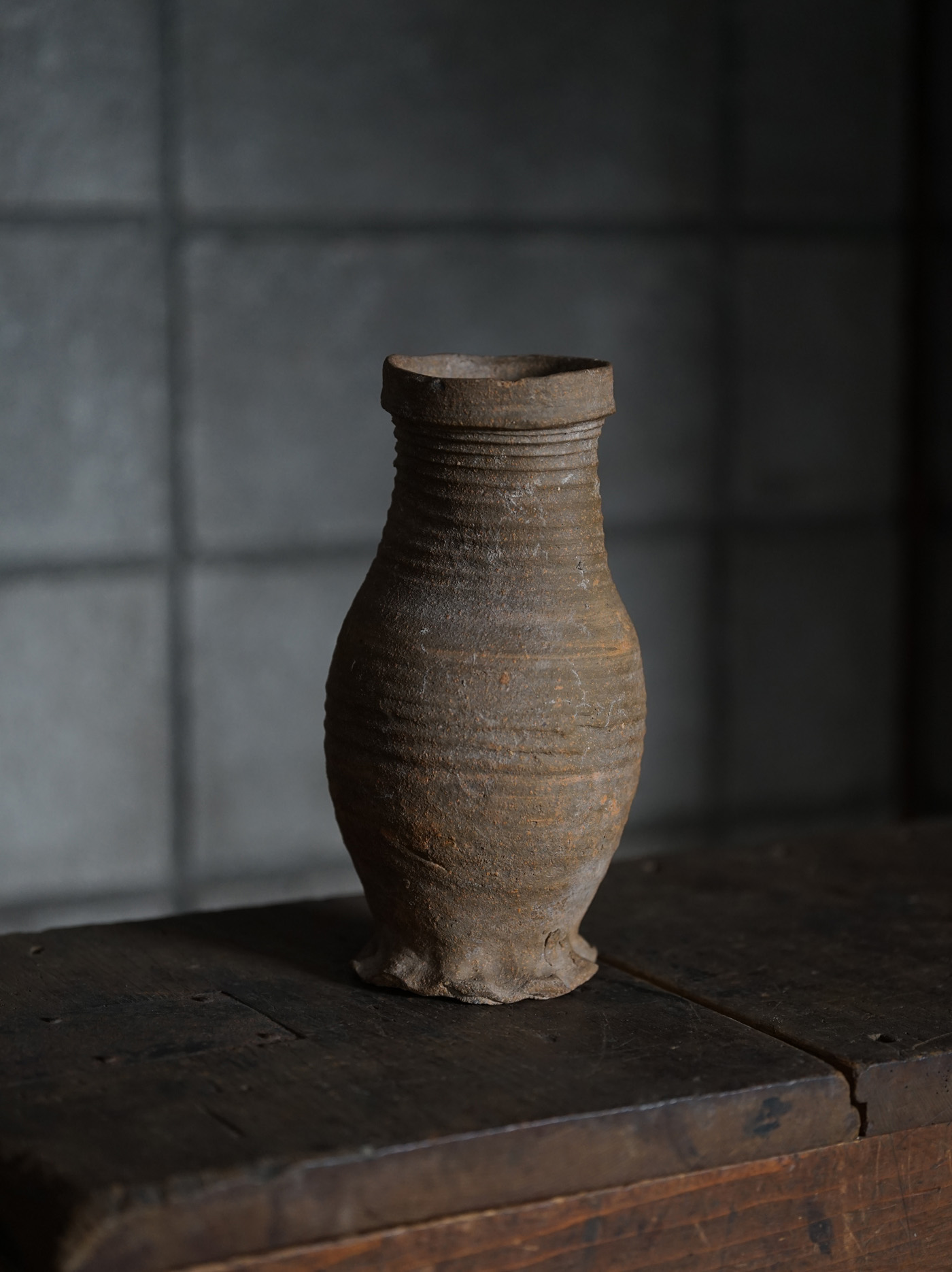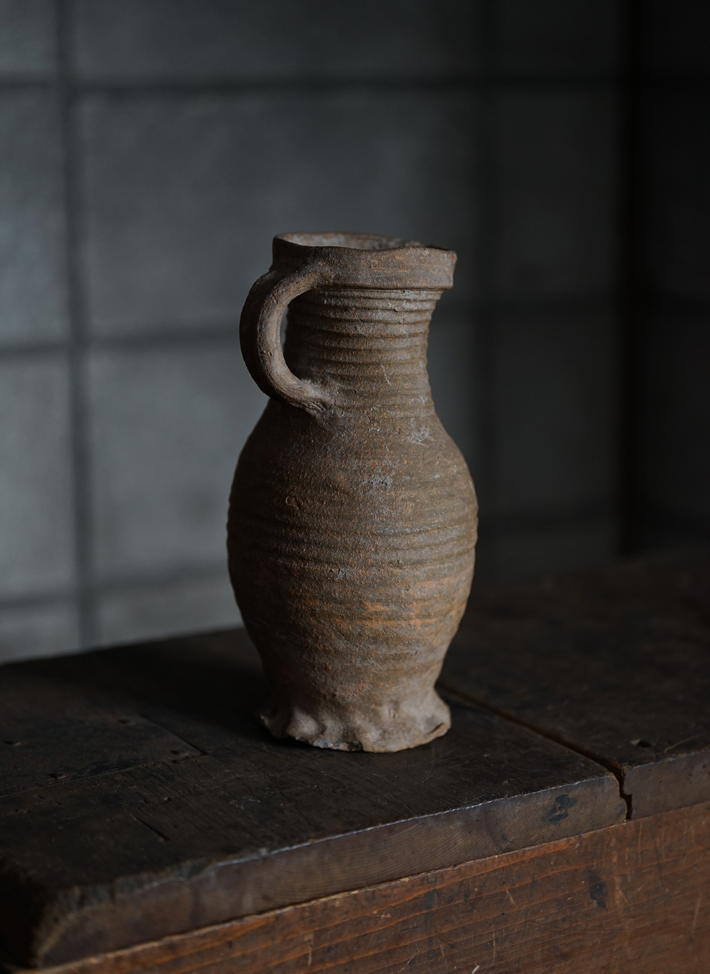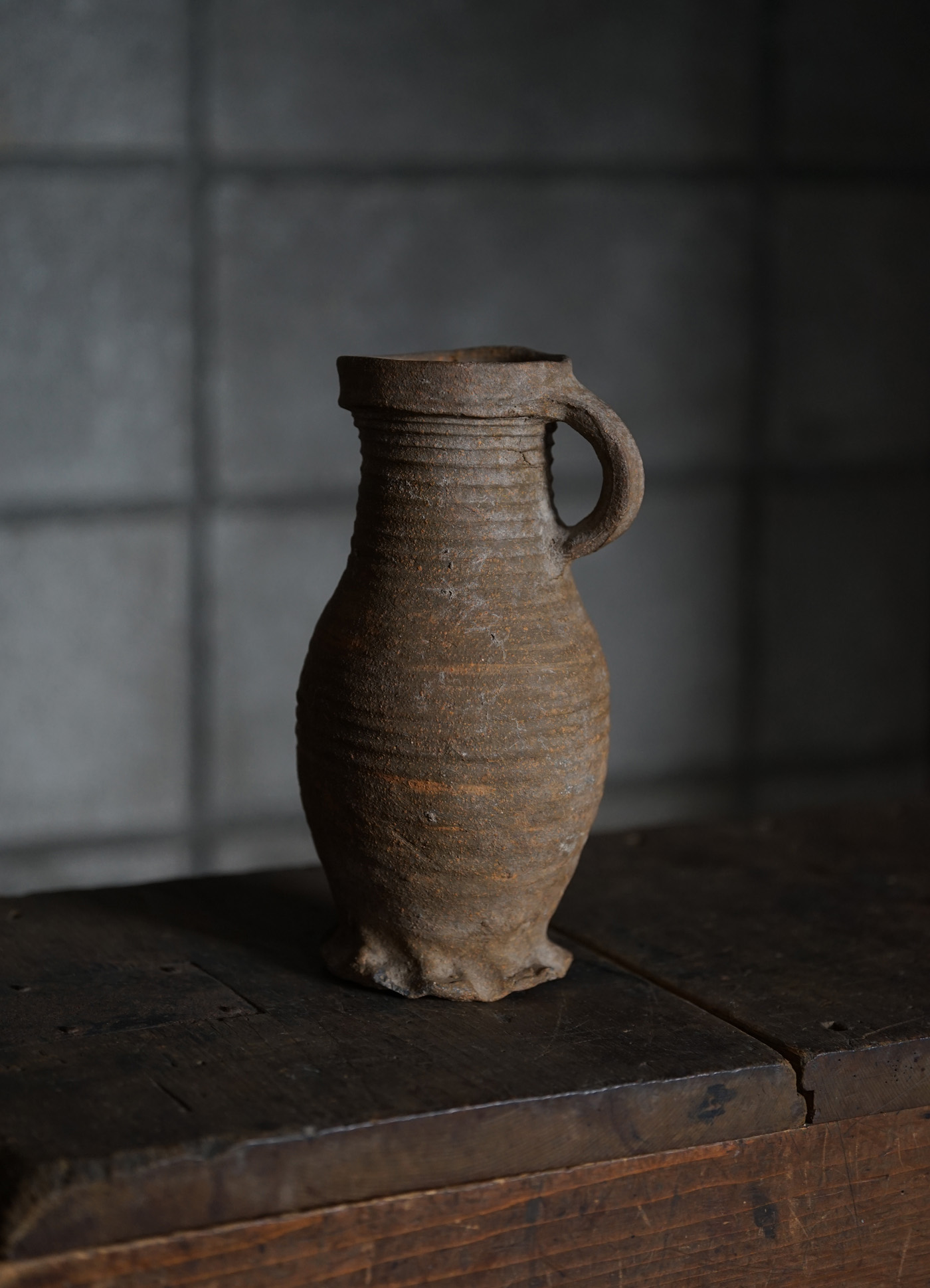 ブリューゲルの絵画に度々見られるライン古陶。底の襞に僅かな欠けはありますが、ニュウやリペアなど無く当時の状態を保っています。轆轤目やひだ状の高台の作りなど、しっかりと特徴のある、絵になるものです。