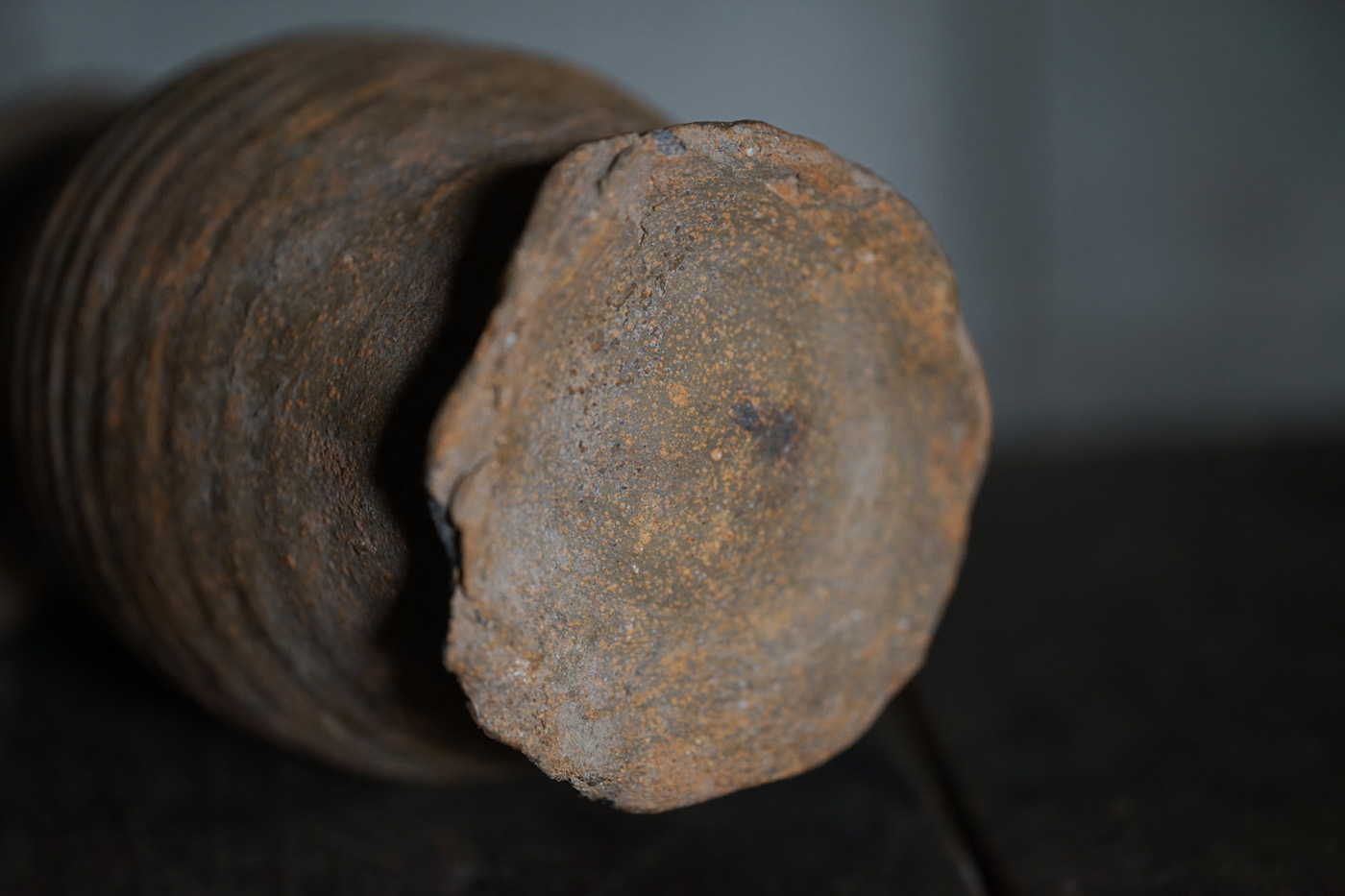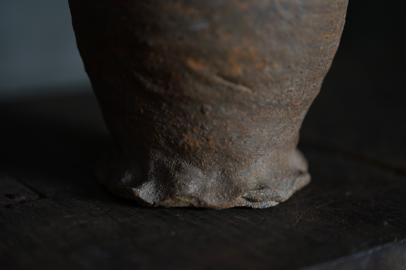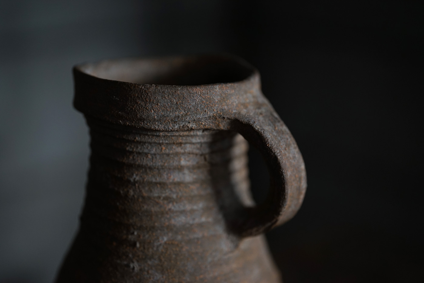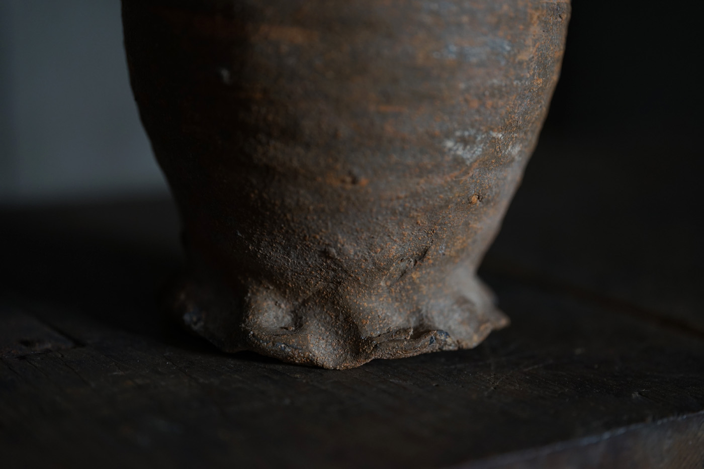 ブリューゲルの絵画に度々見られるライン古陶。底の襞に僅かな欠けはありますが、ニュウやリペアなど無く当時の状態を保っています。轆轤目やひだ状の高台の作りなど、しっかりと特徴のある、絵になるものです。