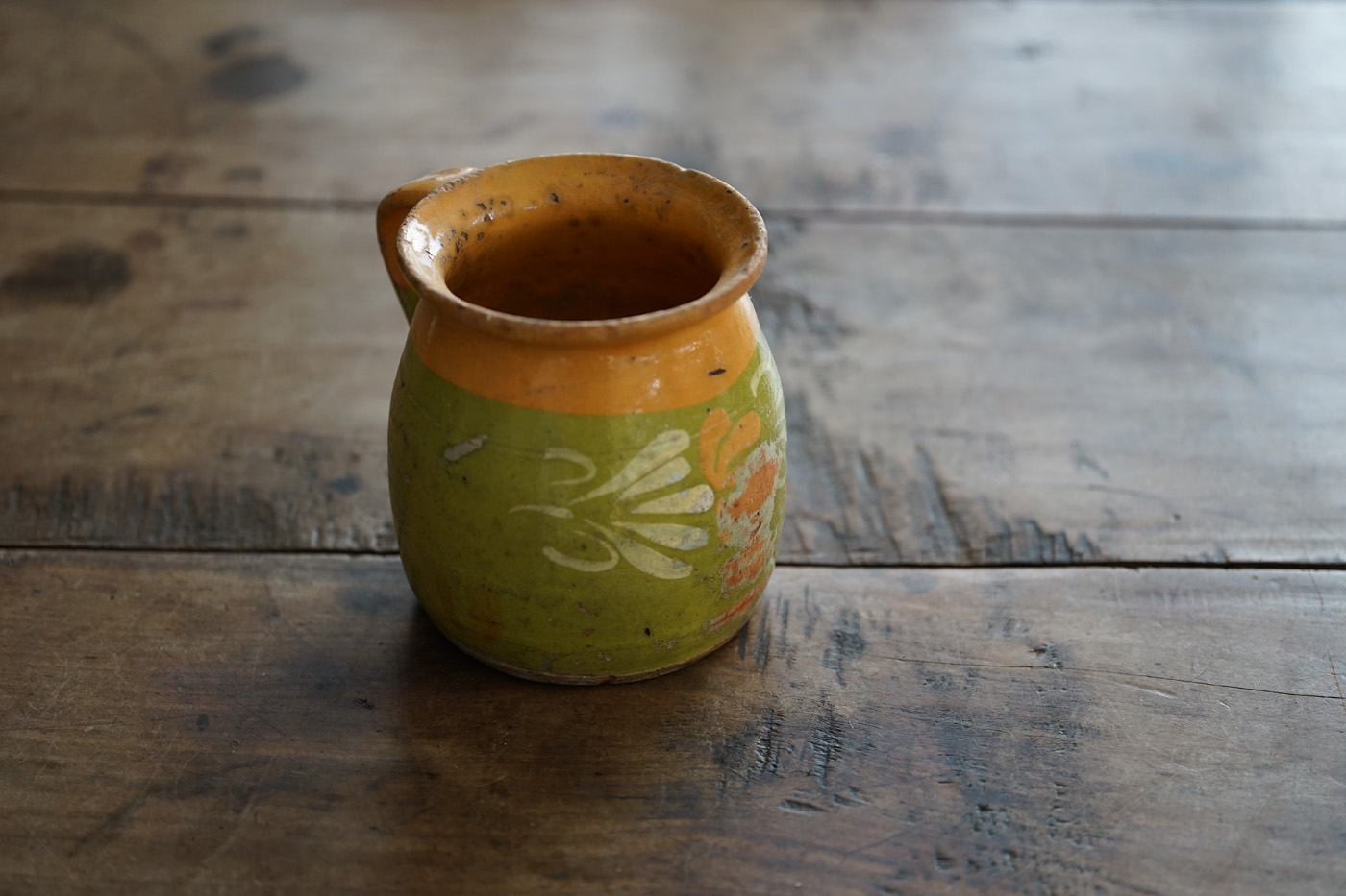 おそらくアルザス地方のものと思われます。温かみのある色合いと軽やかな絵が入っています。花入れにも良いと思います。