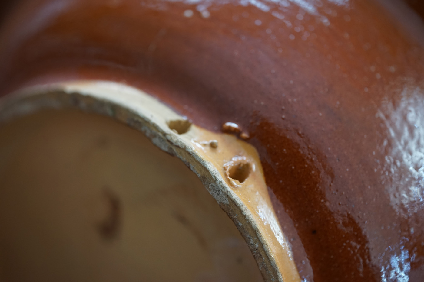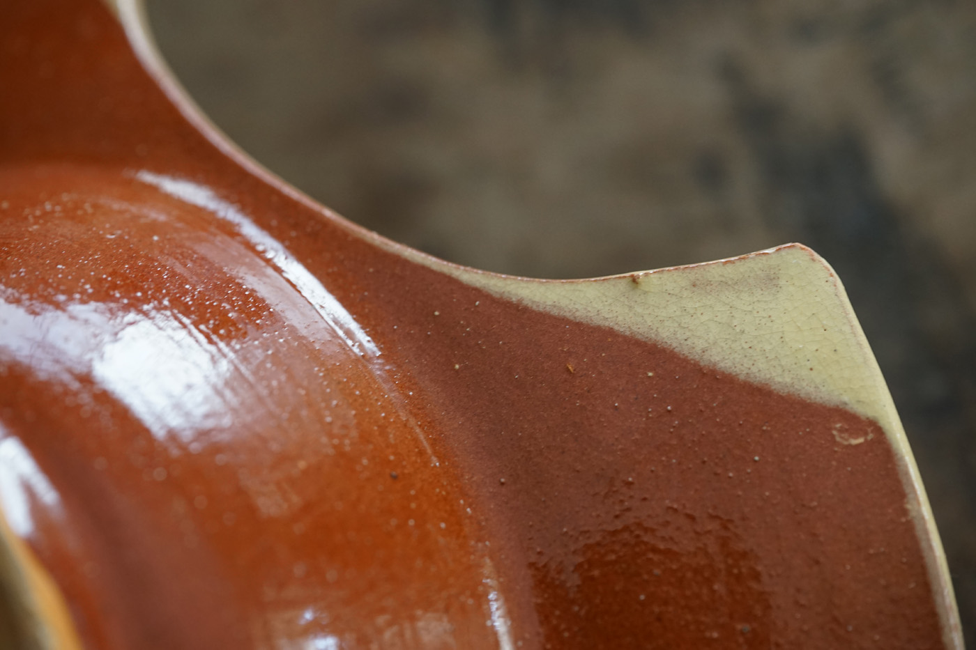 南仏のオークルを原土とした黄釉と赤土はリムに首がおさまるように特殊な形をしています。壁掛け用の穴も付けられていますので、当時の床屋などで使われていたものと思われます。島根の民陶、布児名焼きのような雰囲気があります。南仏らしい晴れやかな器です。食器としても綺麗な形をしています。