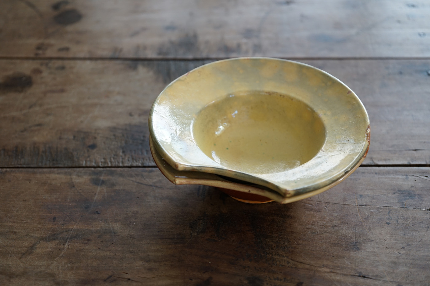 南仏のオークルを原土とした黄釉と赤土はリムに首がおさまるように特殊な形をしています。壁掛け用の穴も付けられていますので、当時の床屋などで使われていたものと思われます。島根の民陶、布児名焼きのような雰囲気があります。南仏らしい晴れやかな器です。食器としても綺麗な形をしています。