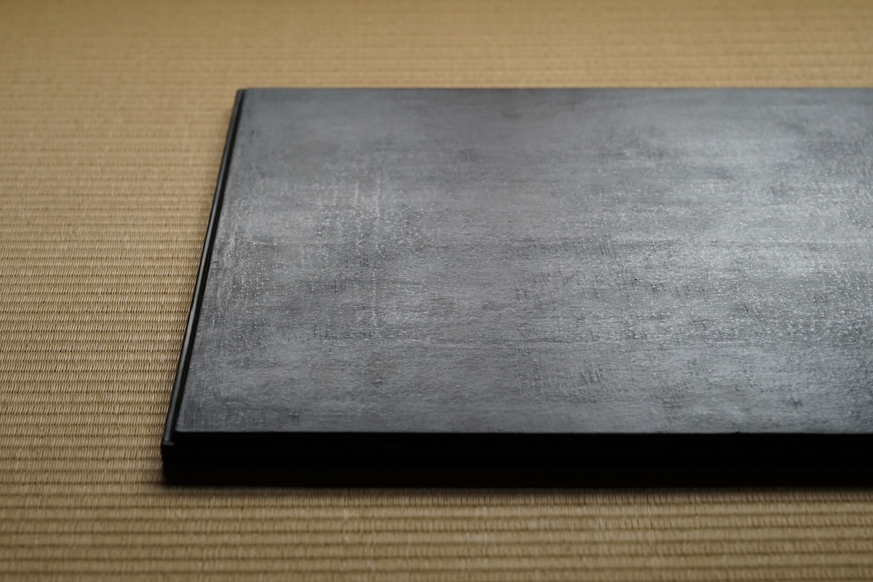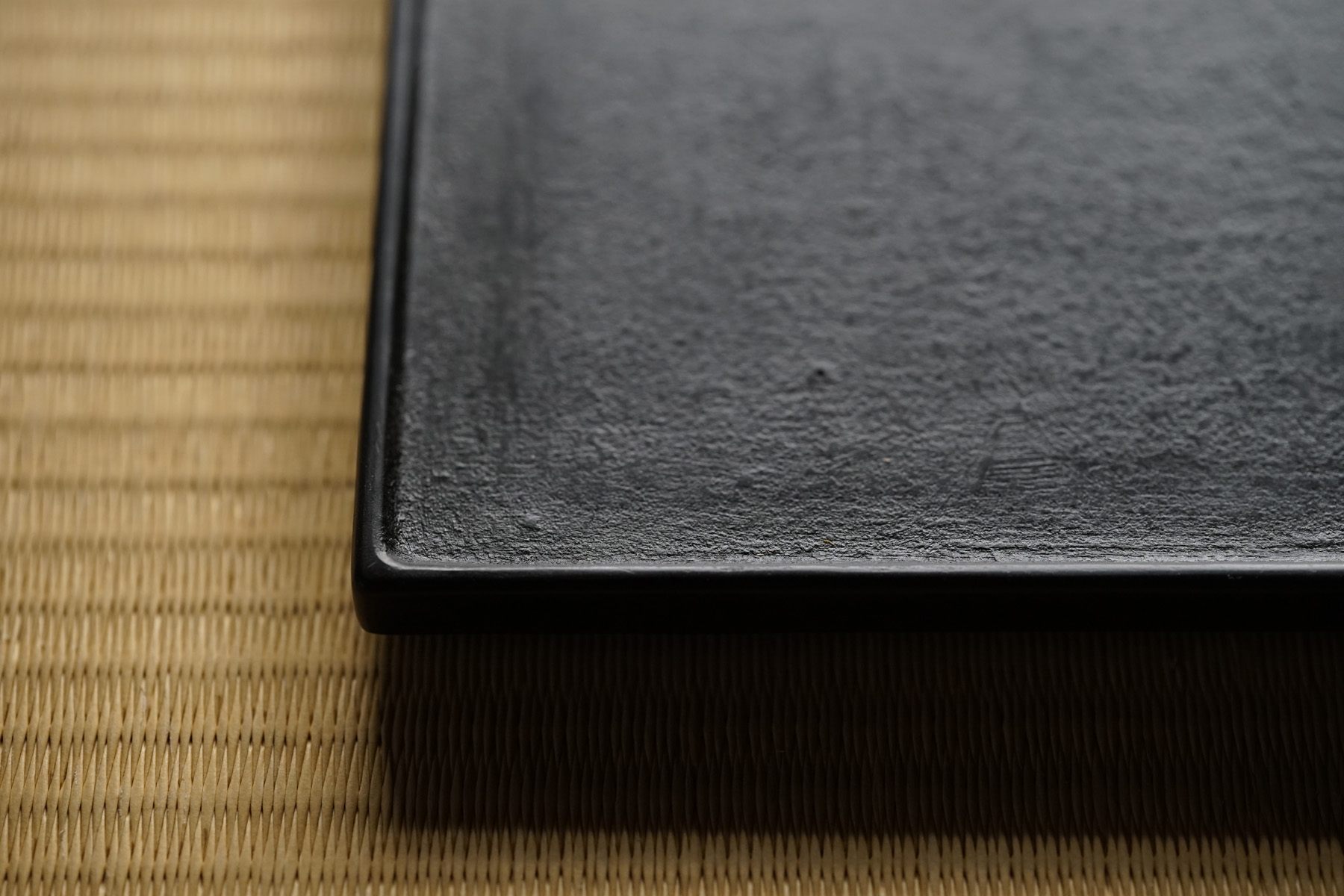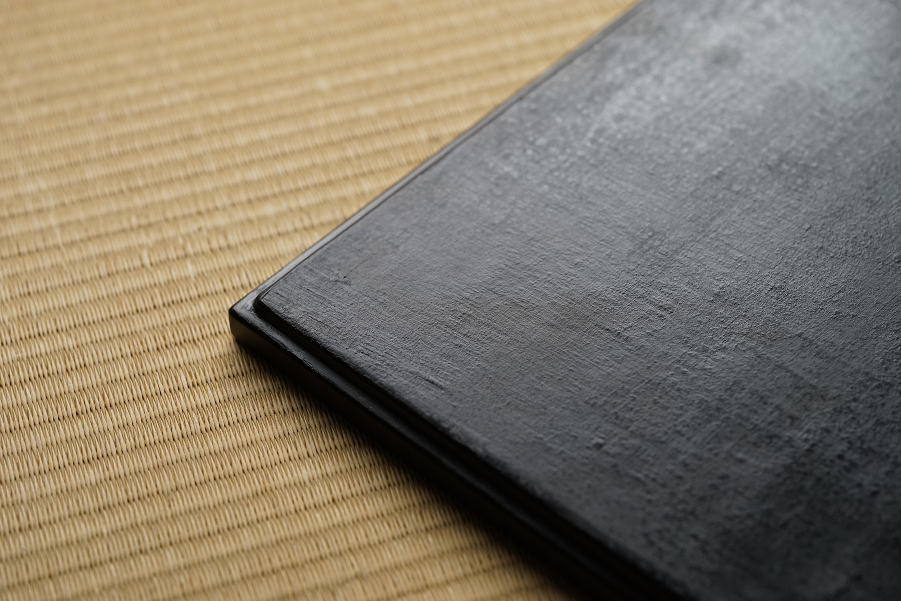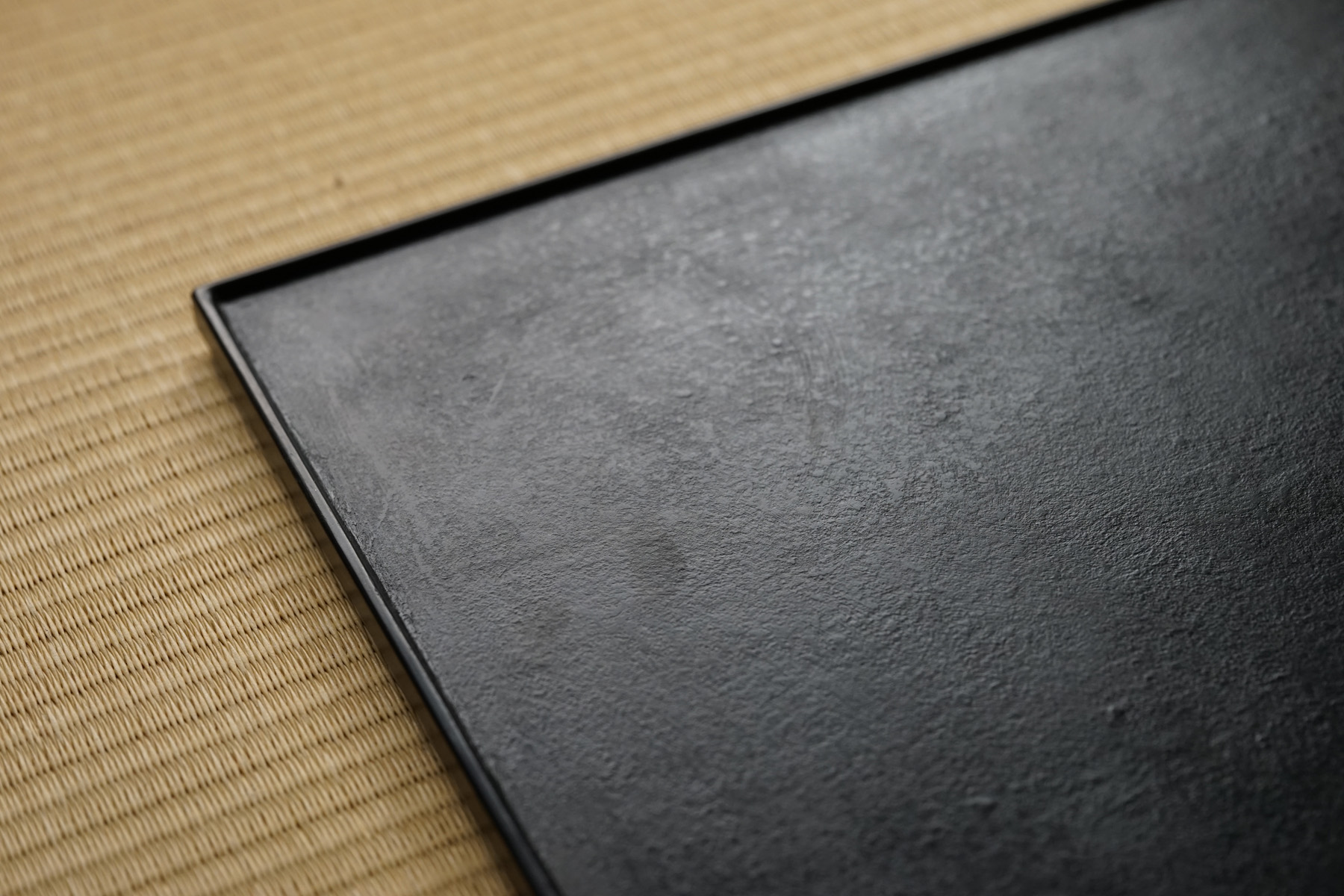 指物にて枠がつけられています。縁が僅かに立ち上がっており、手に取りやすく、またテーブルから少し浮いた印象となる為、軽やかな印象となります。独特なテクスチャーのベンガラ仕上げの作品は、蒔地(漆を塗って乾く前に「地の粉」をふりかける)を重ねてから漆を数回塗り重ね、ベンガラを混ぜた漆を更に数回塗り重ねた後に研磨して拭き漆で仕上げています。磨き上げた枠部分とざらっとした質感を残した面の対比が美しいです。