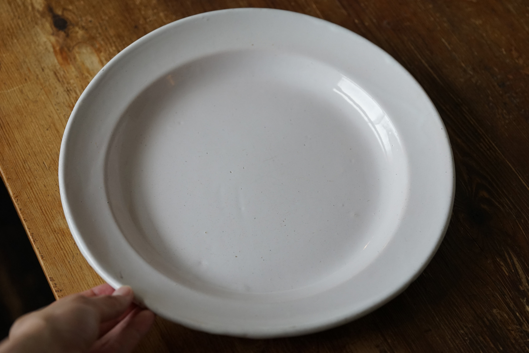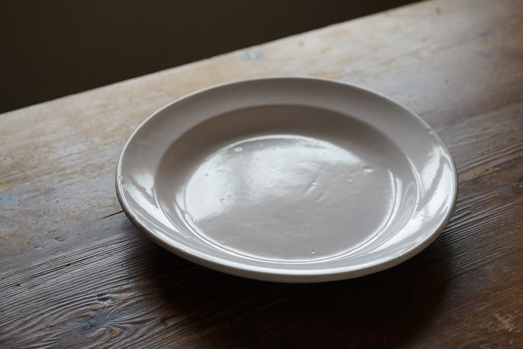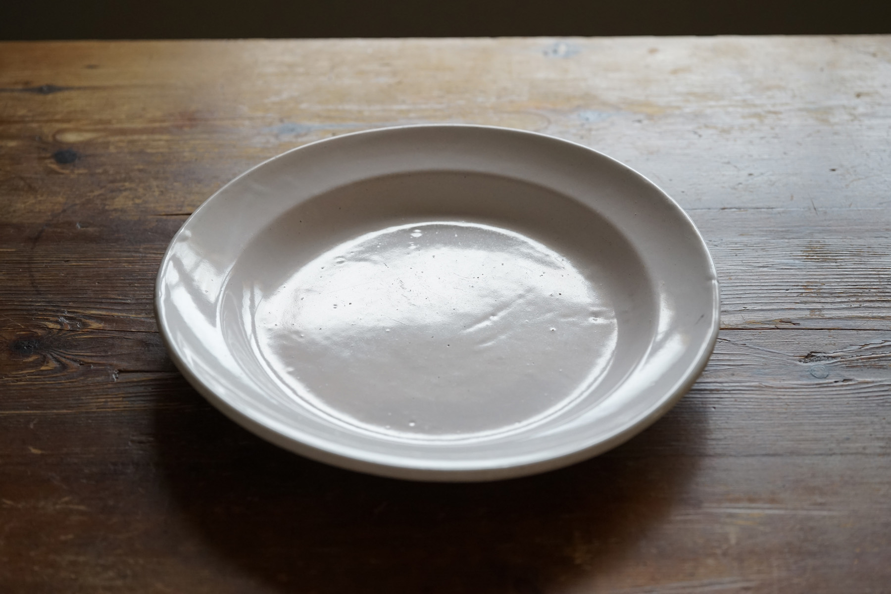 薄造りで極めてシンプルな丸大皿です。花リムなどに比べて目にすることは少ない形です。とろりとした釉調が美しいです。