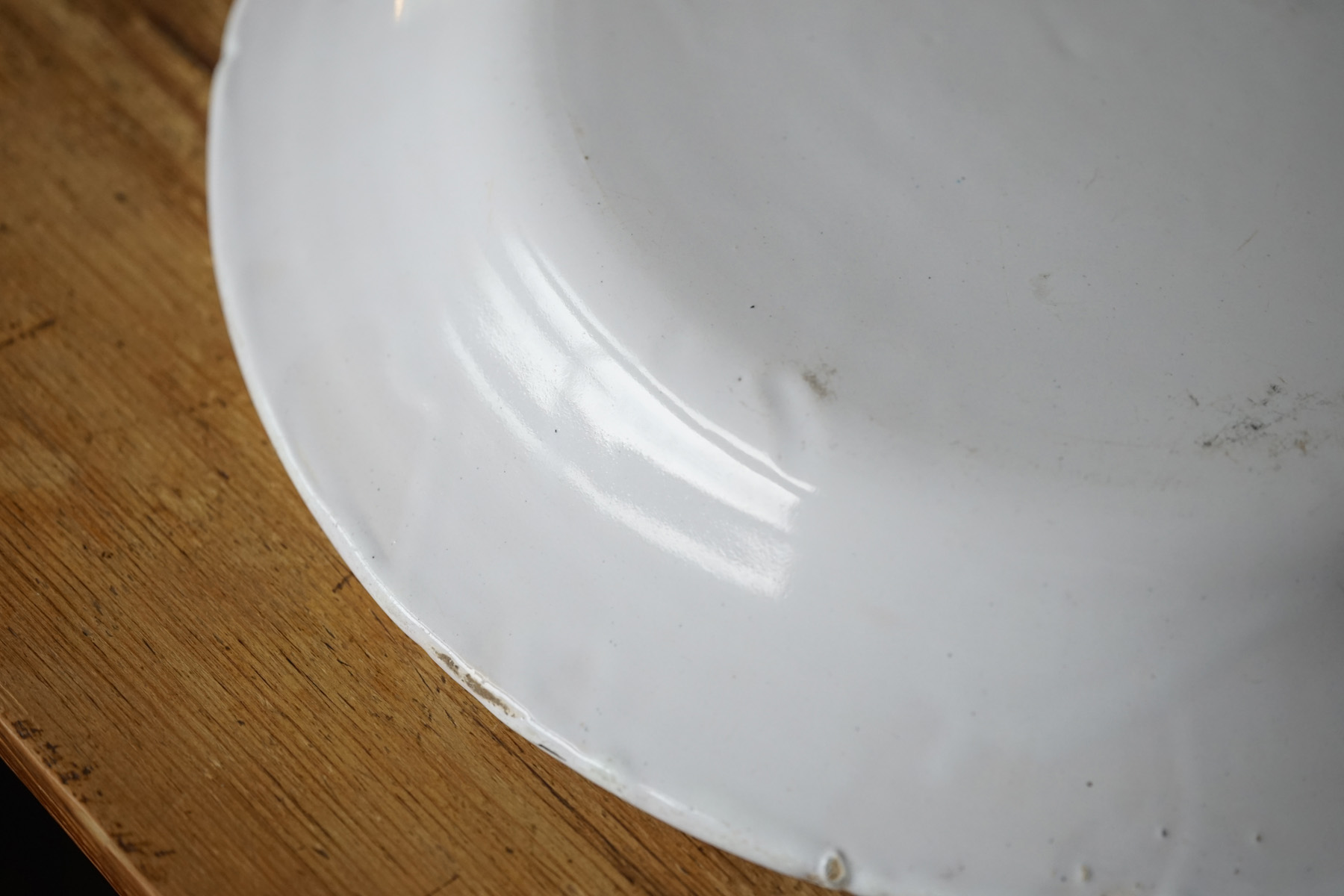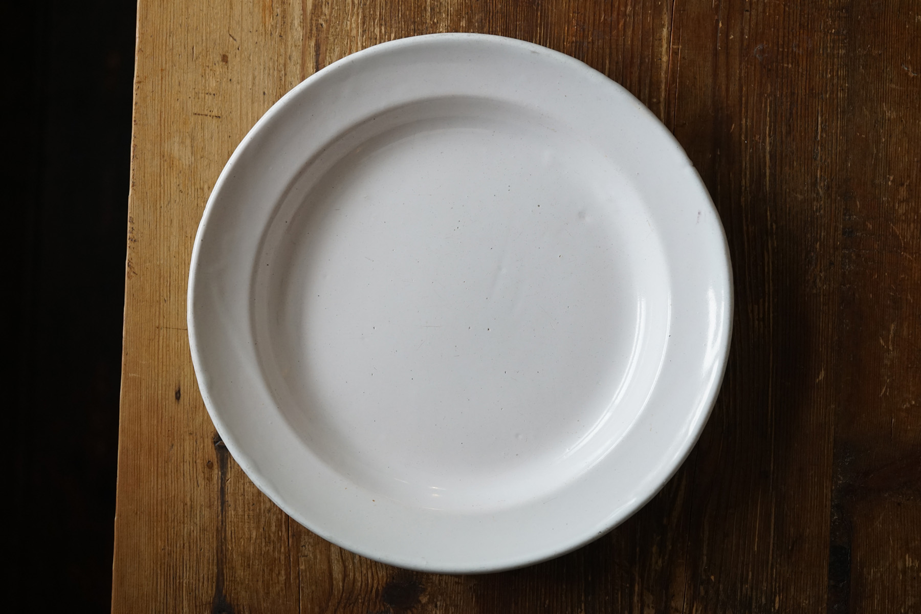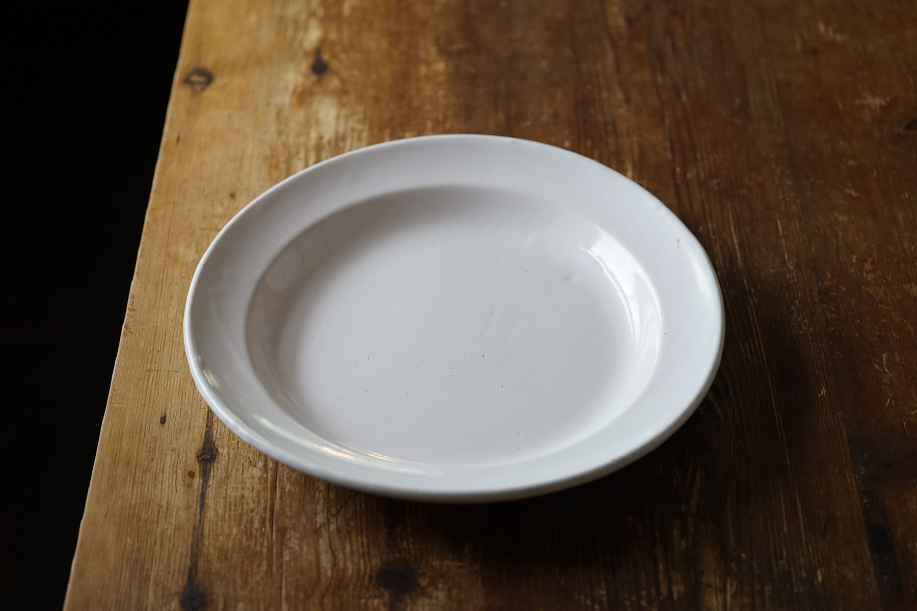 薄造りで極めてシンプルな丸大皿です。花リムなどに比べて目にすることは少ない形です。とろりとした釉調が美しいです。