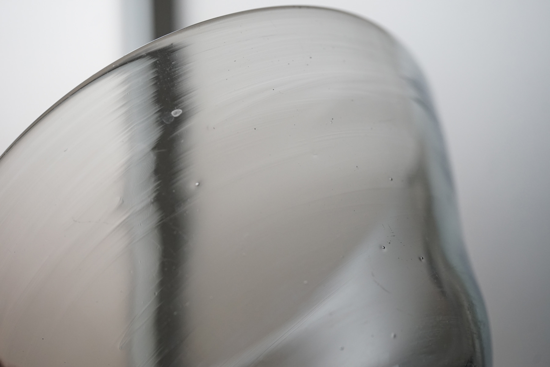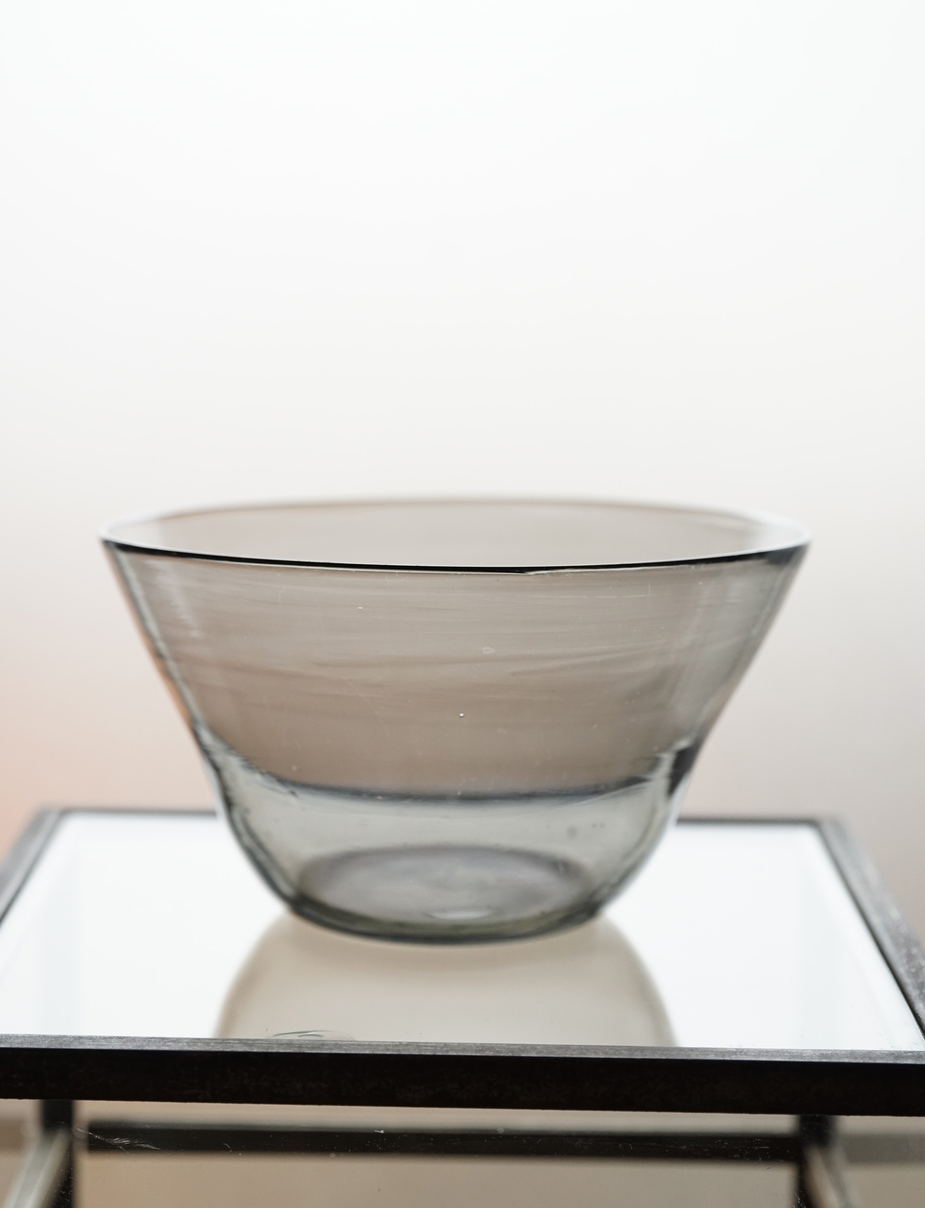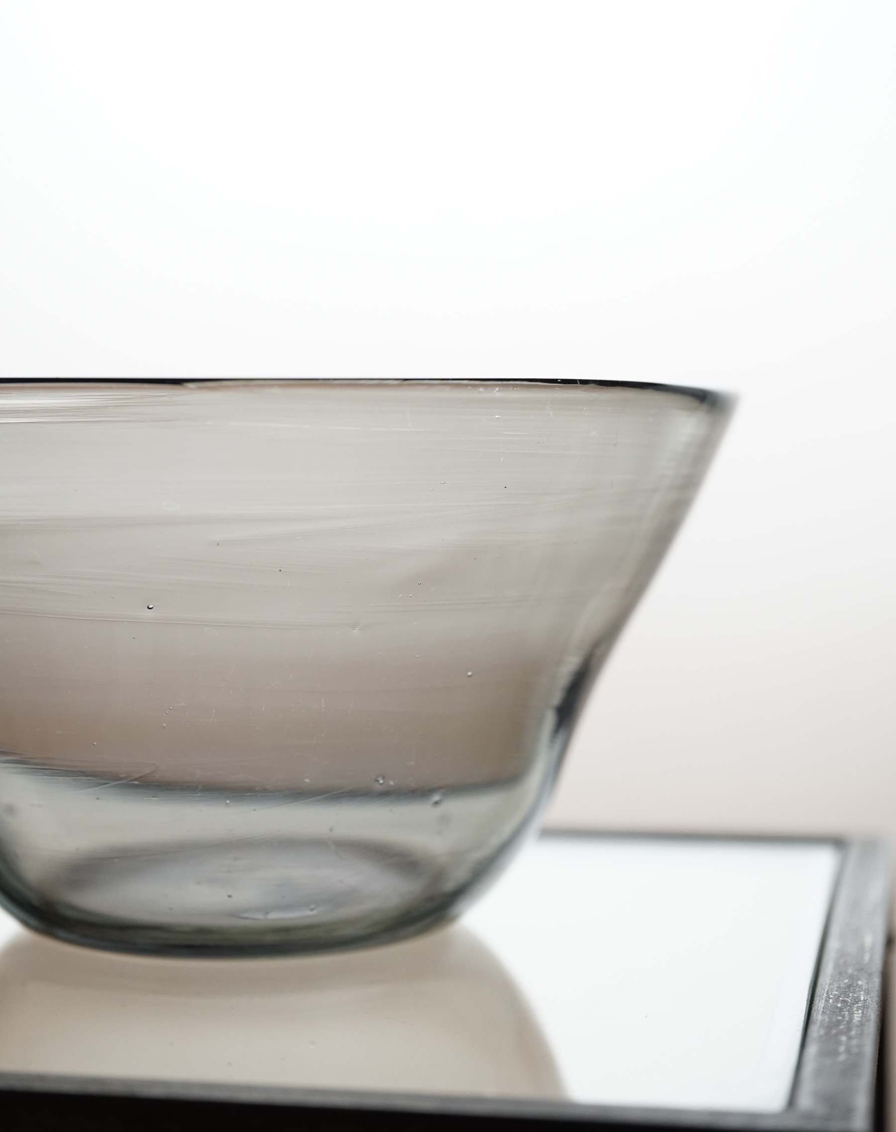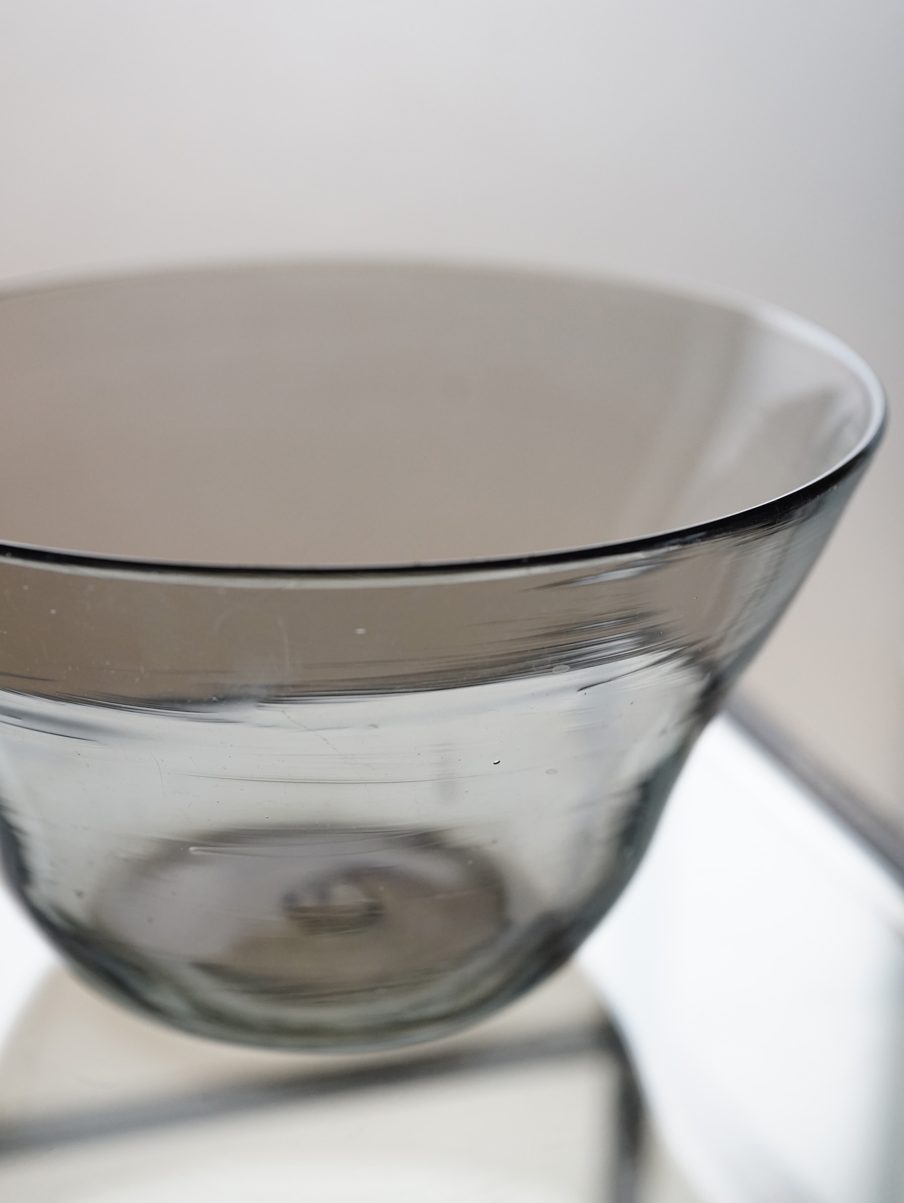 ぽってりとしたシンプルなグレーのガラスボウルはスウェーデンより。意図しているものなのか、ただ広げて軽く整えただけなのか分かりませんが、下半分はやや丸みがあり、上半分は直線的な広がりがあります。深さがあるので、両手で持つ時の手取りの良さに繋がっていると思います。底に小傷もあるので、捏ねたり混ぜたりとキッチン道具でもあったのかなと思います。