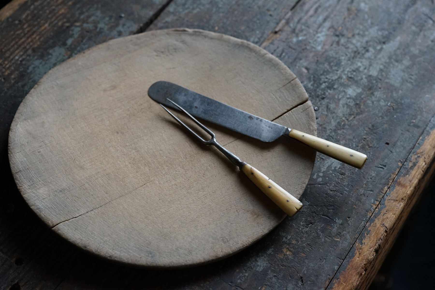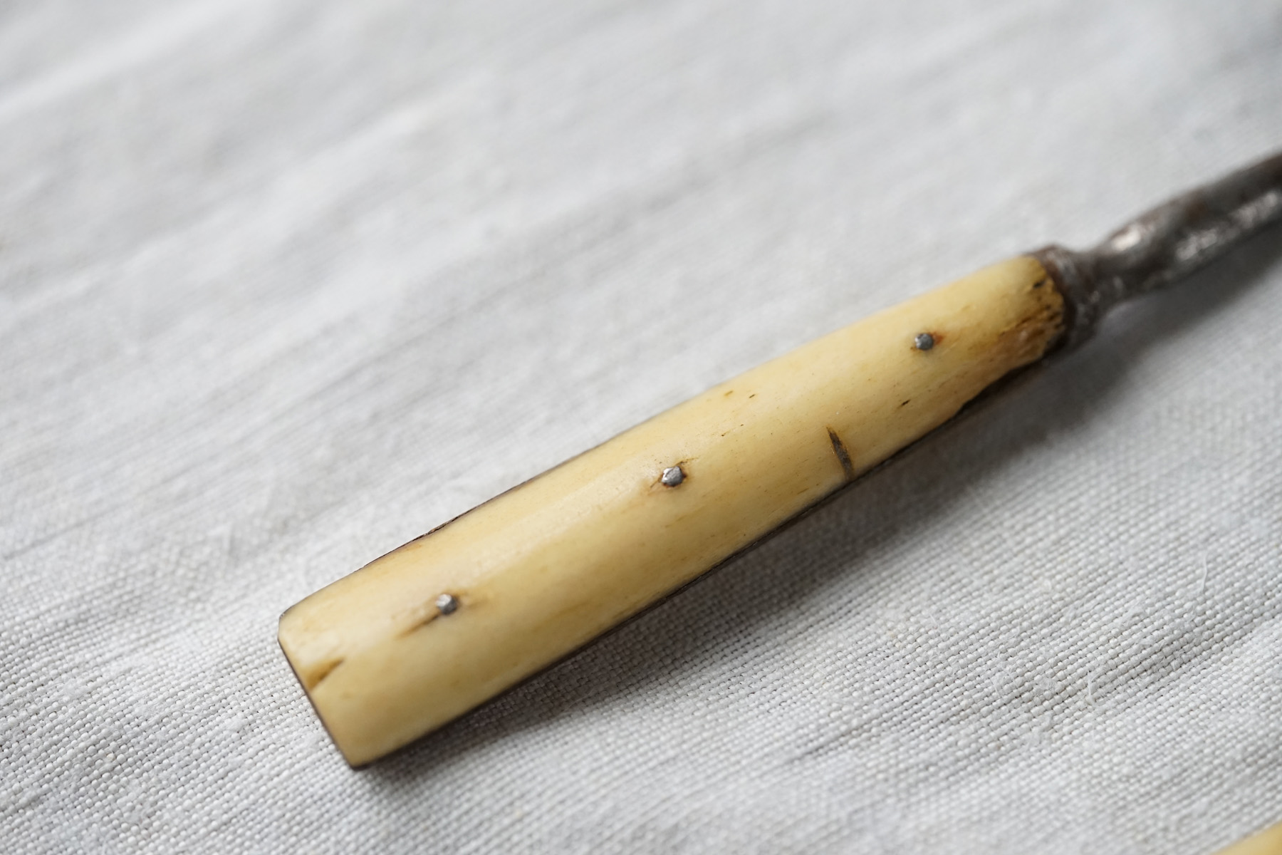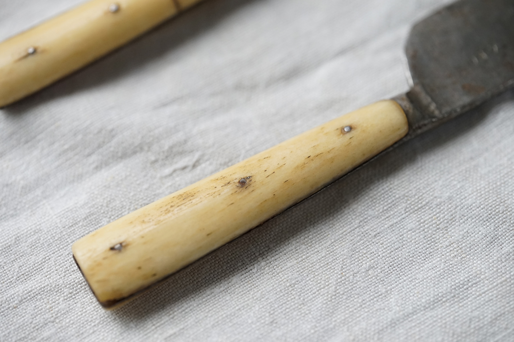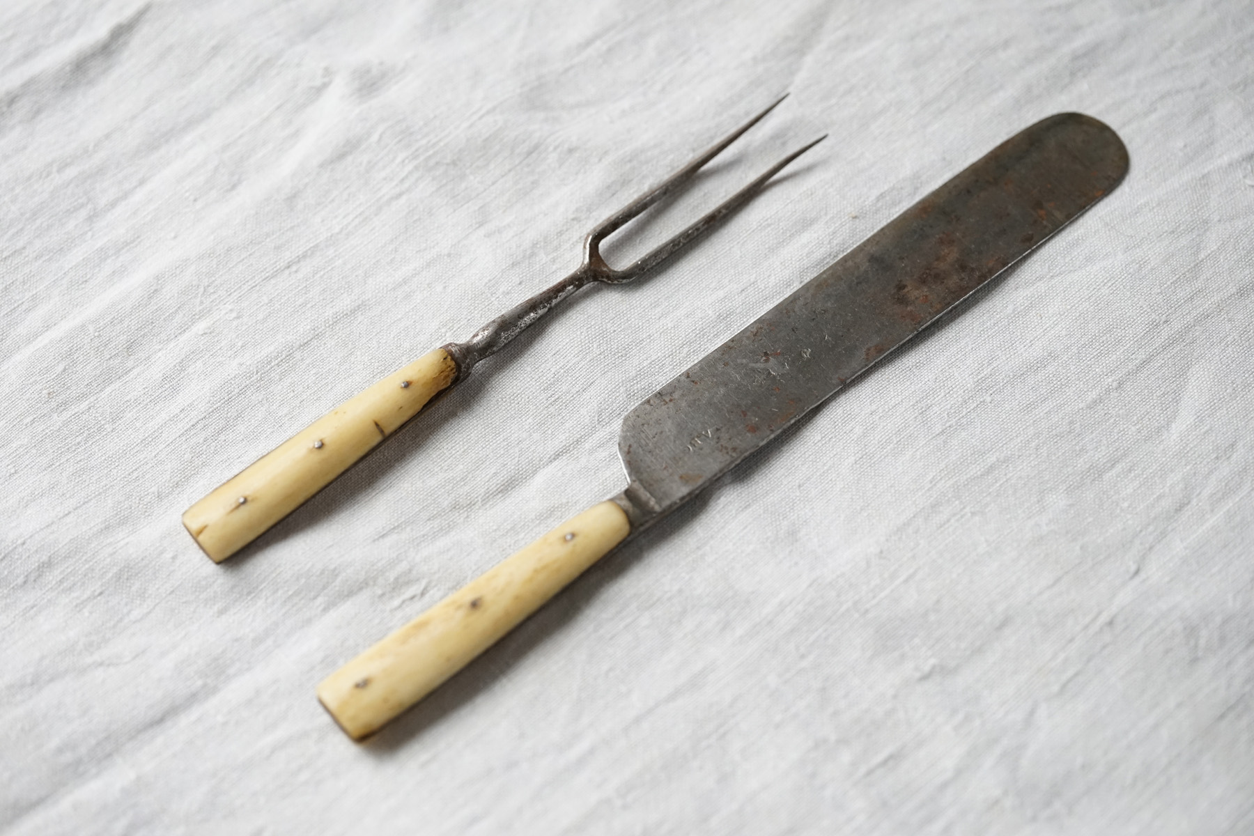 19世紀前半の初期のカトラリーはスウェーデンより。三叉になる前のフォーク(170mm)と小振りなホーンハンドル。ナイフ(225mm)のアンバランスさがなんとも愛らしい。在庫複数ございます。