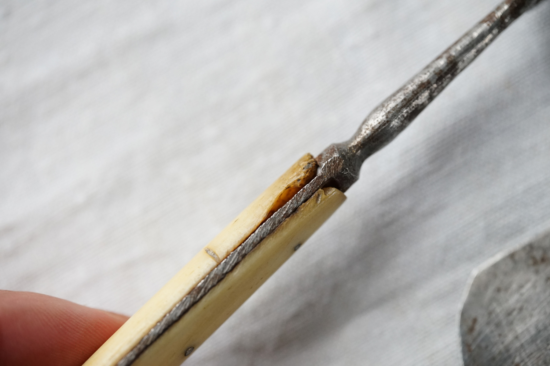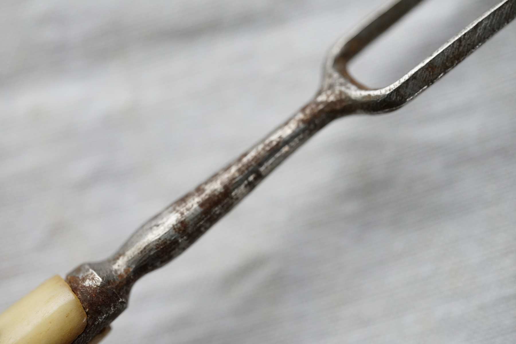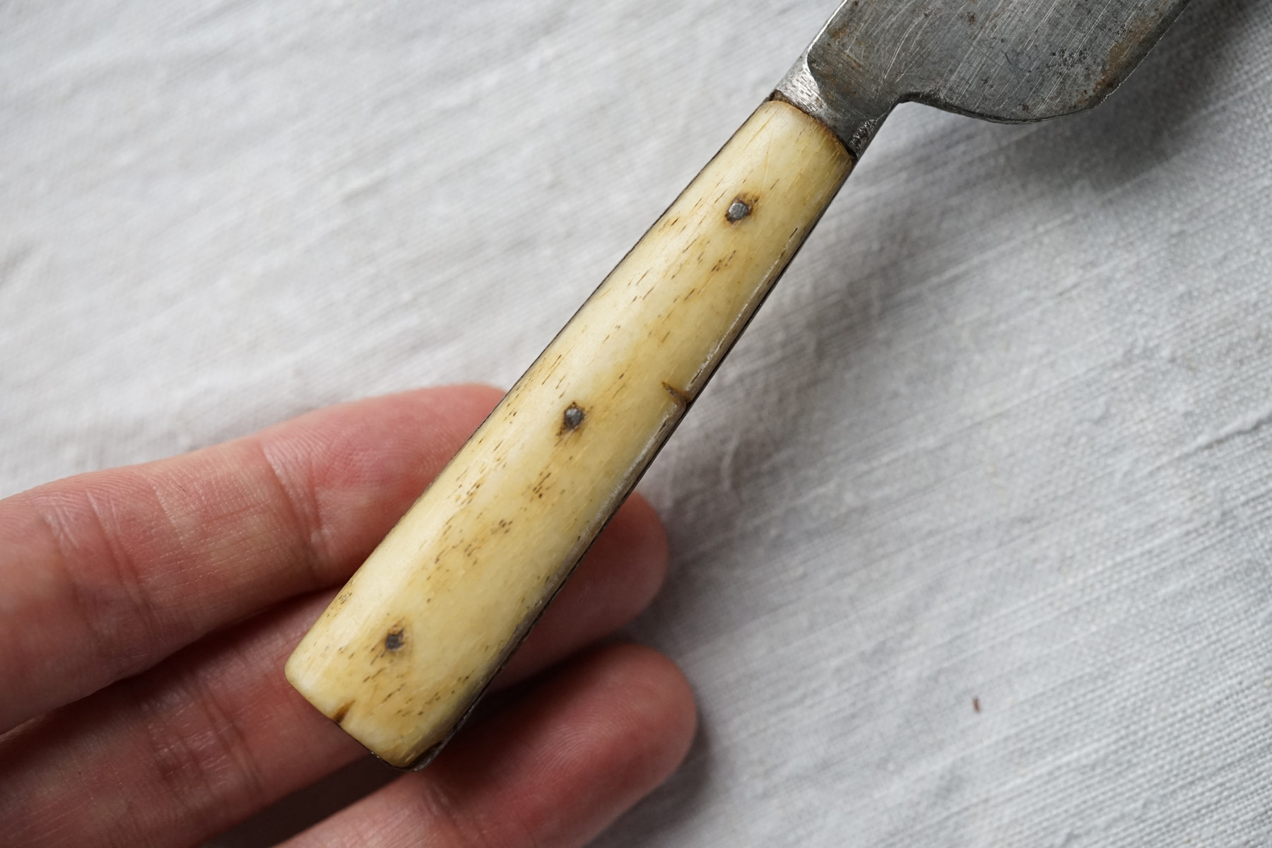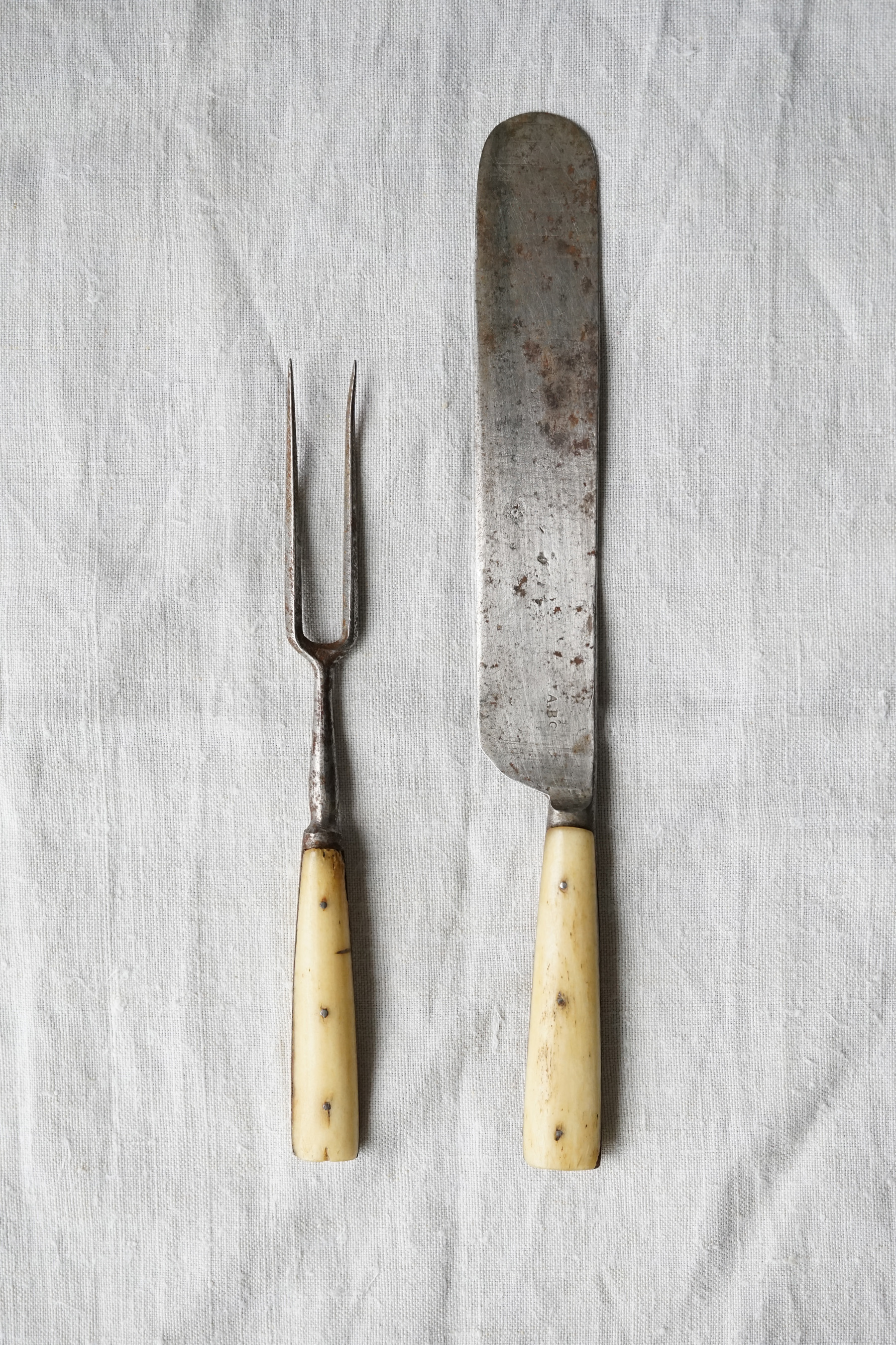 19世紀前半の初期のカトラリーはスウェーデンより。三叉になる前のフォーク(170mm)と小振りなホーンハンドル。ナイフ(225mm)のアンバランスさがなんとも愛らしい。在庫複数ございます。