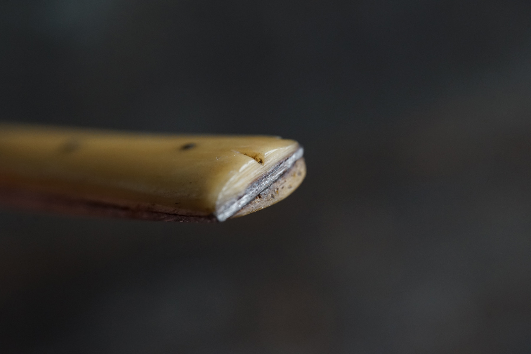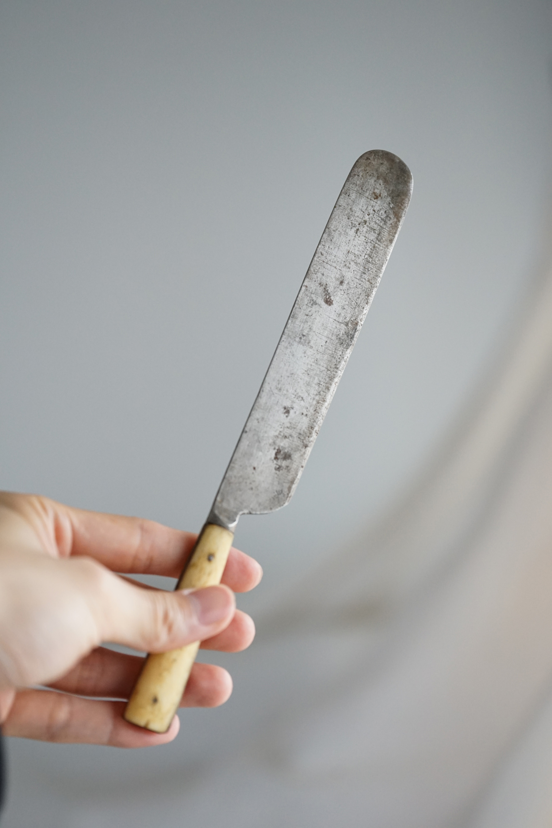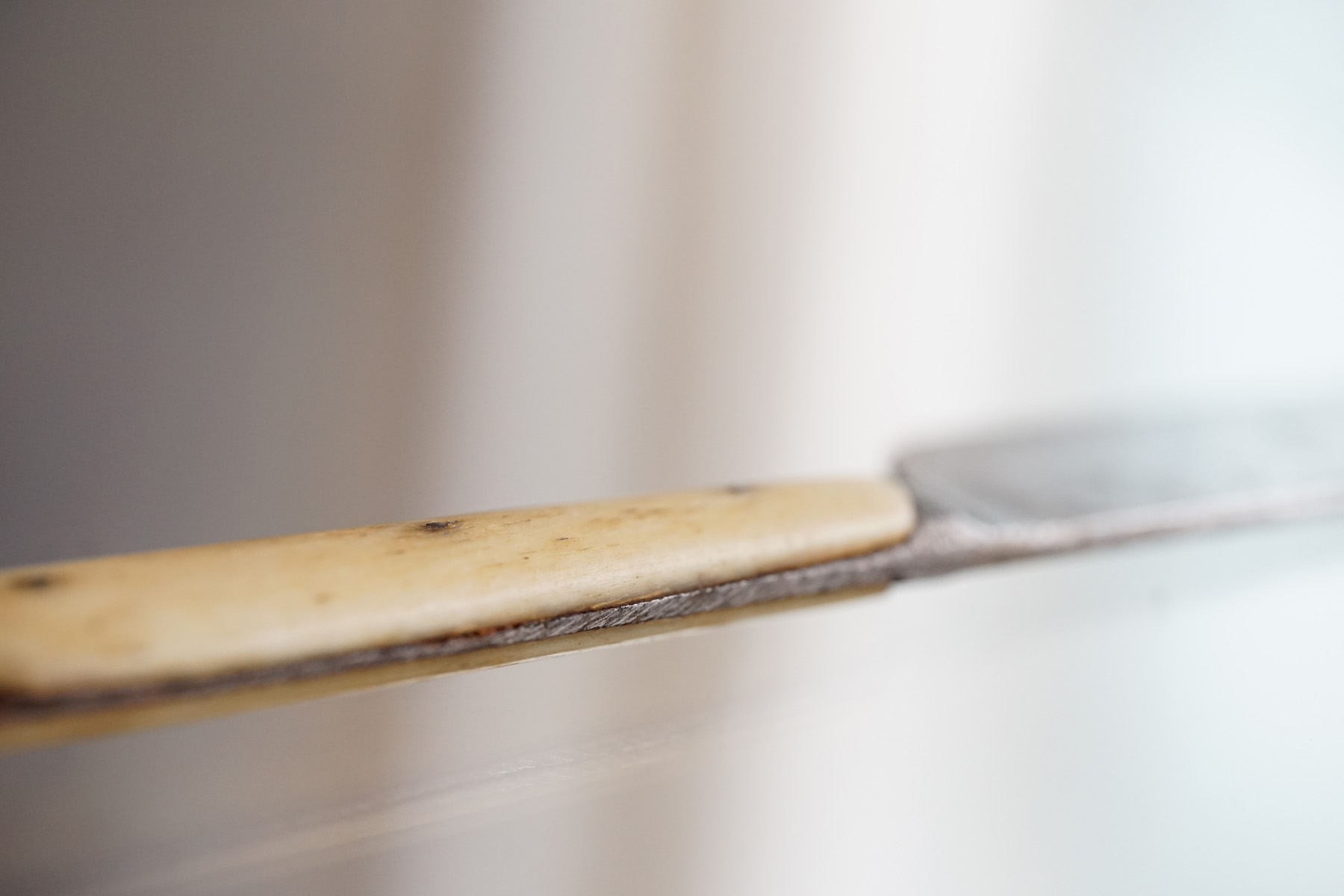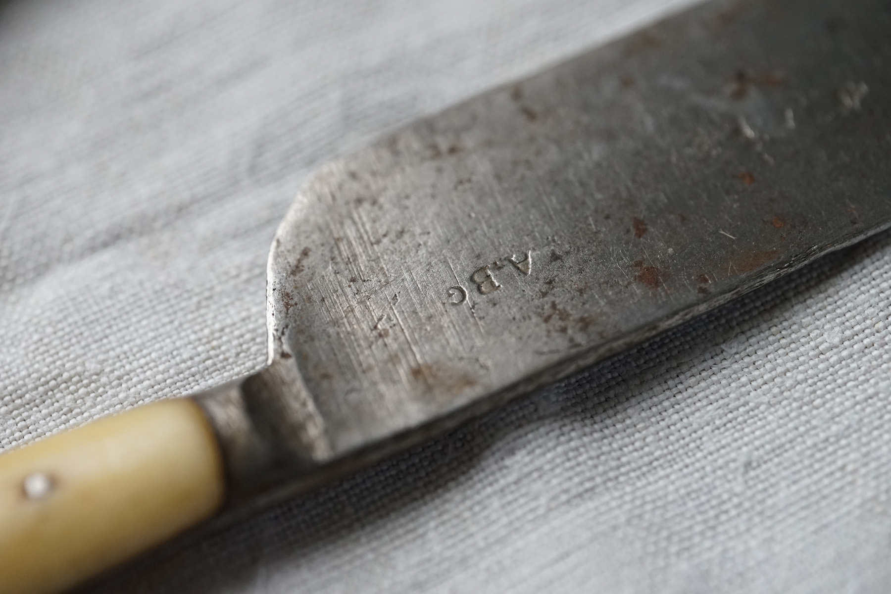 19世紀前半の初期のカトラリーはスウェーデンより。三叉になる前のフォーク(170mm)と小振りなホーンハンドル。ナイフ(225mm)のアンバランスさがなんとも愛らしい。在庫複数ございます。