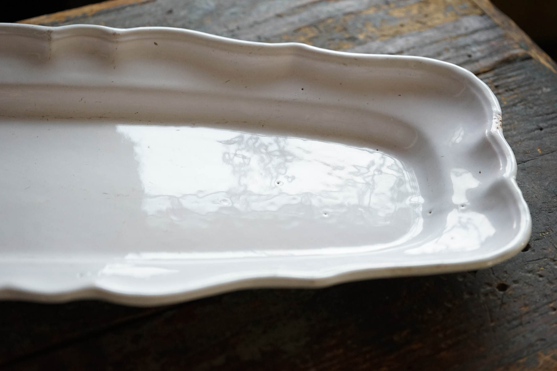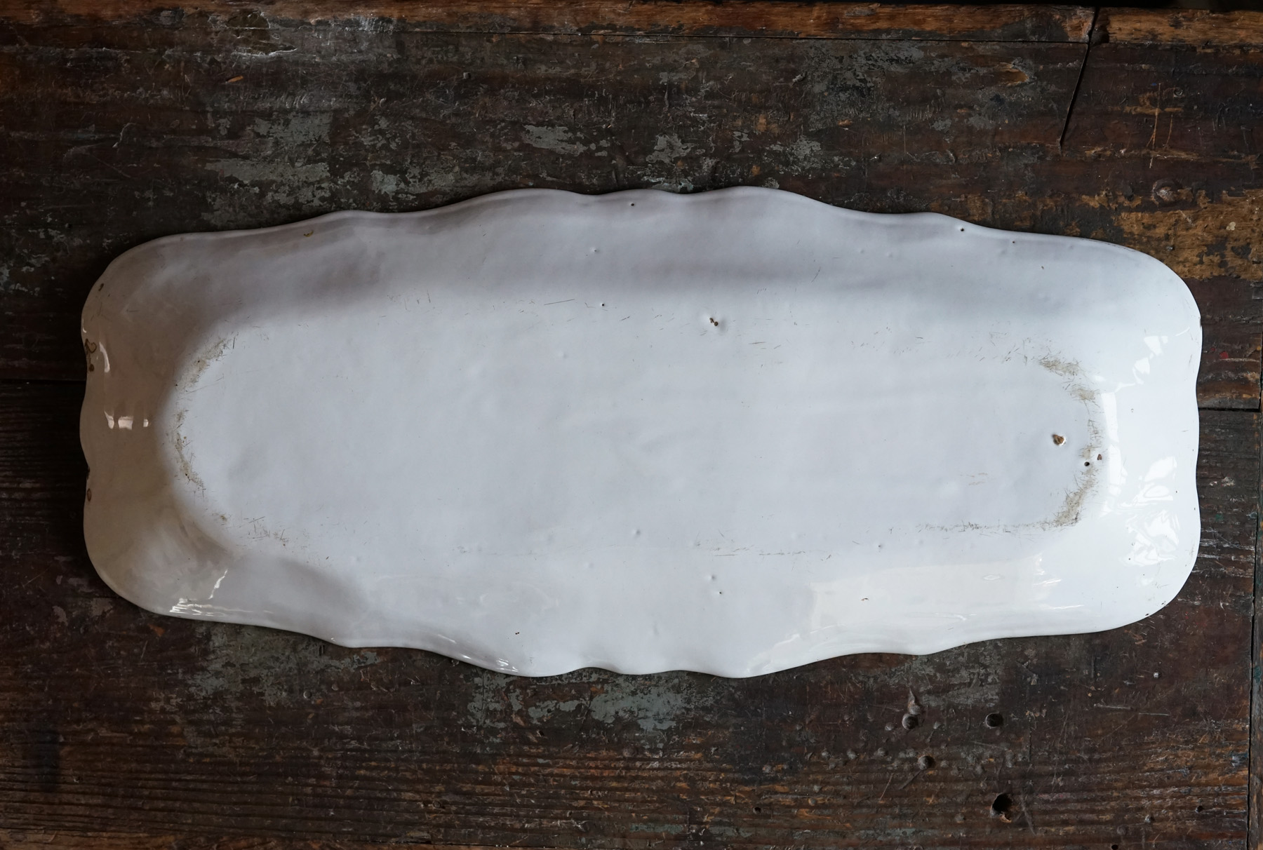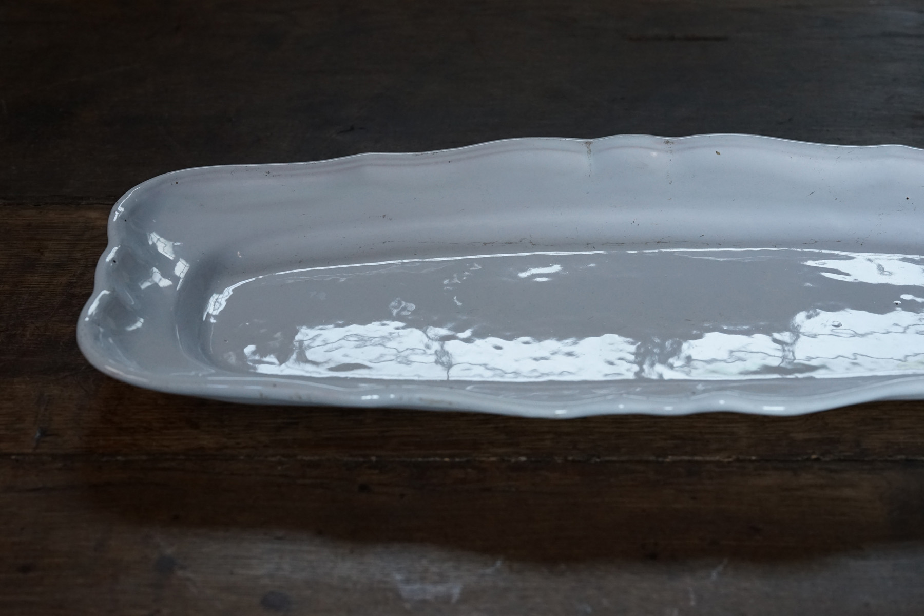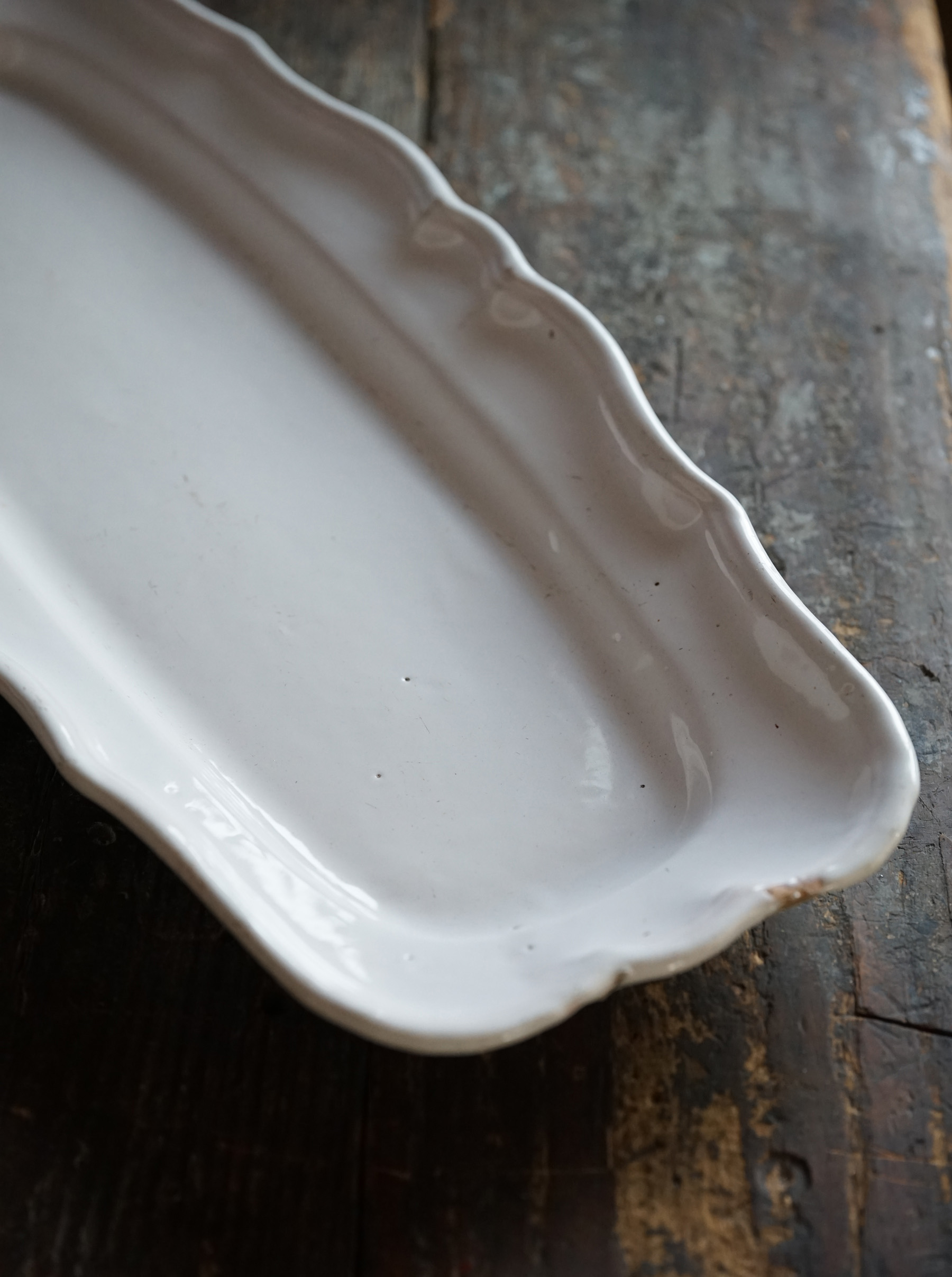 こちらもとても稀少なファイアンスの魚皿。和食器には無いスケール感の器。とろけるような白錫釉。