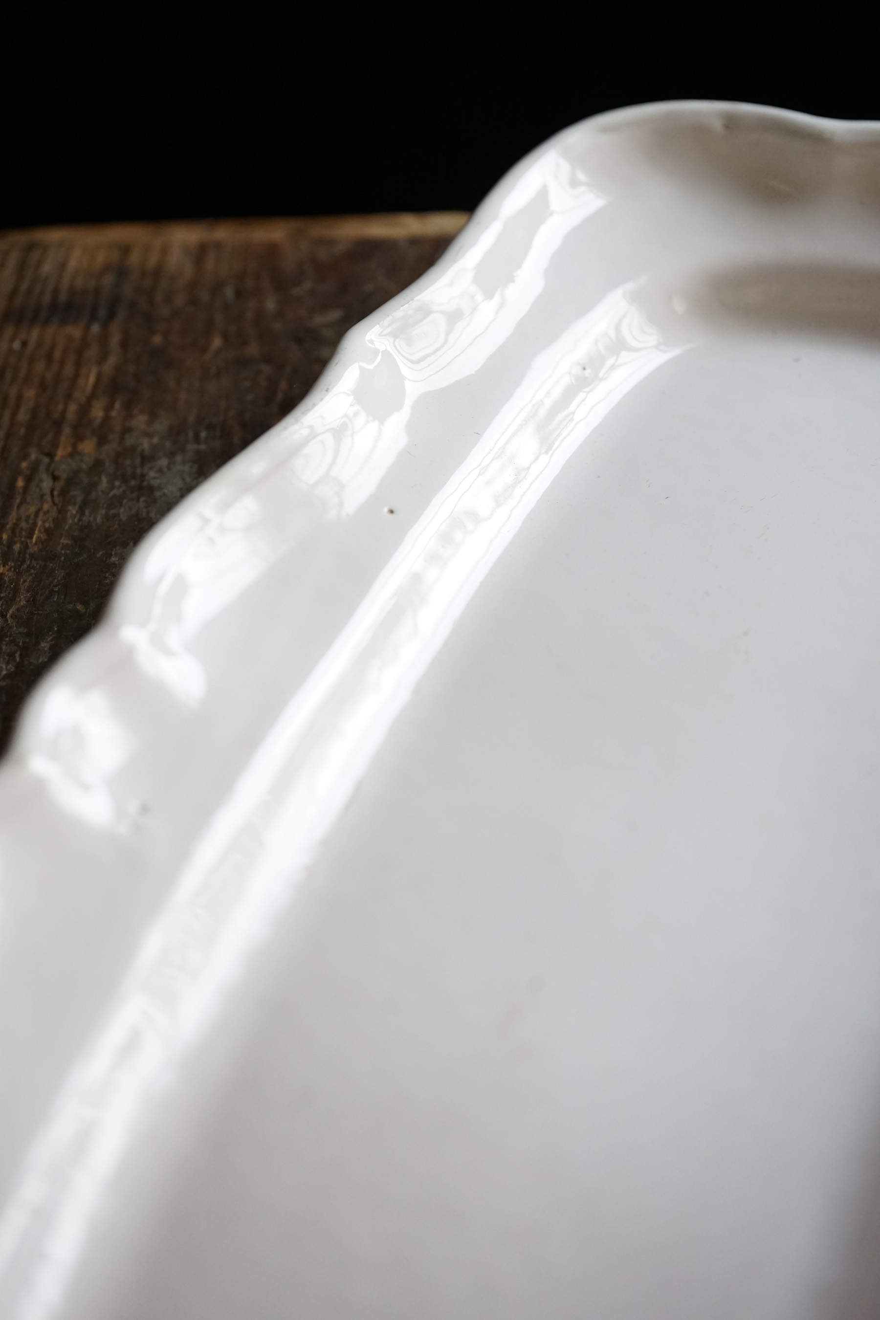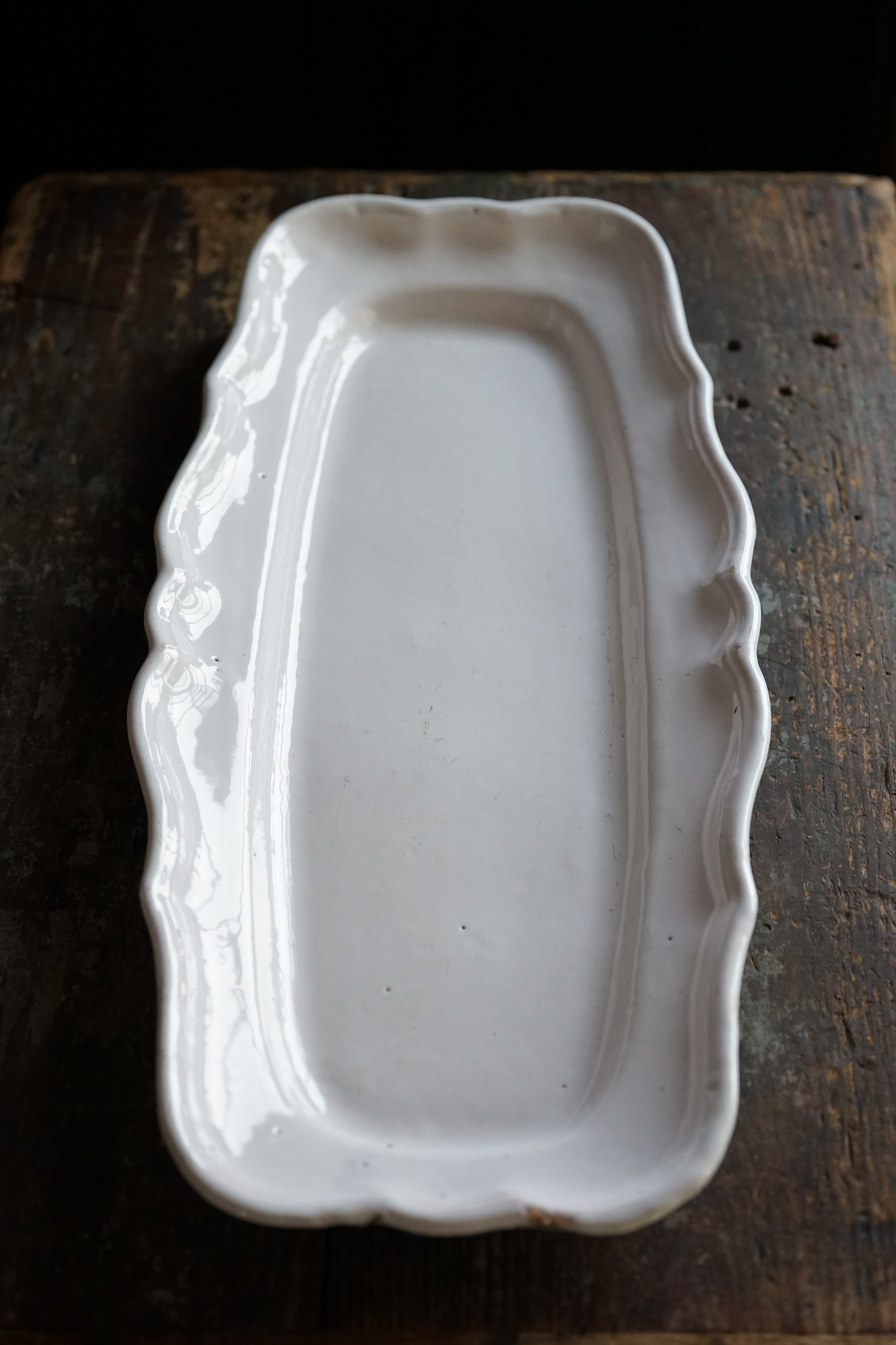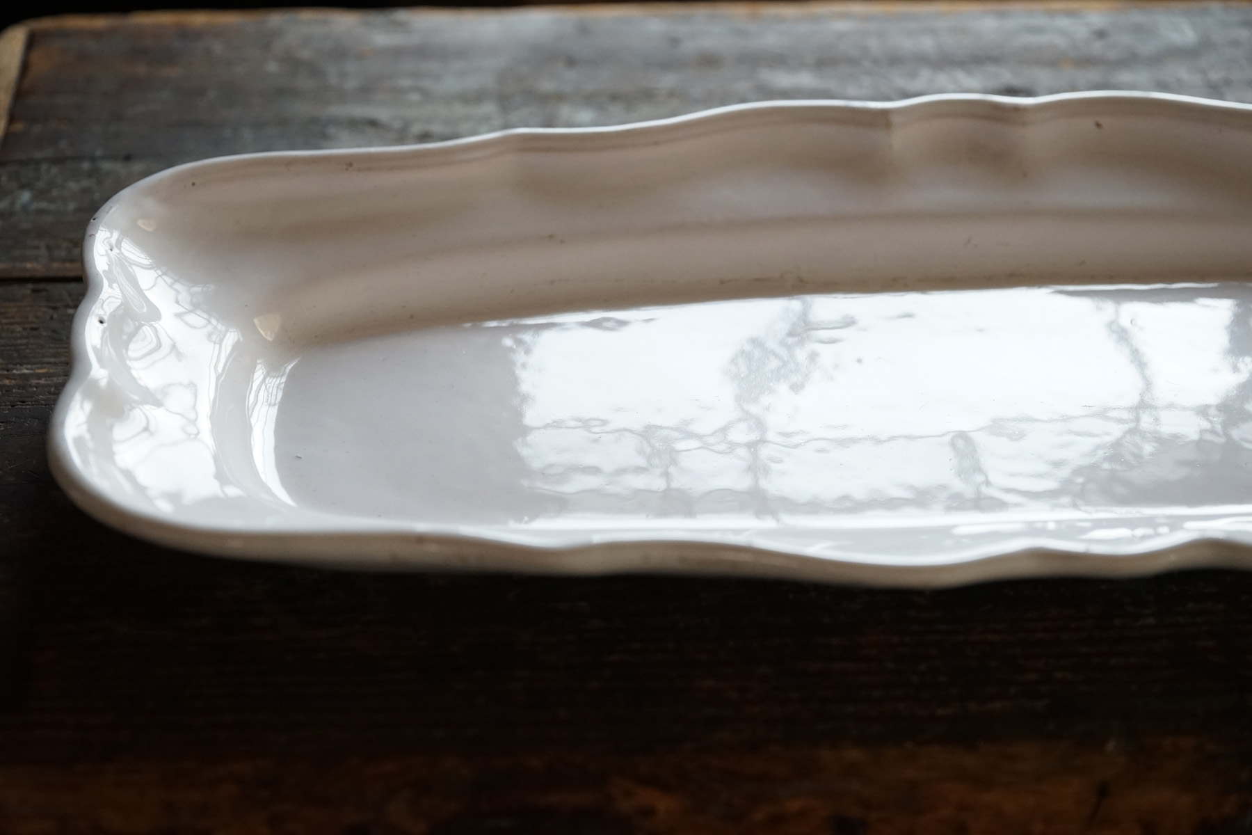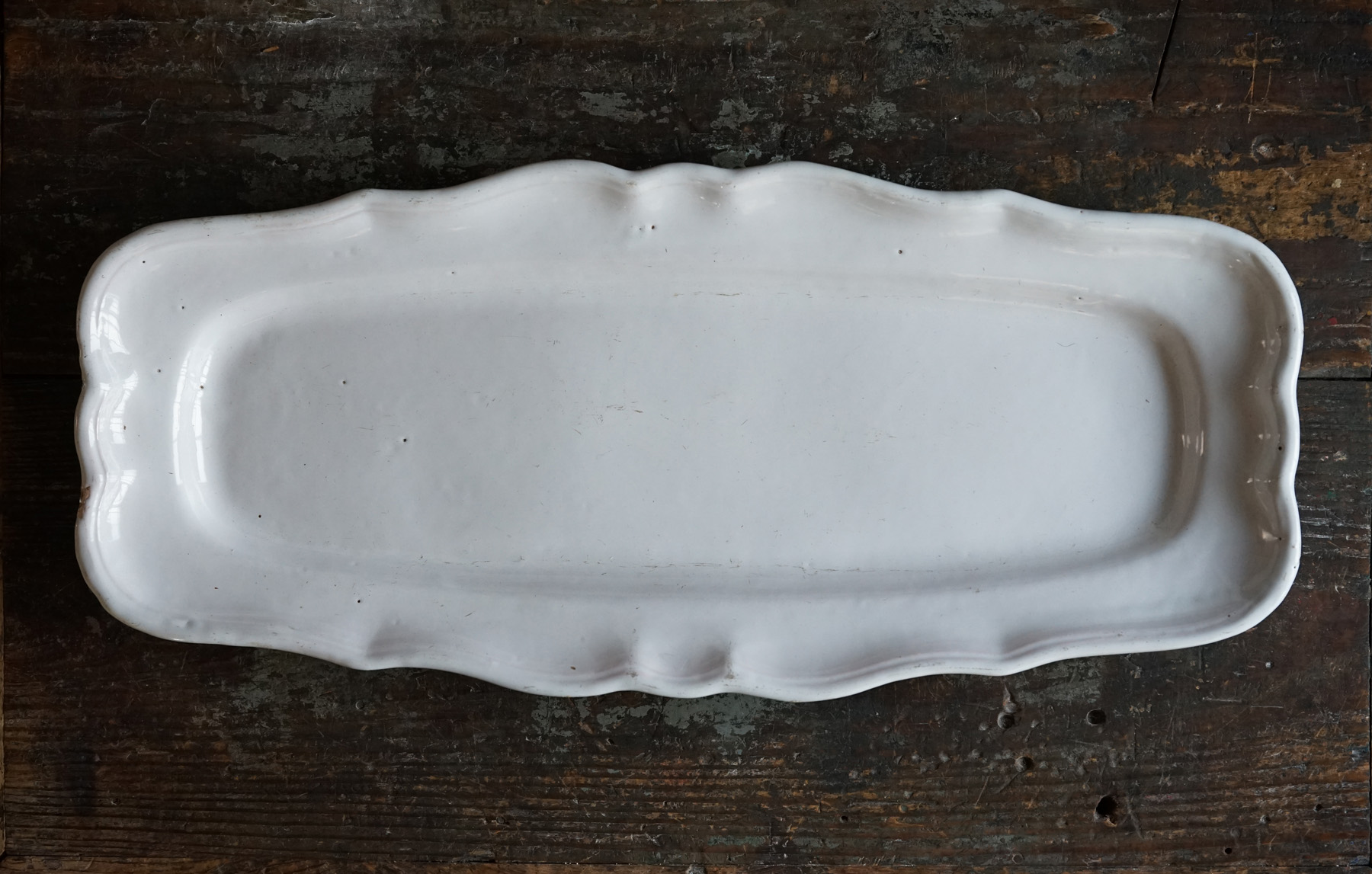こちらもとても稀少なファイアンスの魚皿。和食器には無いスケール感の器。とろけるような白錫釉。