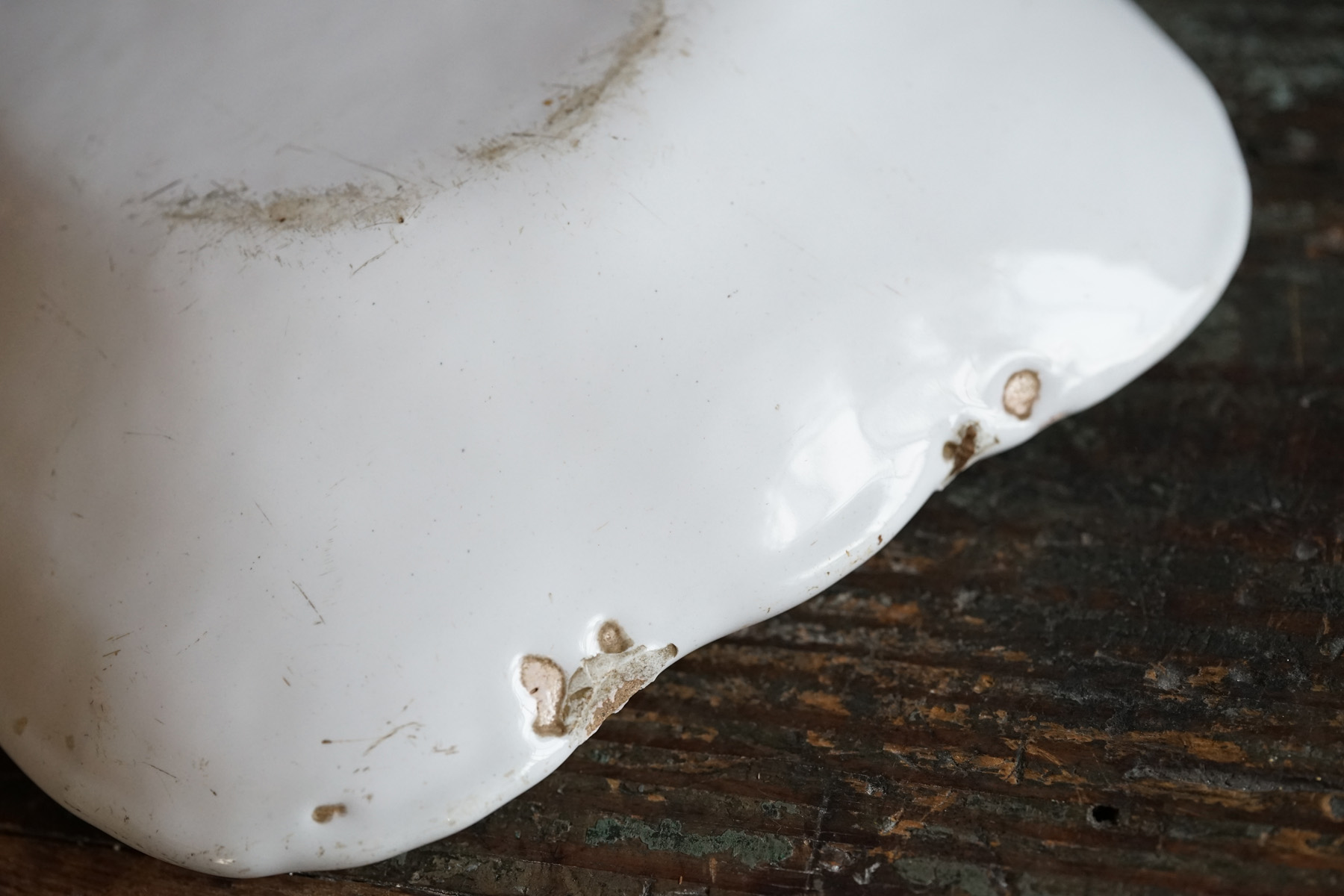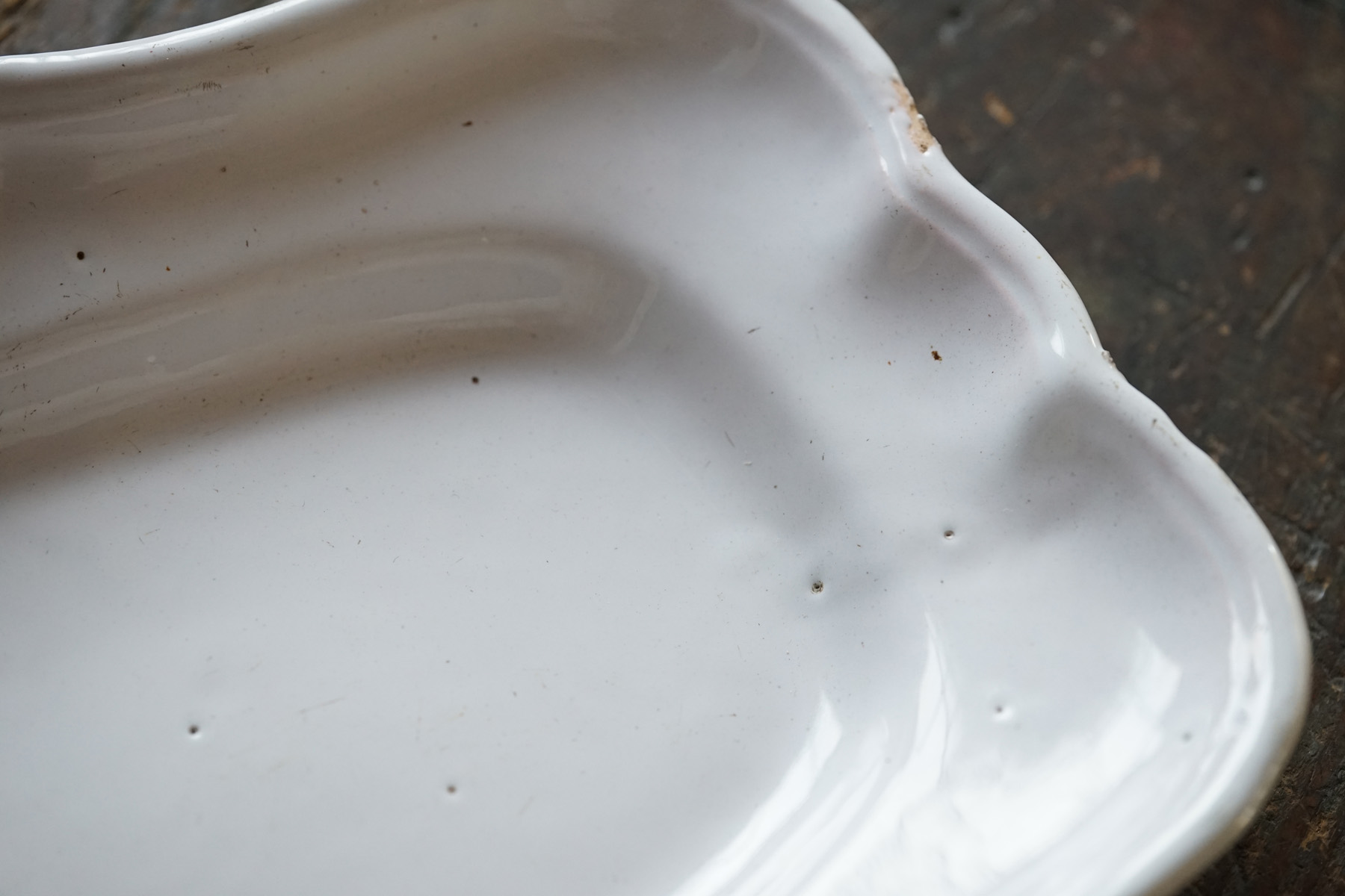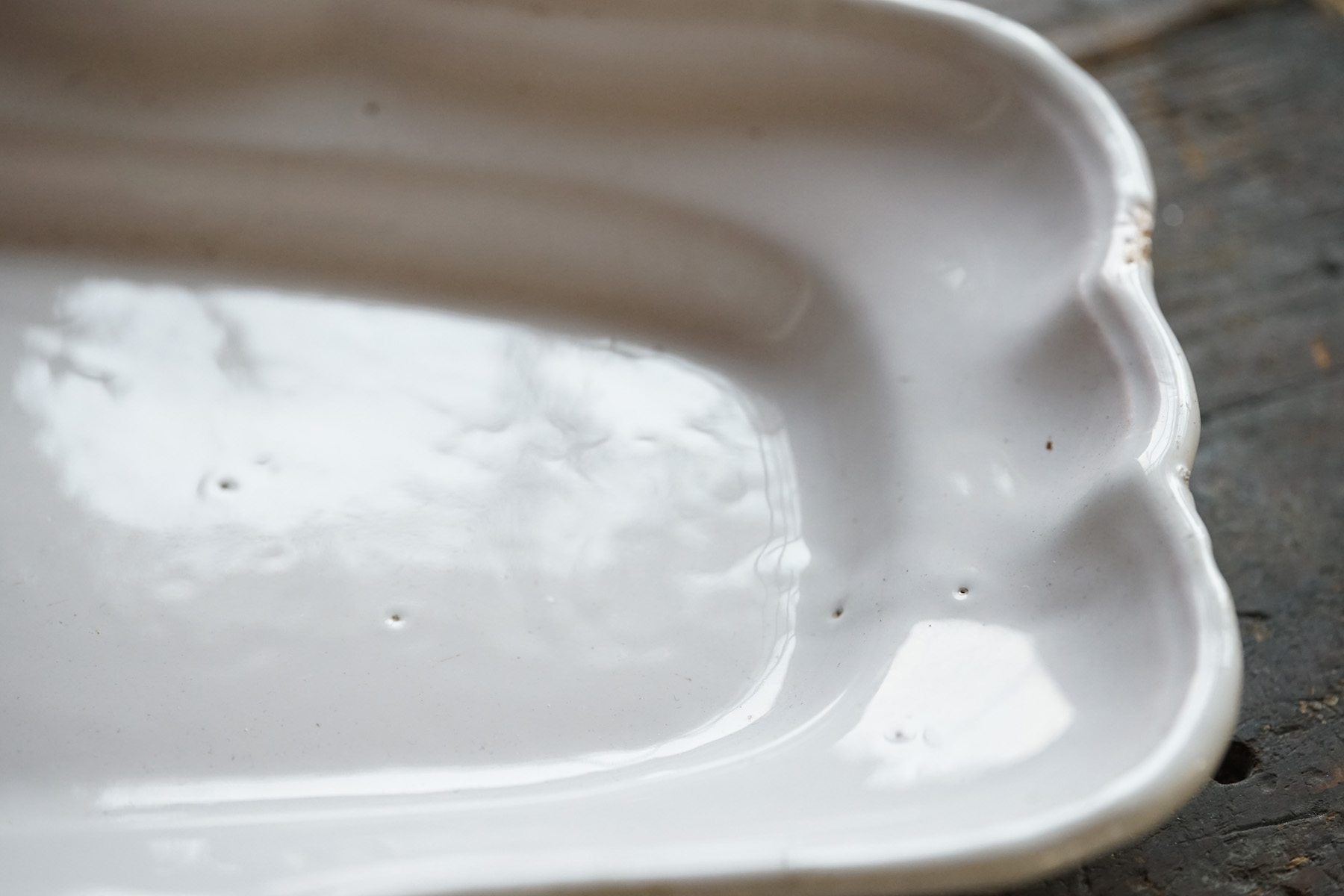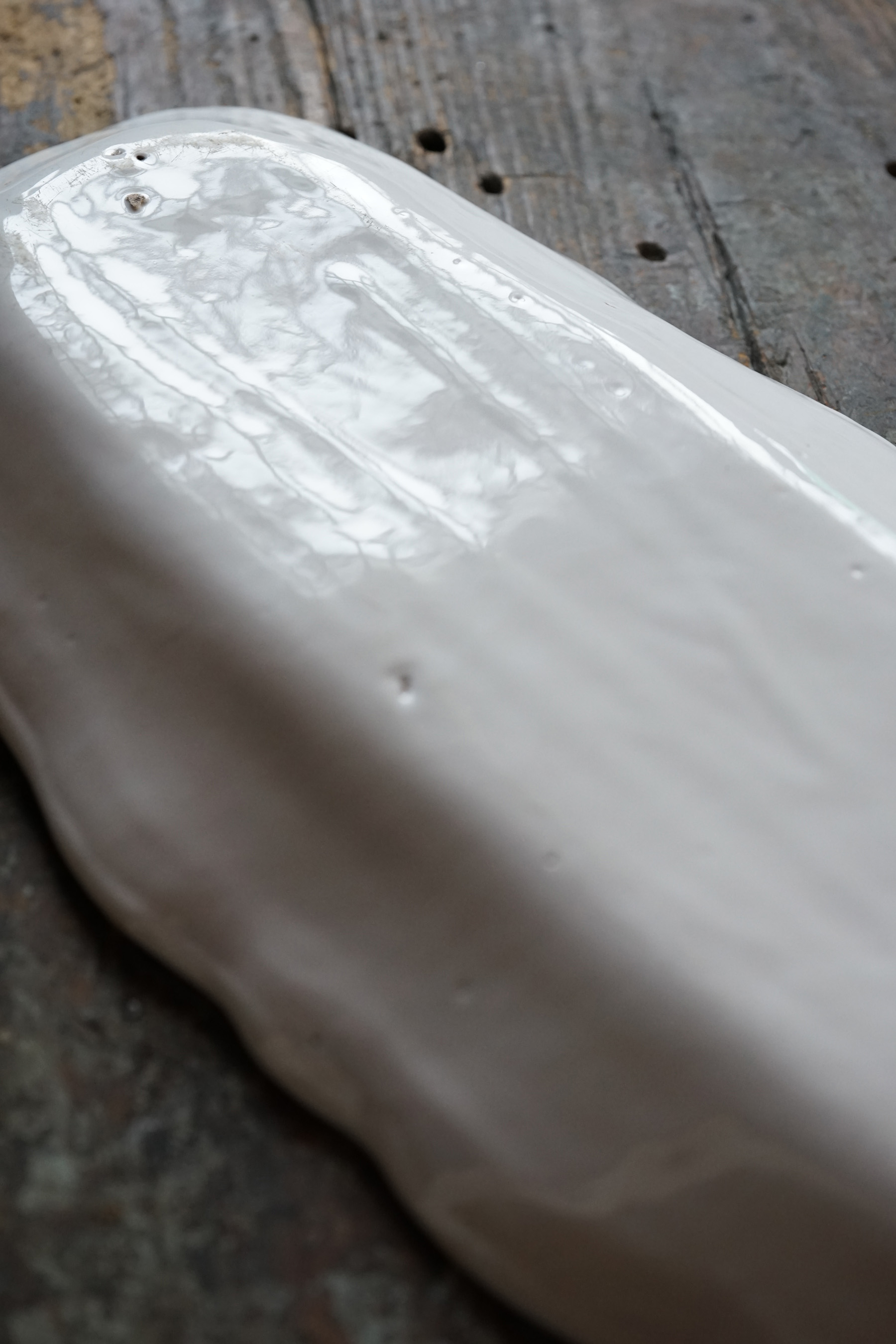 こちらもとても稀少なファイアンスの魚皿。和食器には無いスケール感の器。とろけるような白錫釉。