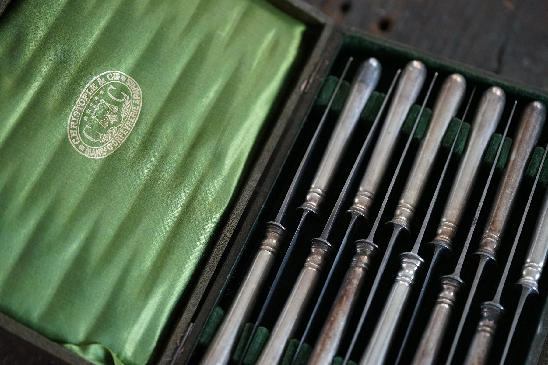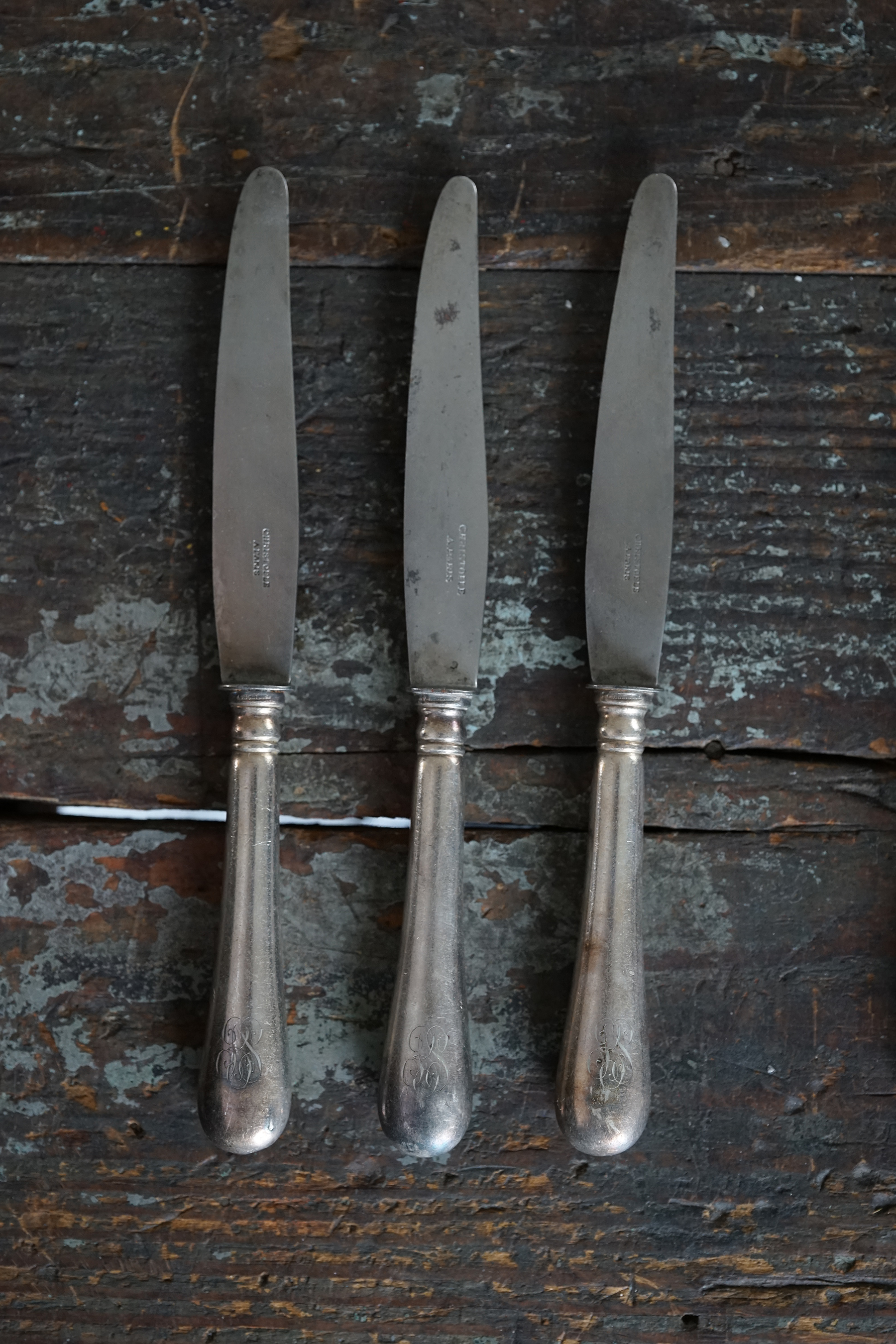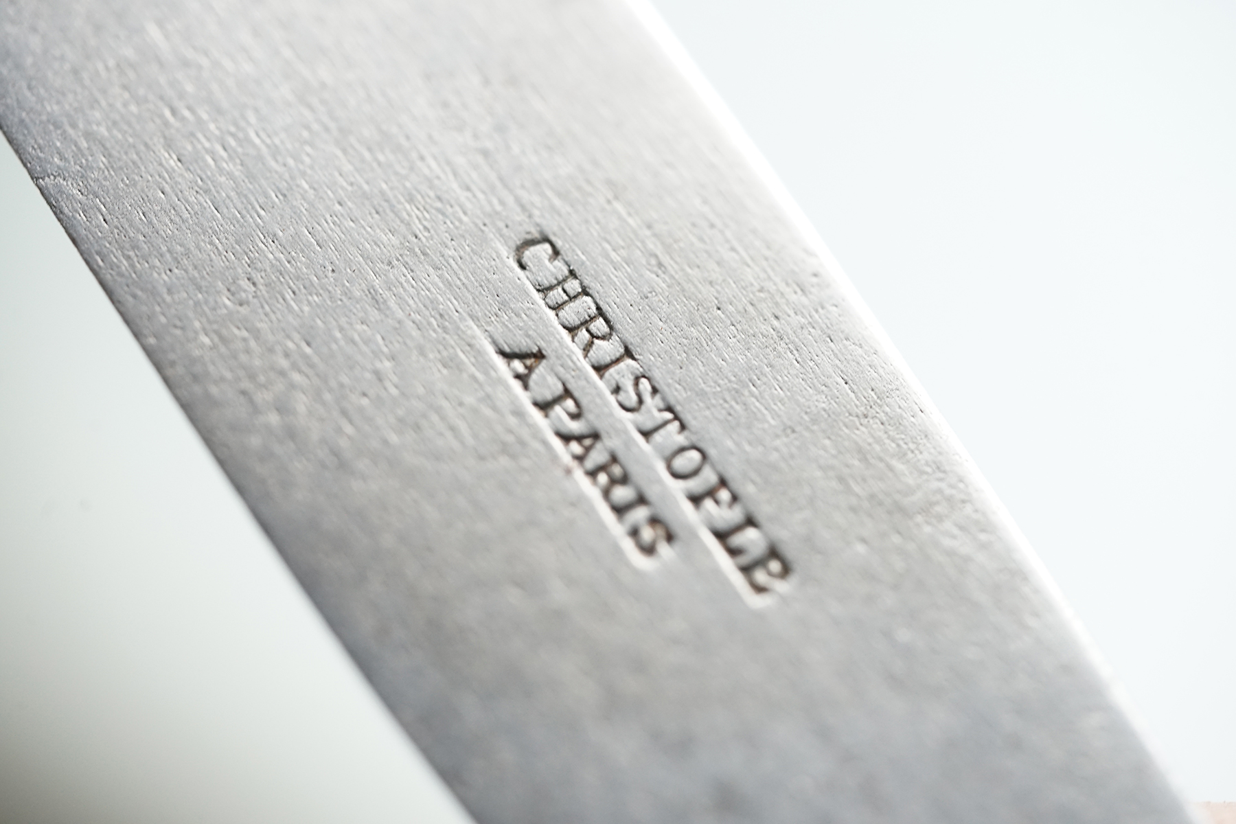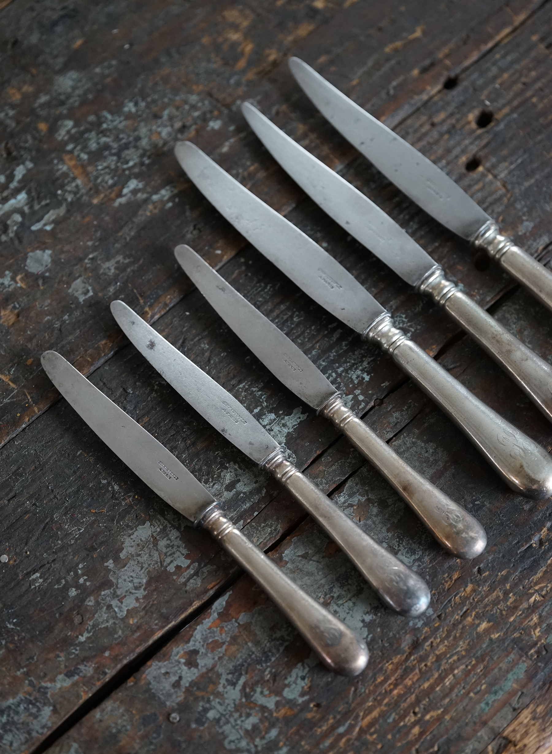 なかなか見つけられないクリストフルの古手のナイフです。取手はシルバープレート、刃は鋼です。 包丁と同じように研げばスパッと切れるかと思います。