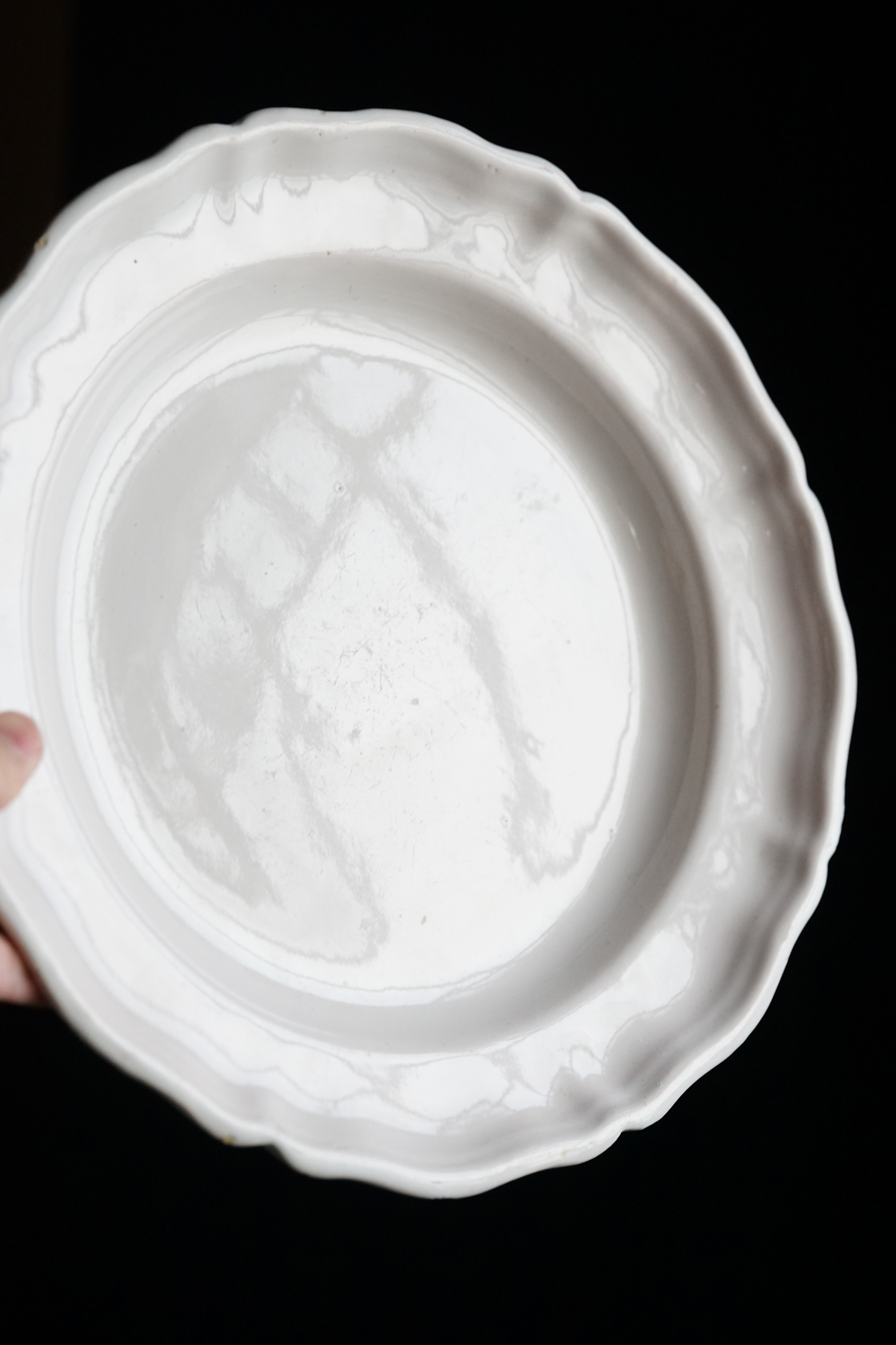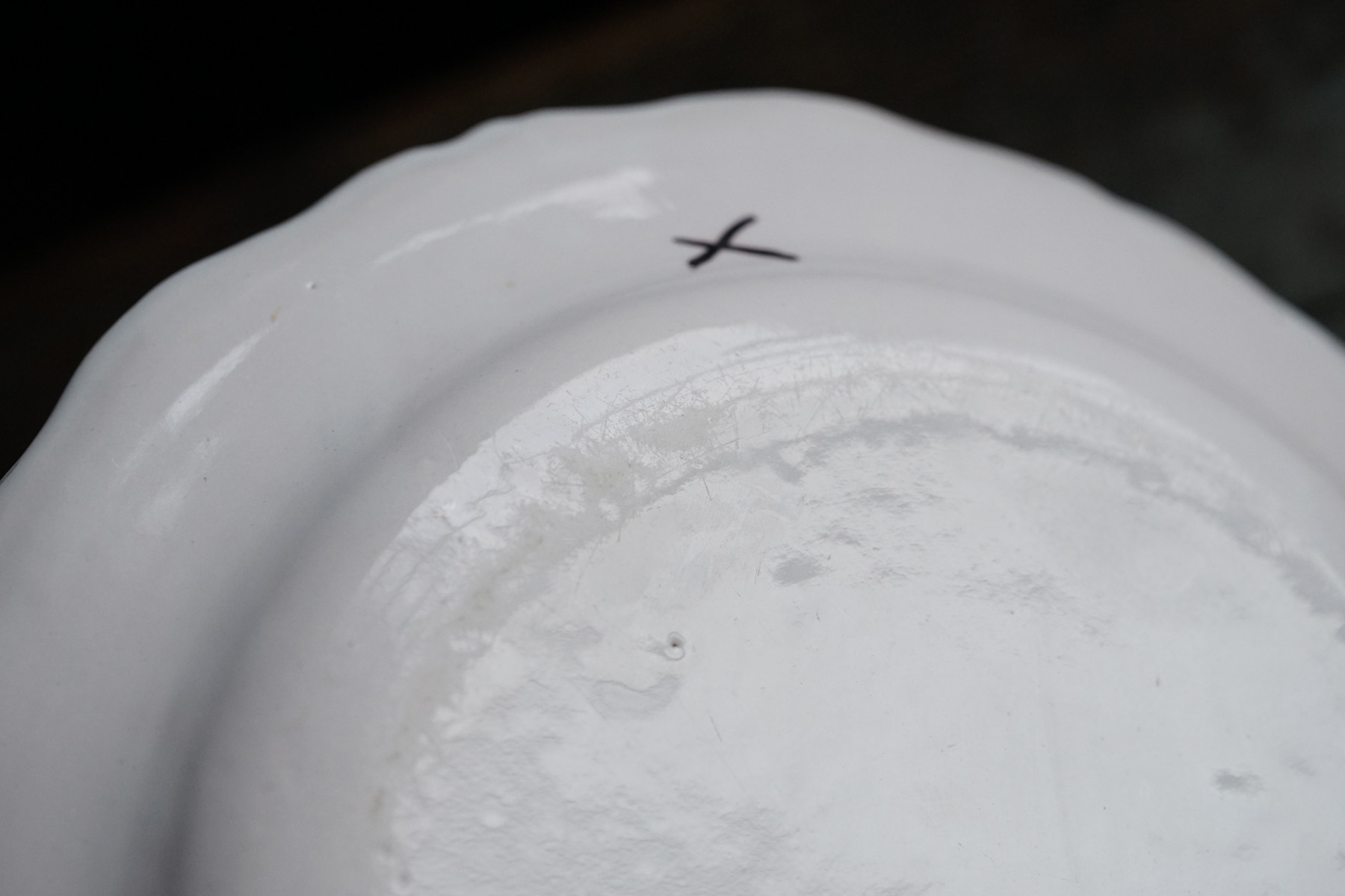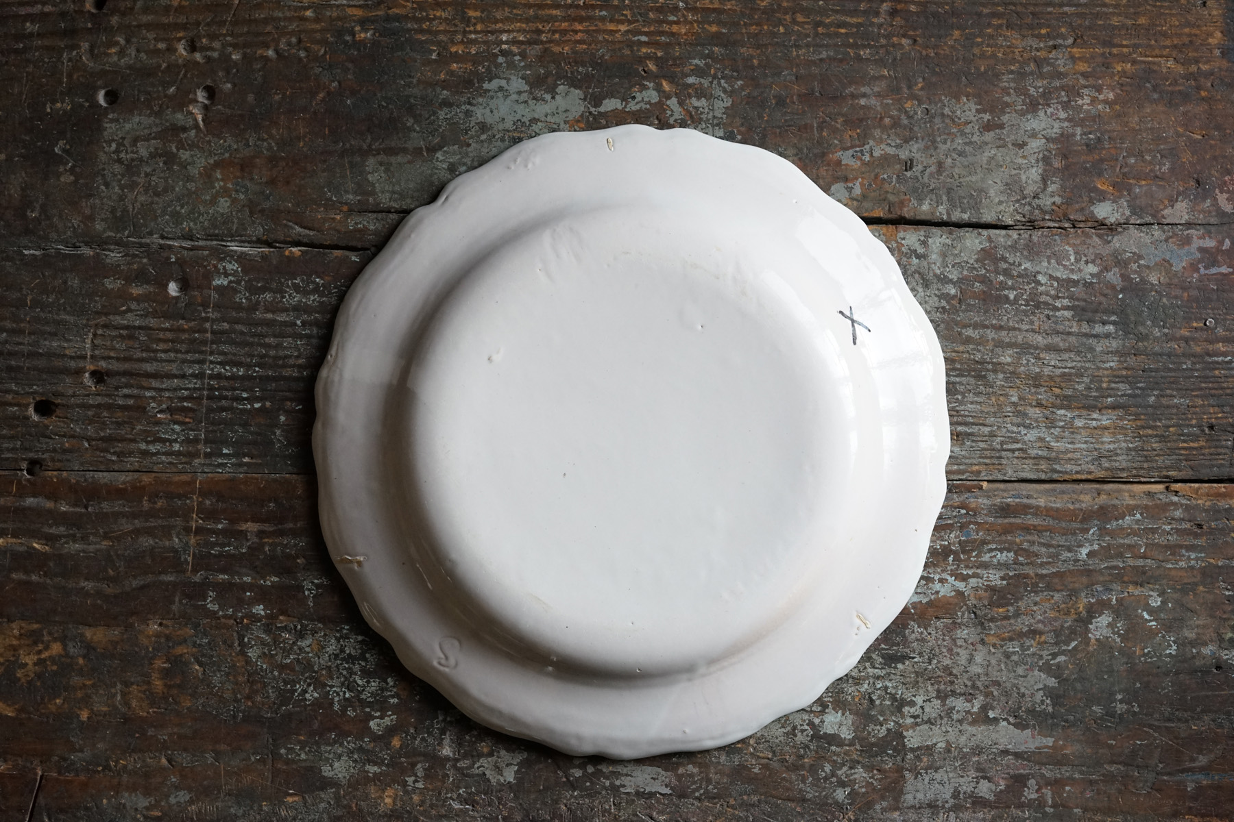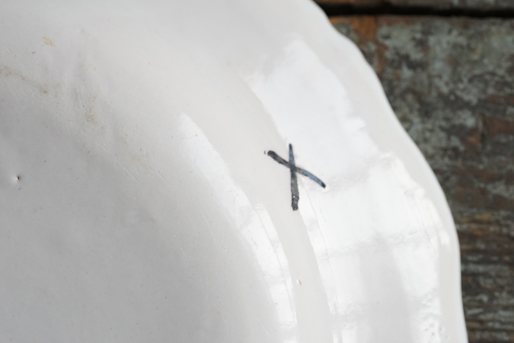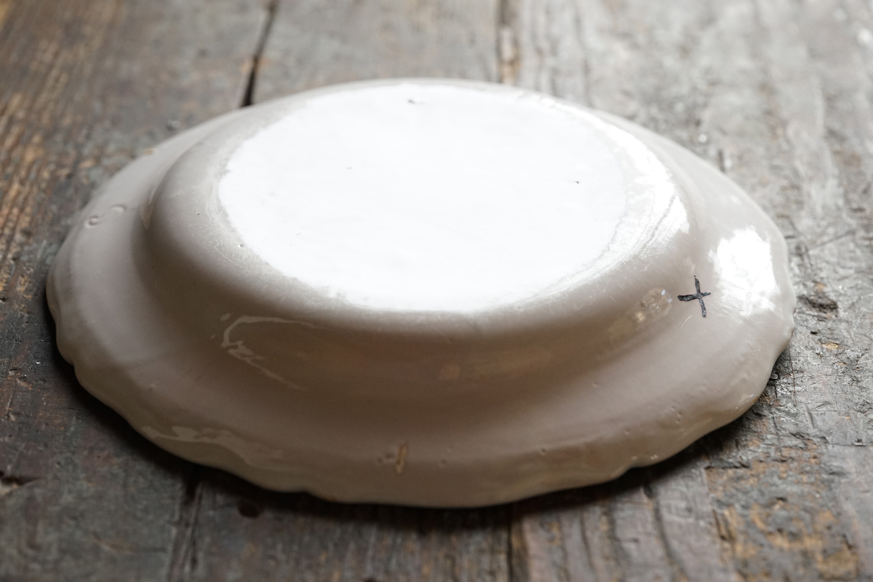 美しい白錫釉。柔らかで、品のある大皿。時代から見ると大変状態良いです。18世紀の十字印。チップや使用キズ等はございます。