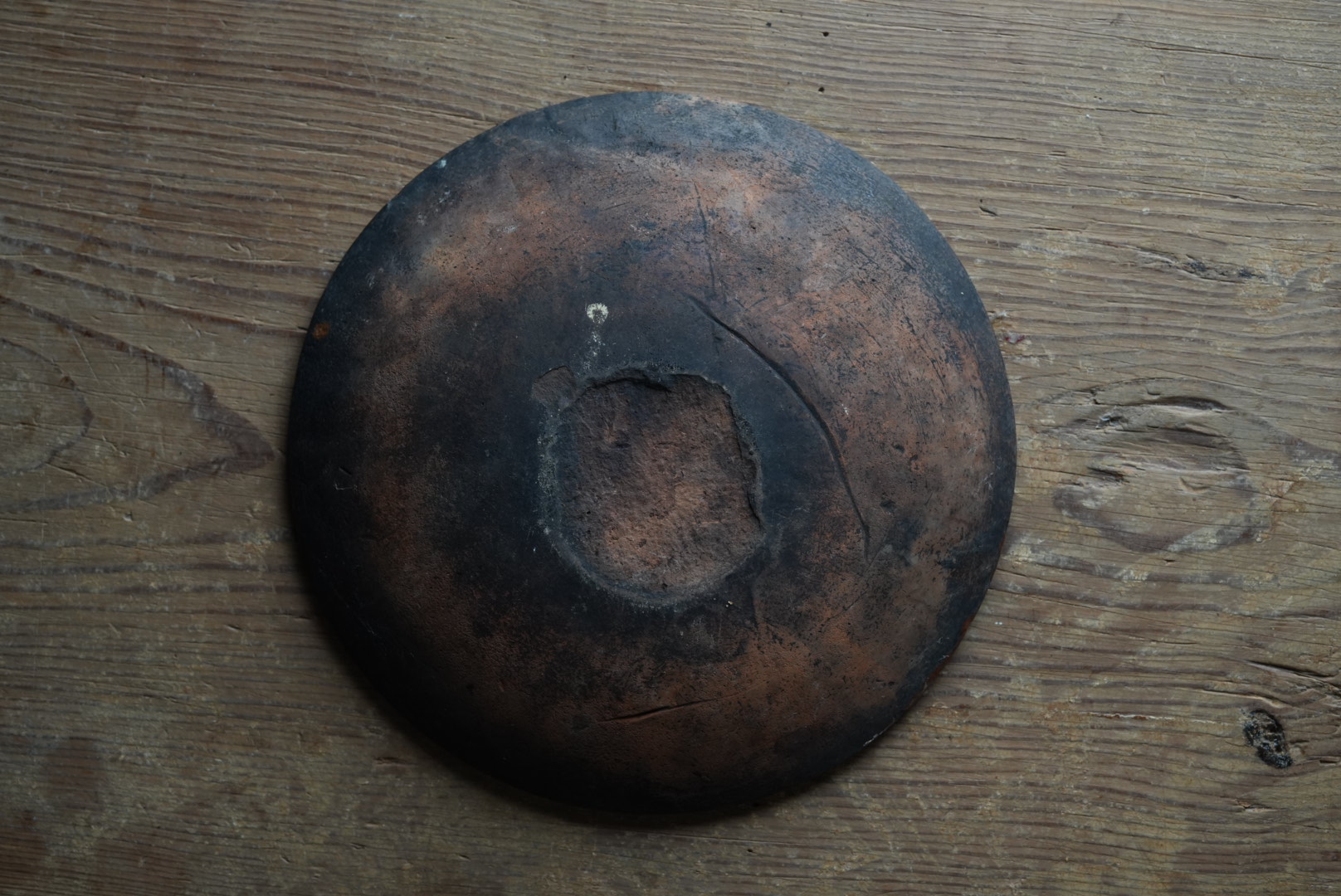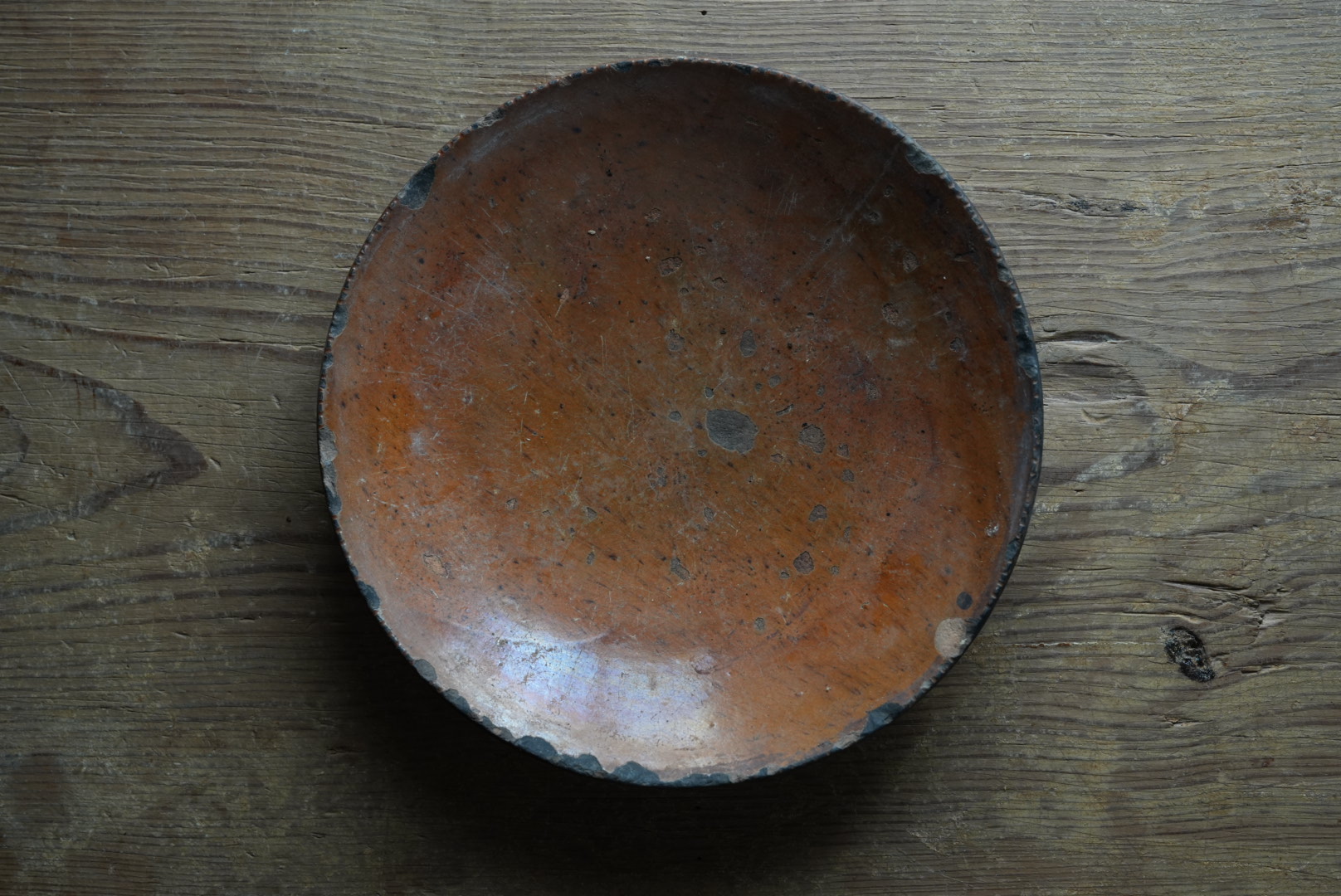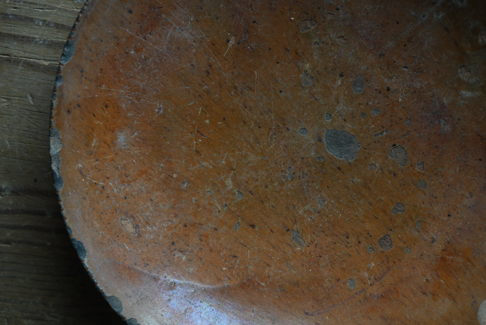 使い込まれた程よいサイズの丸皿。 アメリカ北東部ペンシルベニアのレッドウェアのパイ皿です。 落ち着いた風合いの色調に、裏の表情も美しいです。 アーミッシュも住むランカスターのもので、落ち着いた雰囲気は和食にも合う器と思います。 使われてきた古いものですので欠けや使用キズ等はございます。