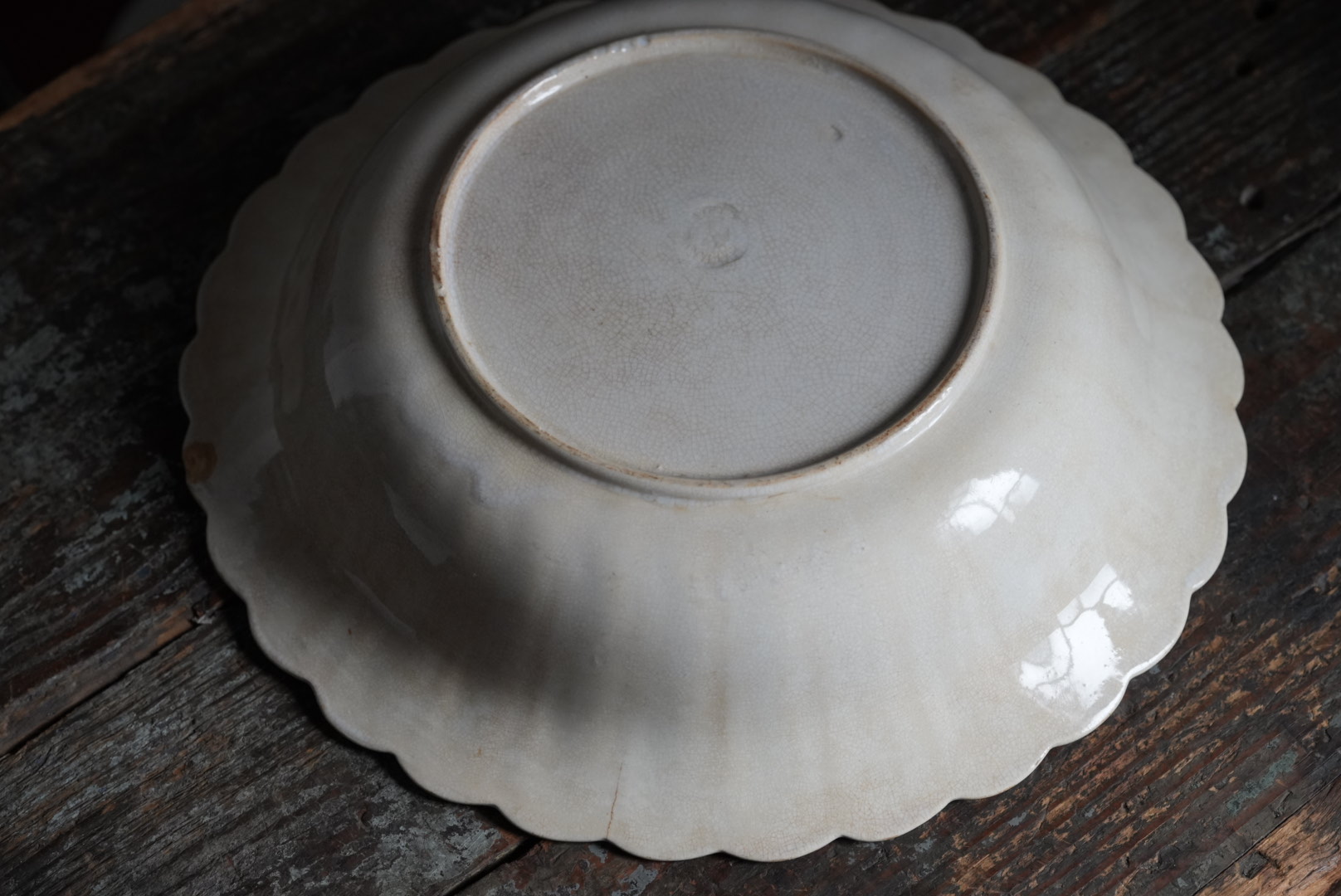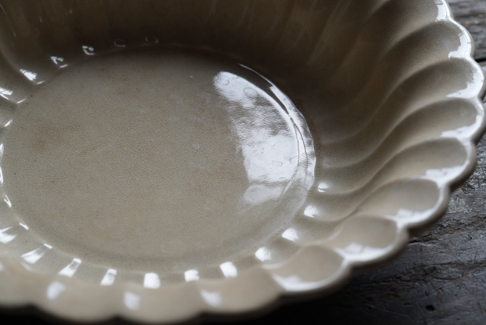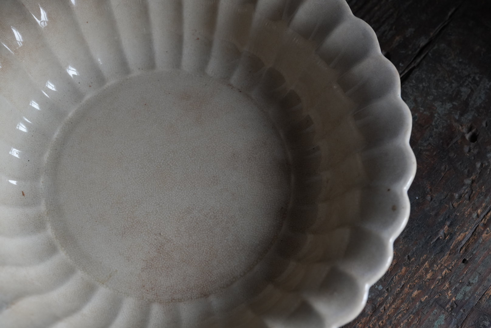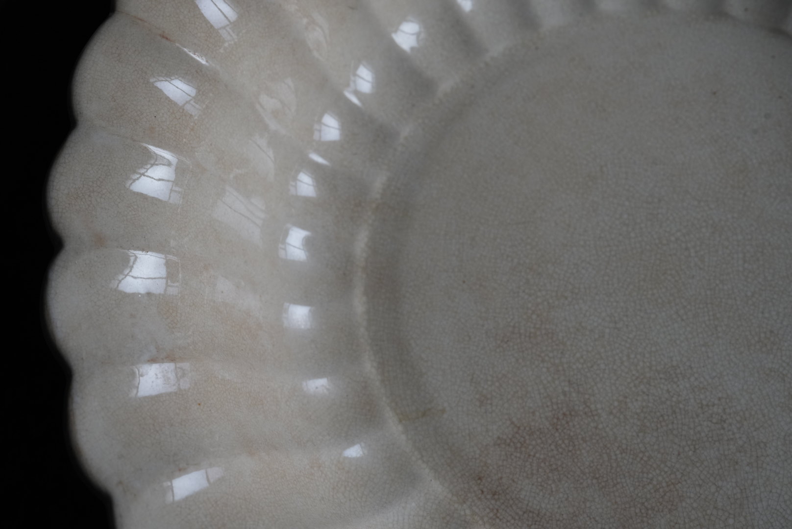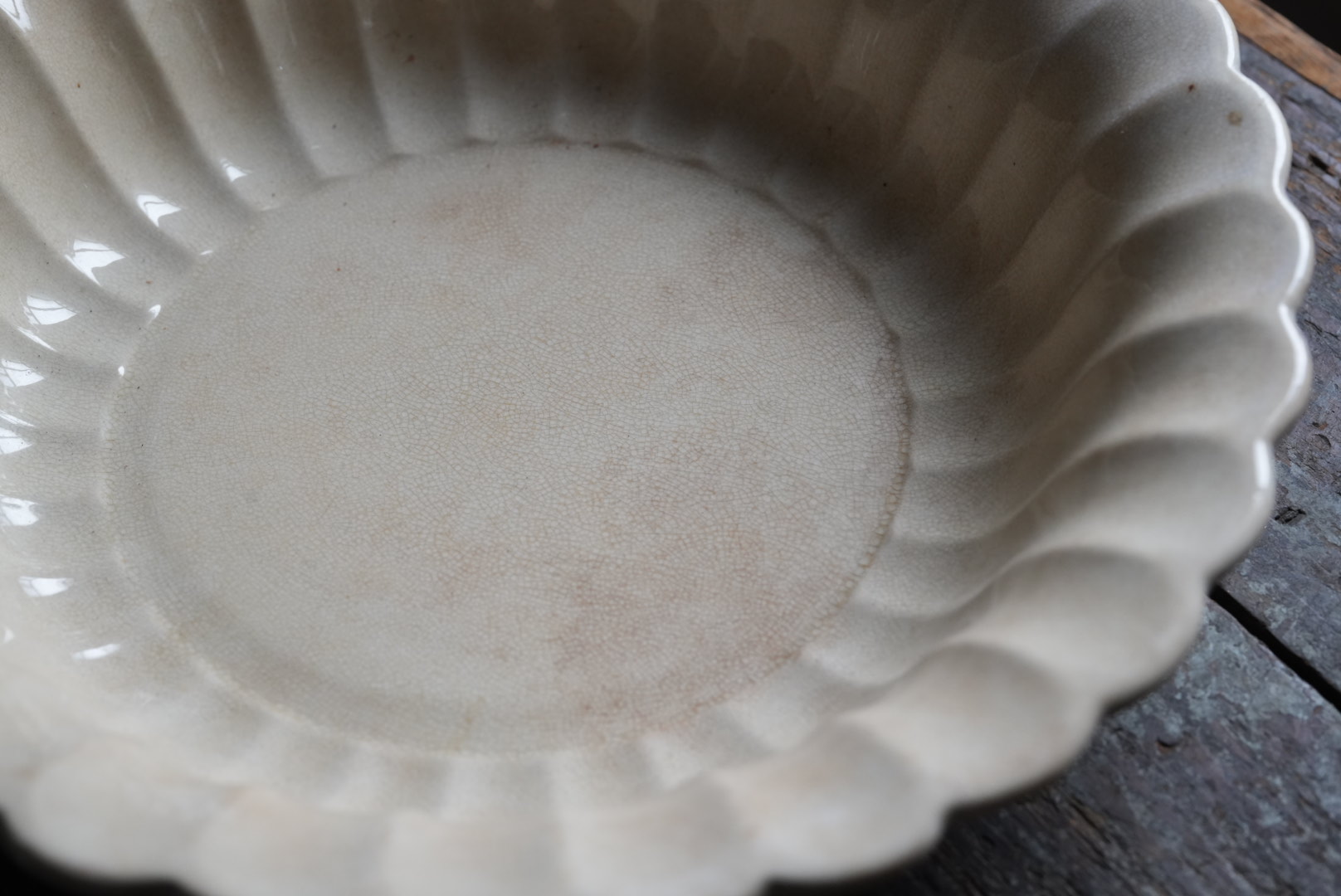 美しい造形の輪花鉢です。 貫入と染みが美しく入っています。 大人数の食事会にも、静物としても。 チップはございますが、裏面のため目立つものではございません。