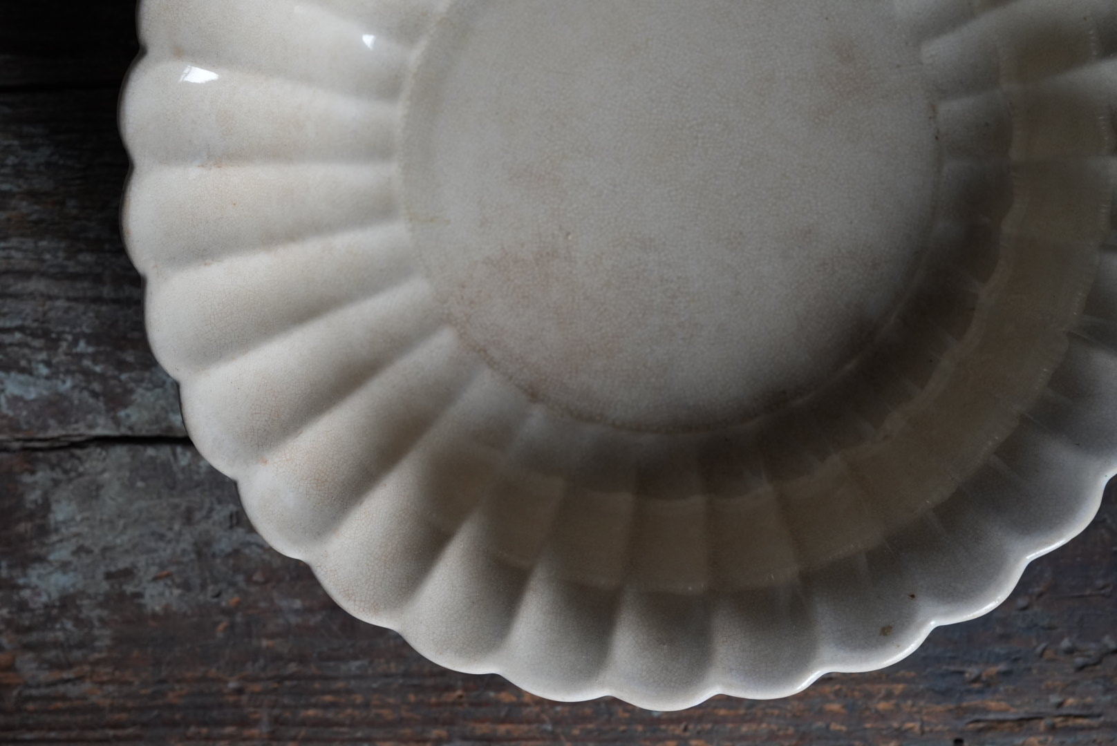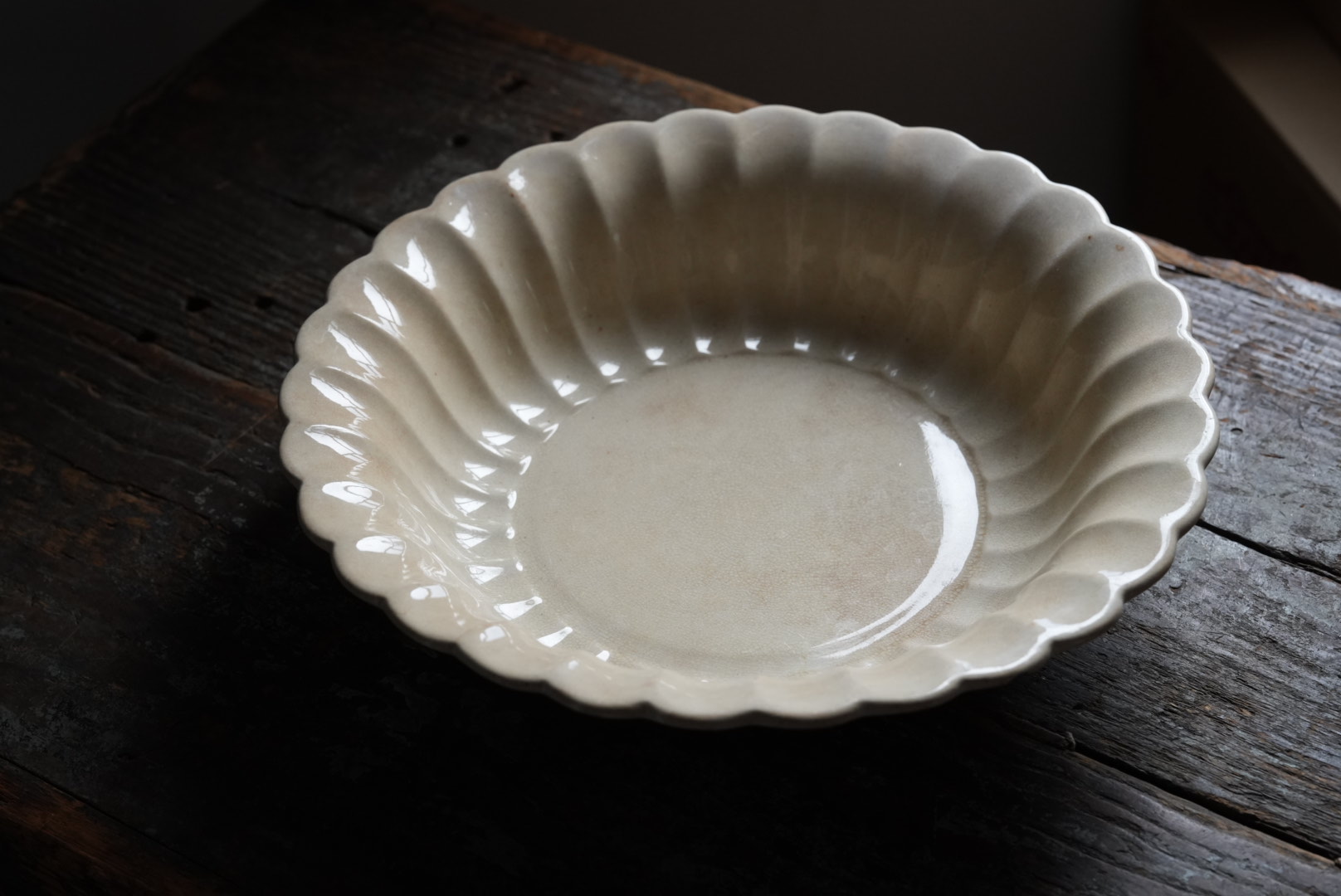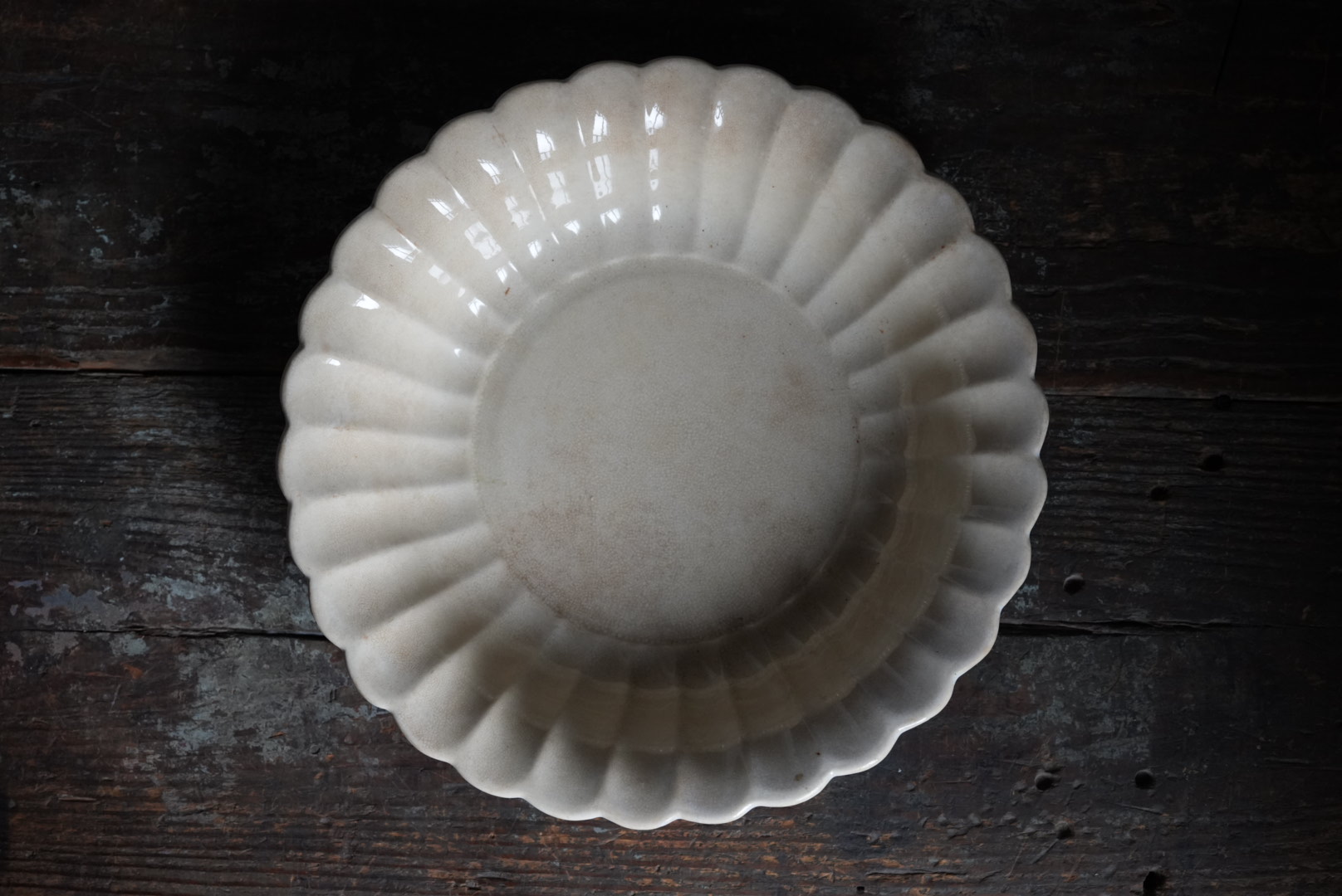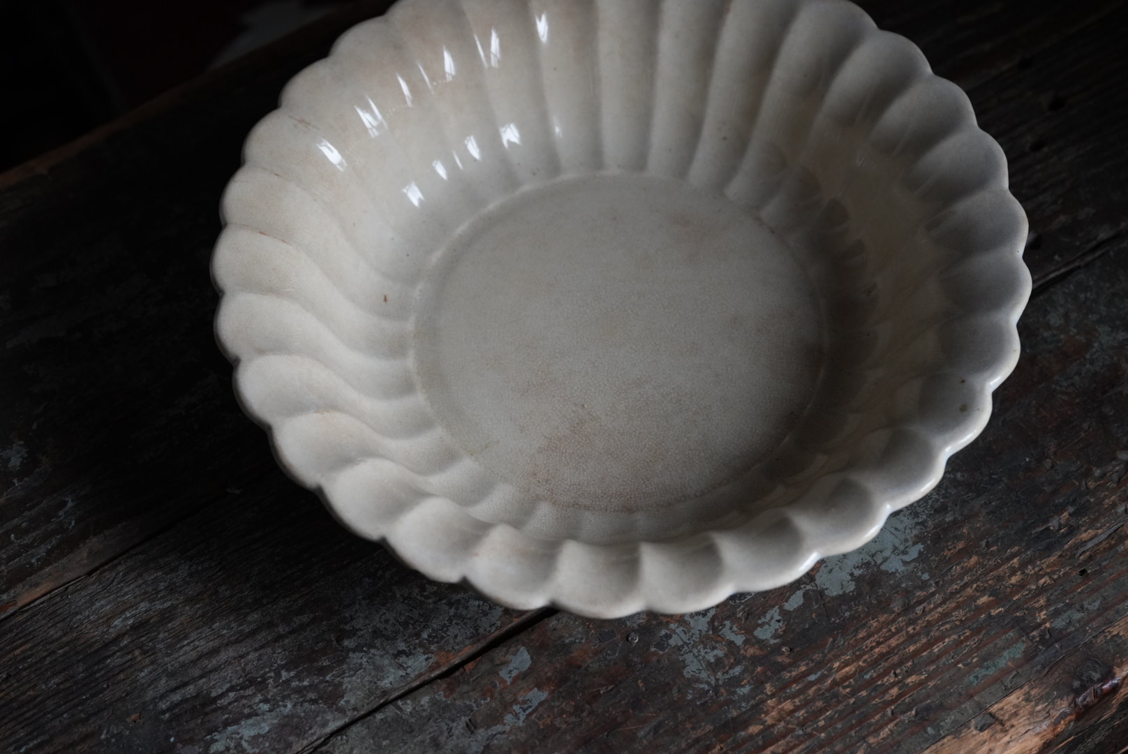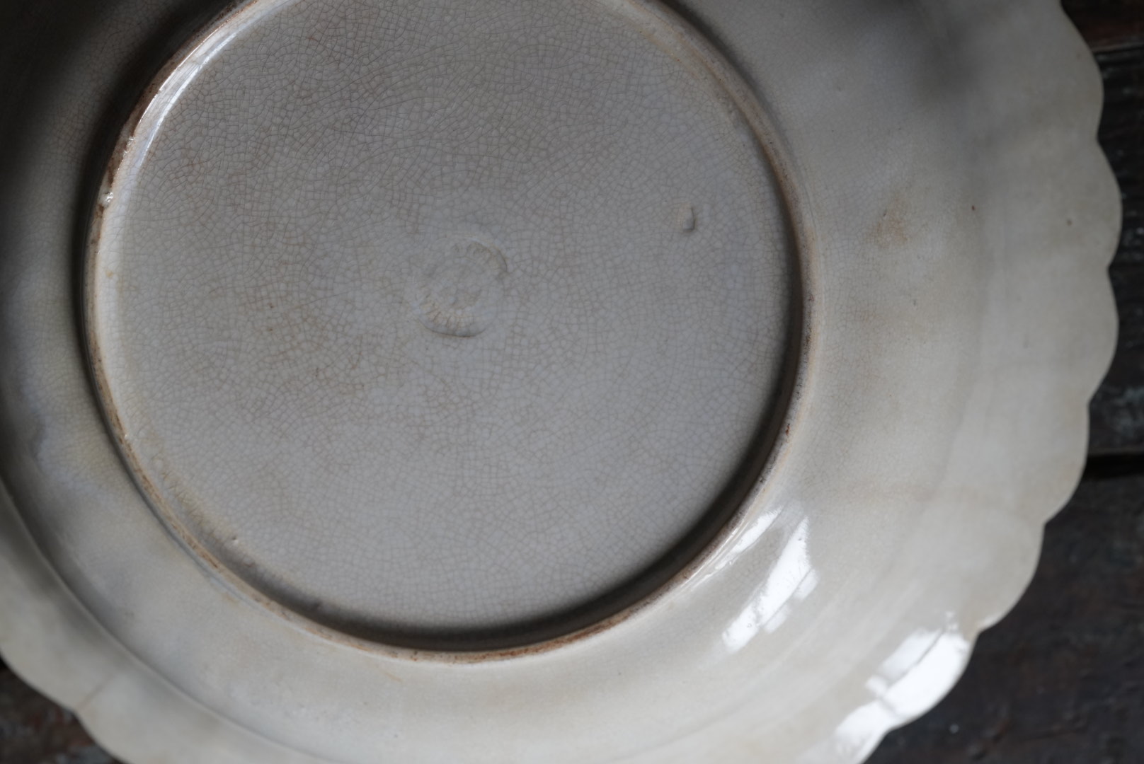 美しい造形の輪花鉢です。 貫入と染みが美しく入っています。 大人数の食事会にも、静物としても。 チップはございますが、裏面のため目立つものではございません。