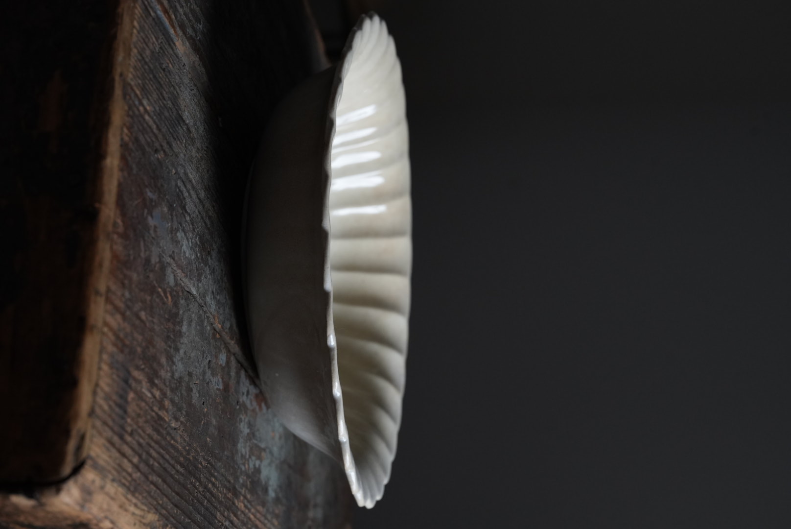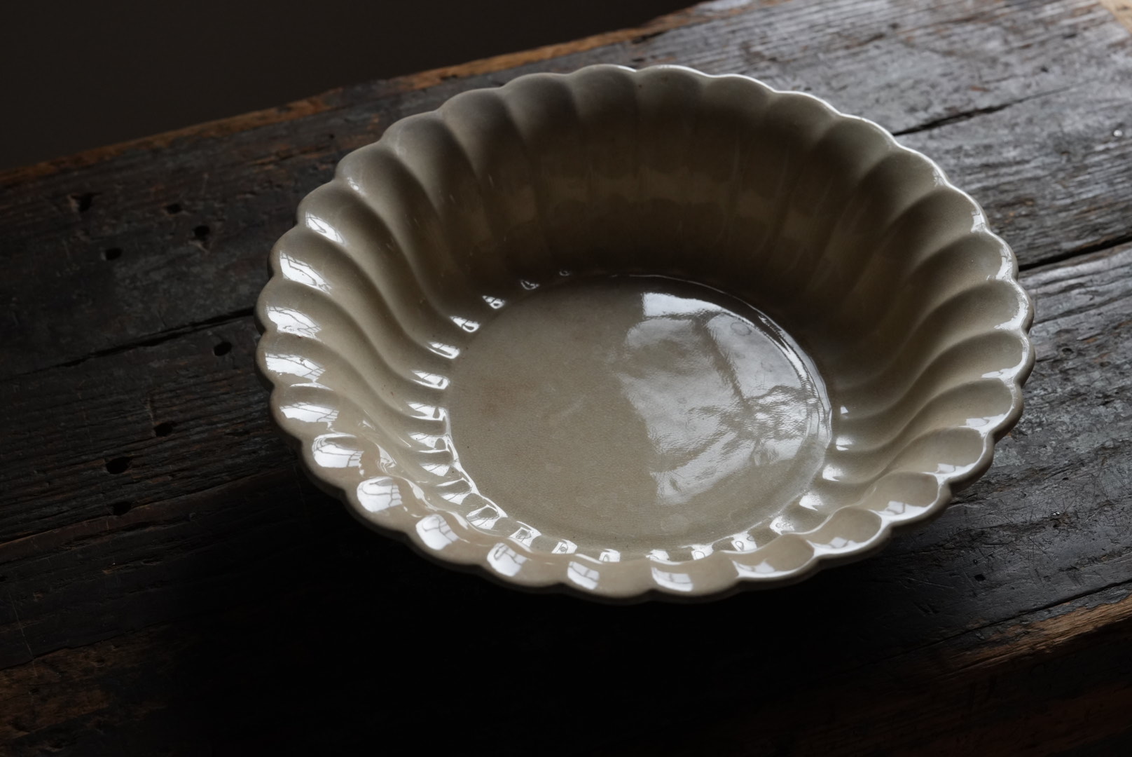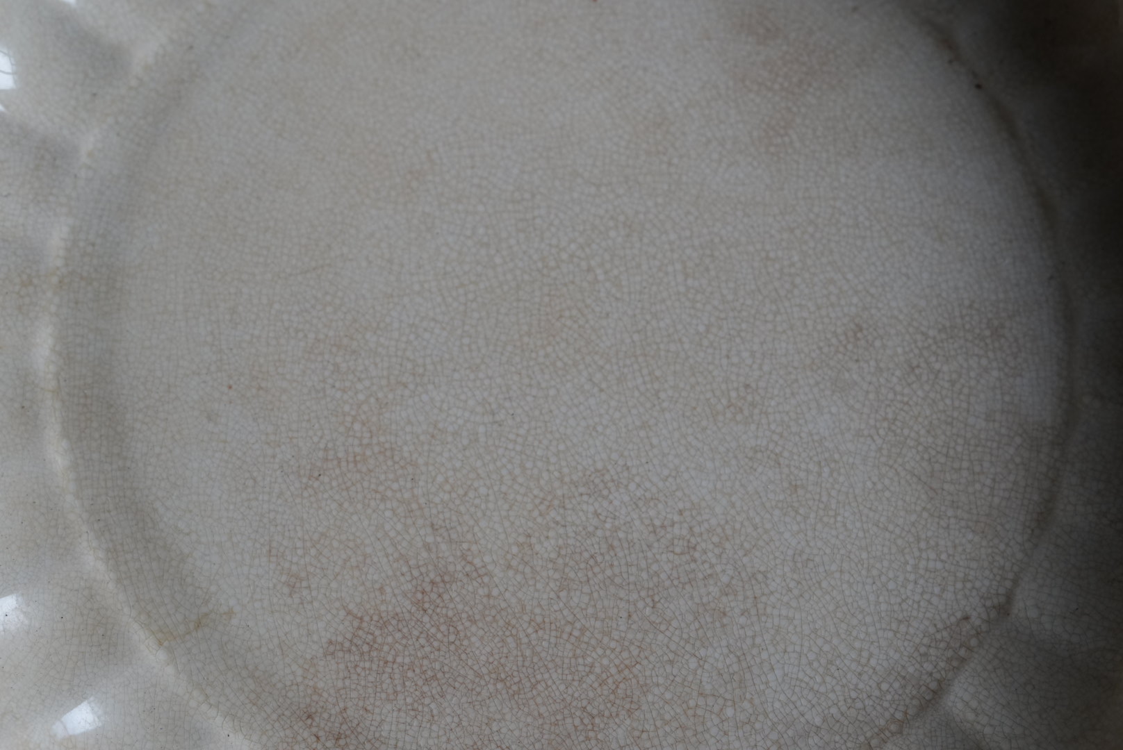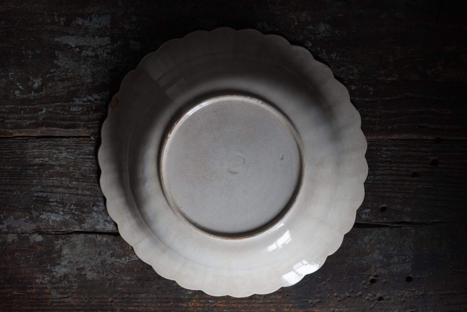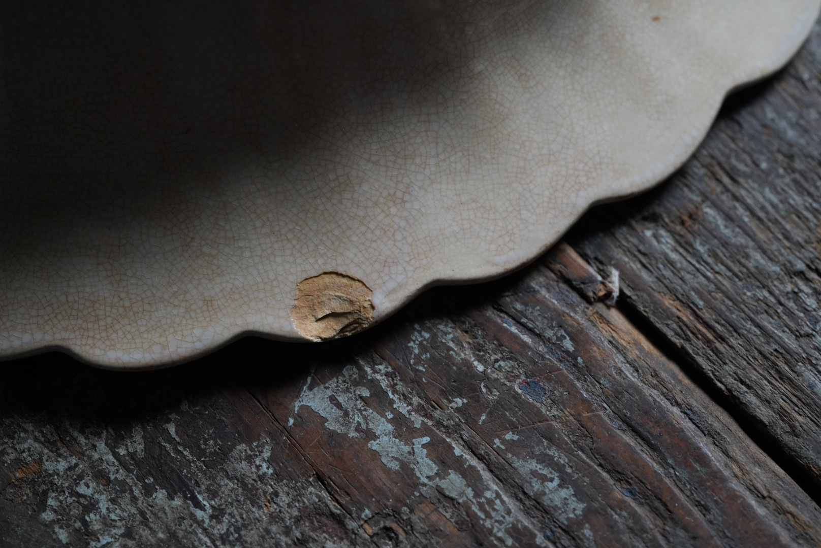 美しい造形の輪花鉢です。 貫入と染みが美しく入っています。 大人数の食事会にも、静物としても。 チップはございますが、裏面のため目立つものではございません。