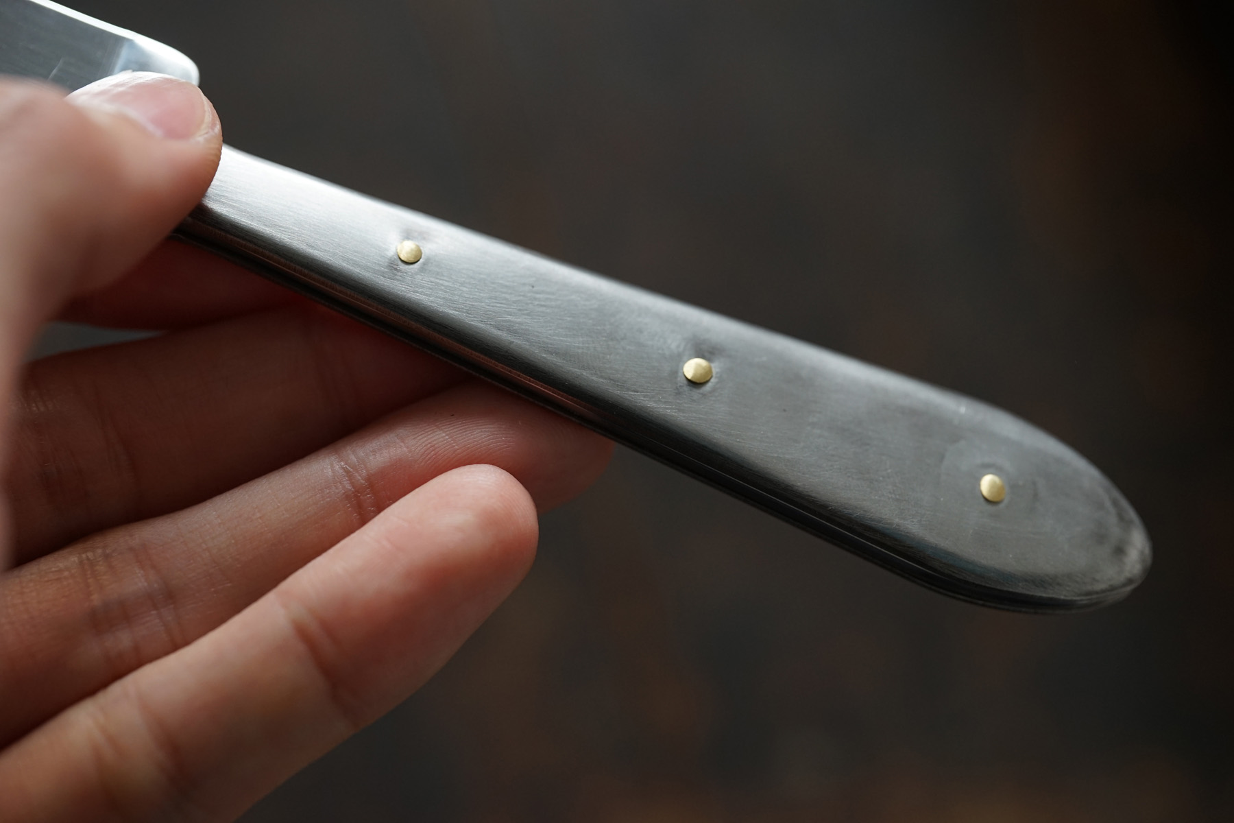 discription : 近年の新作となります。ナイフにも刃が付き現代の食卓に合うサイズ感に仕上がっています。古物とも取り合わせよいかとおもいます。 ナイフの刃はステンレス製、その他は真鍮に銀メッキの後に黒染めや研磨され仕上げられています。