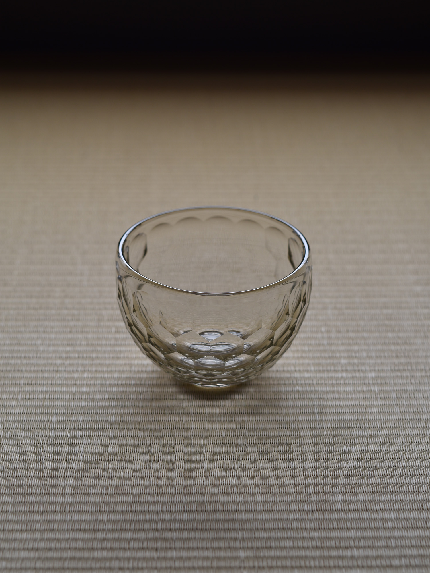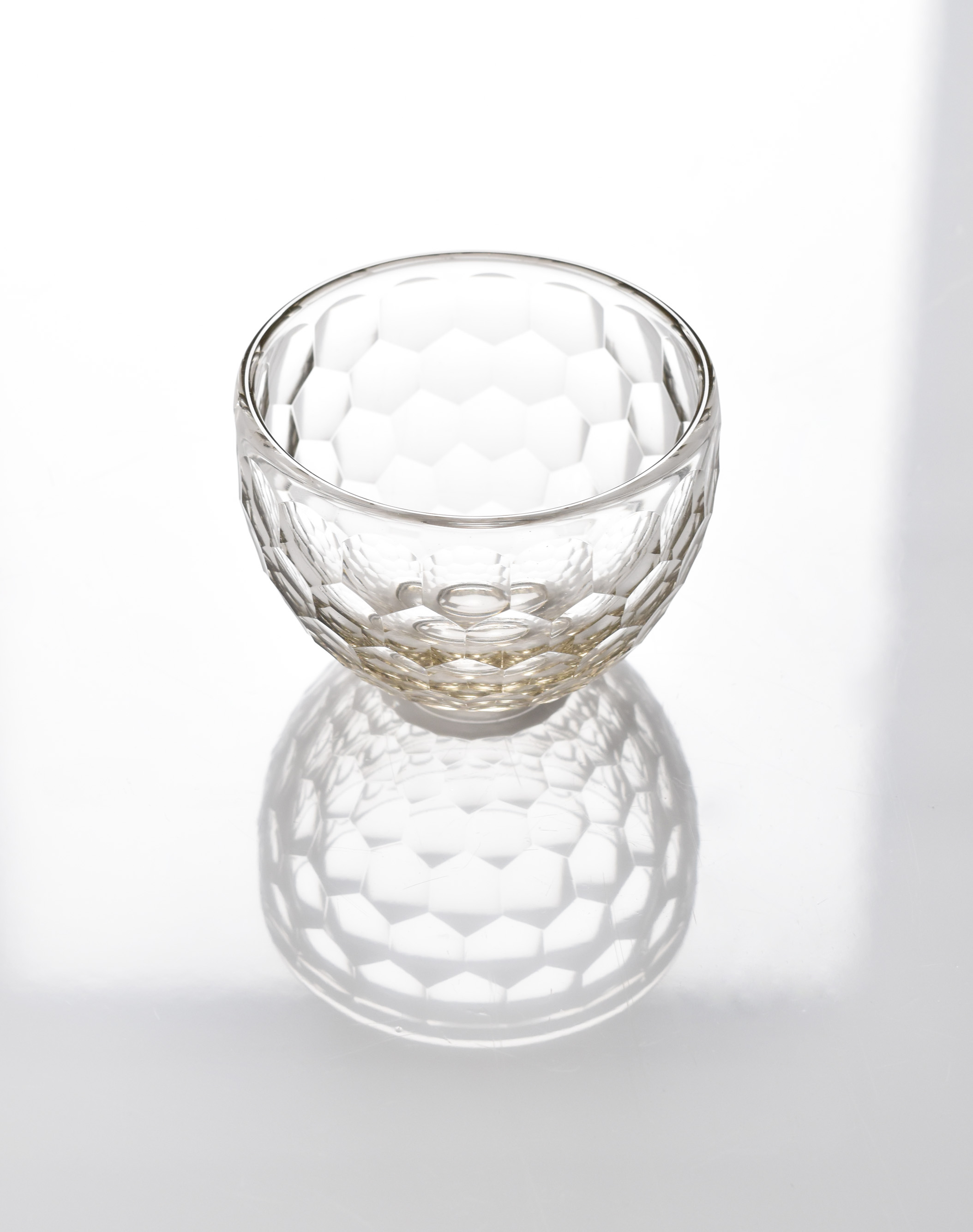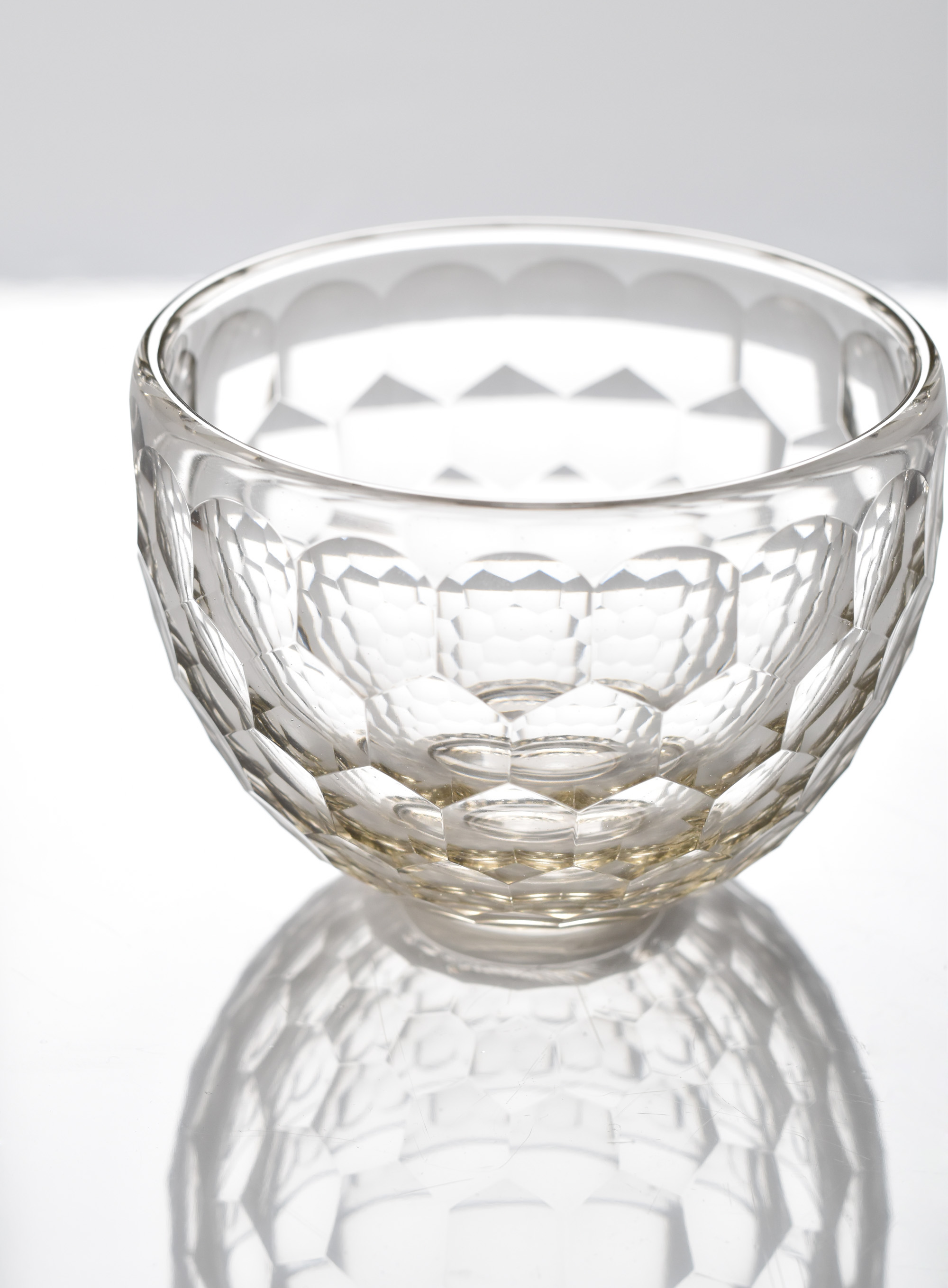 description : 円形のカットによる装飾が亀甲の文様として外面を覆う、万華鏡のように美しく反射する碗。正倉院の宝物でもある、ササン朝ペルシャガラス写し。酒器と異なり、高台を付けてあります。