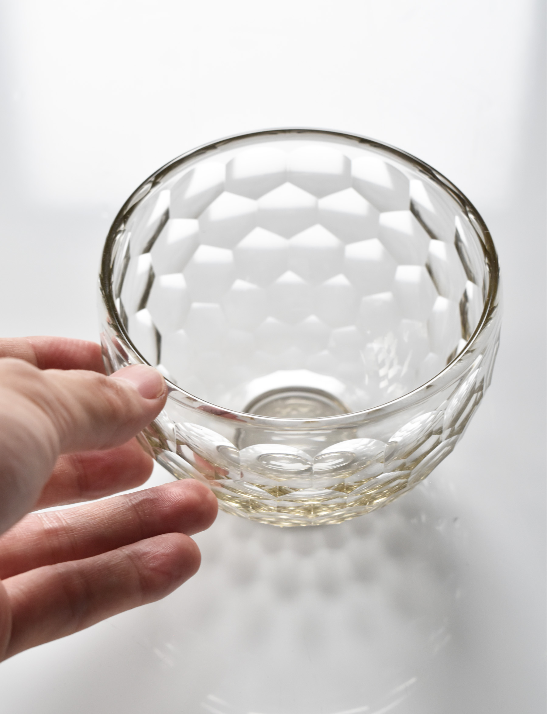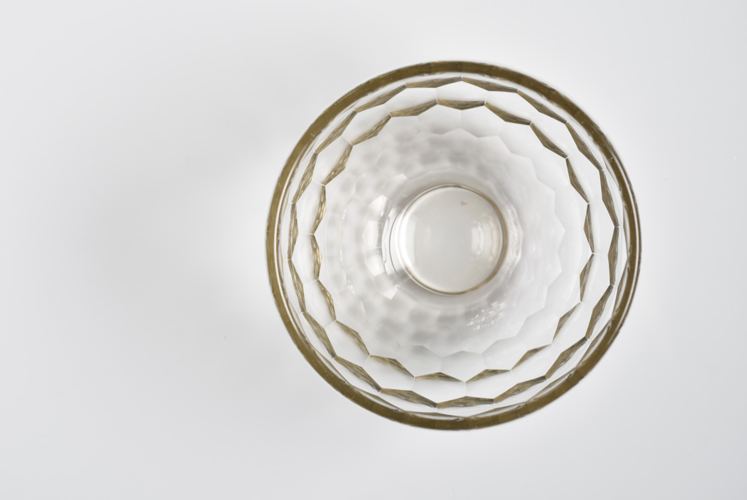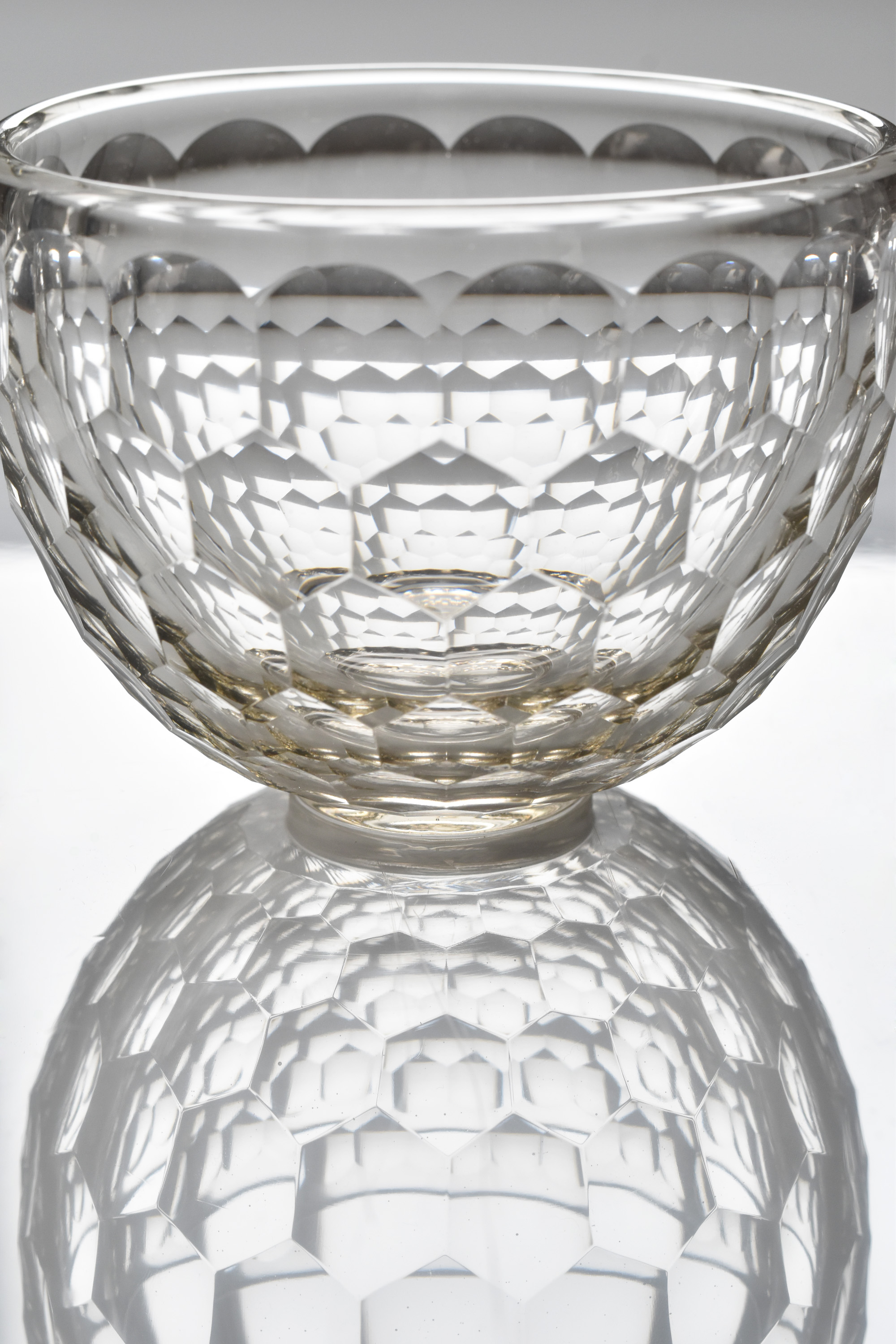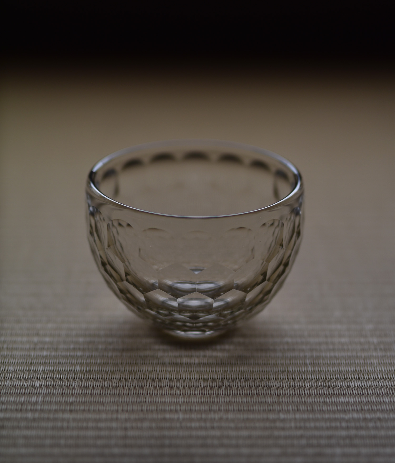 description : 円形のカットによる装飾が亀甲の文様として外面を覆う、万華鏡のように美しく反射する碗。正倉院の宝物でもある、ササン朝ペルシャガラス写し。酒器と異なり、高台を付けてあります。