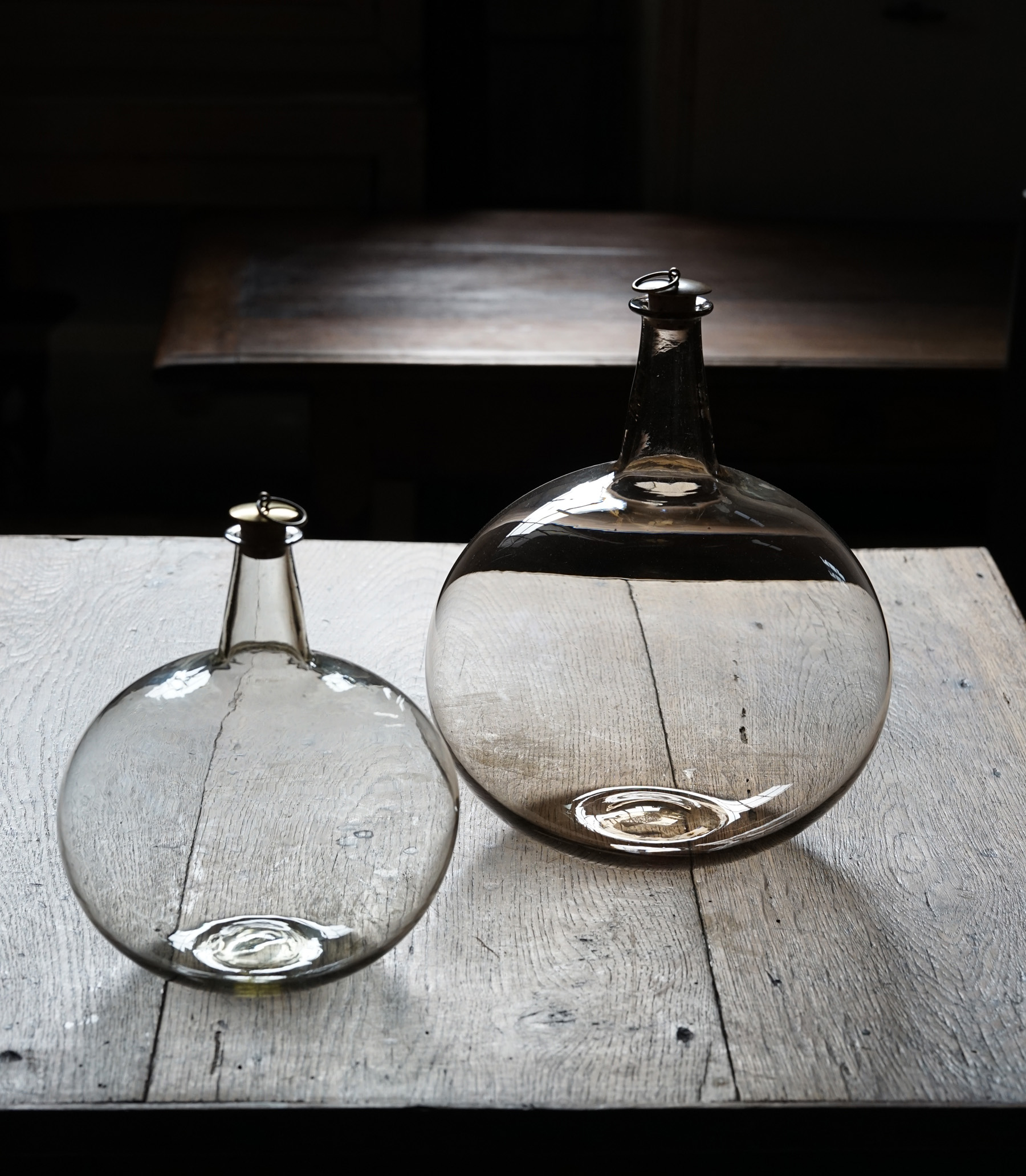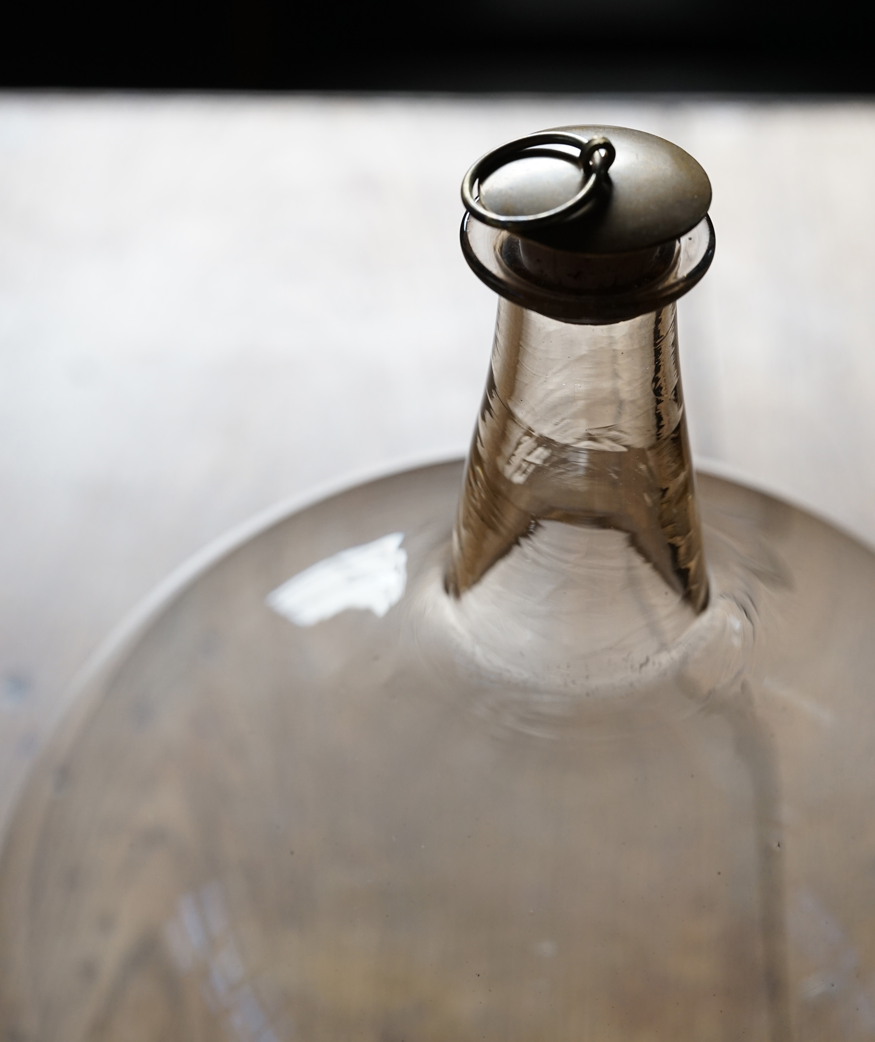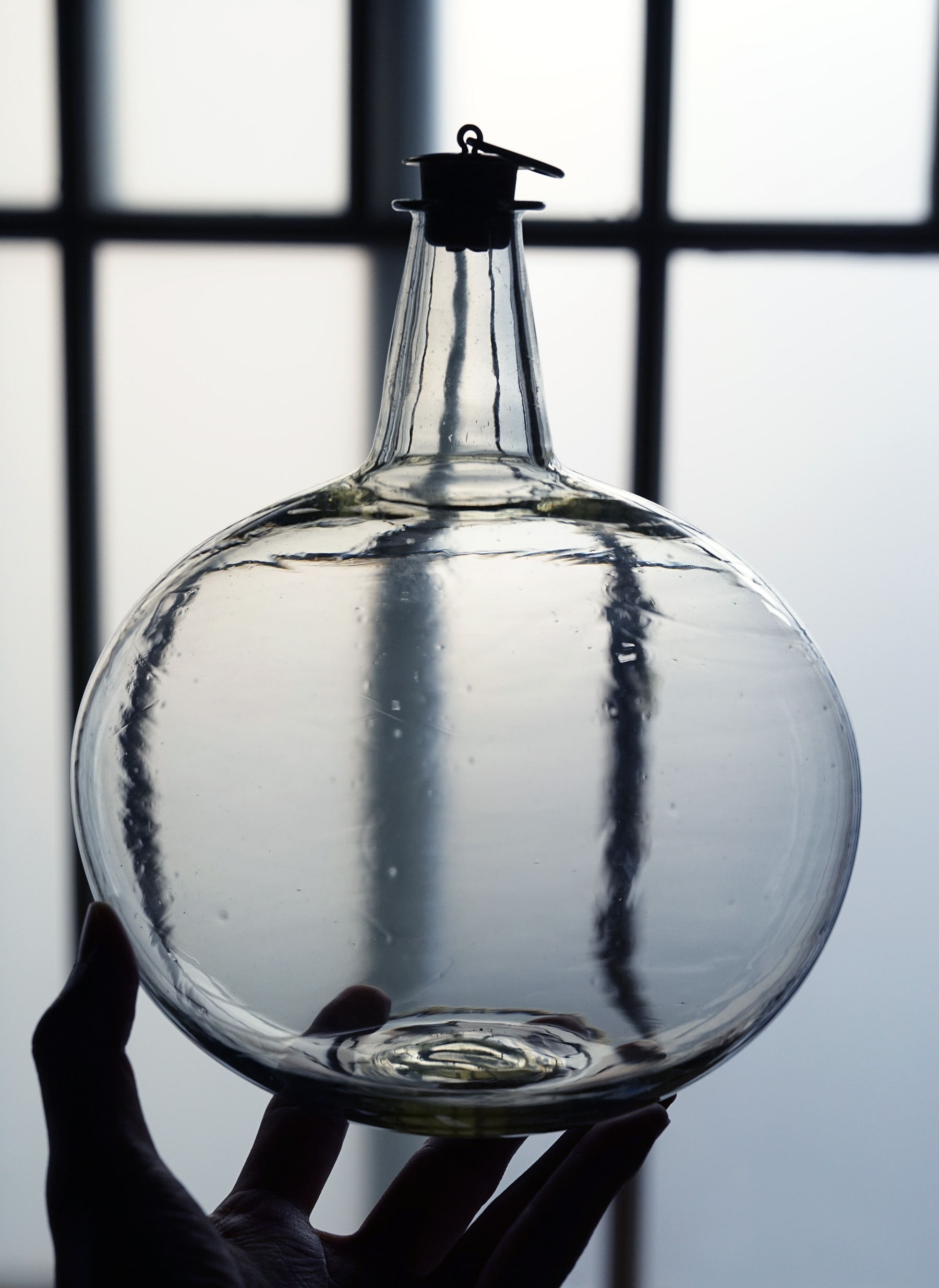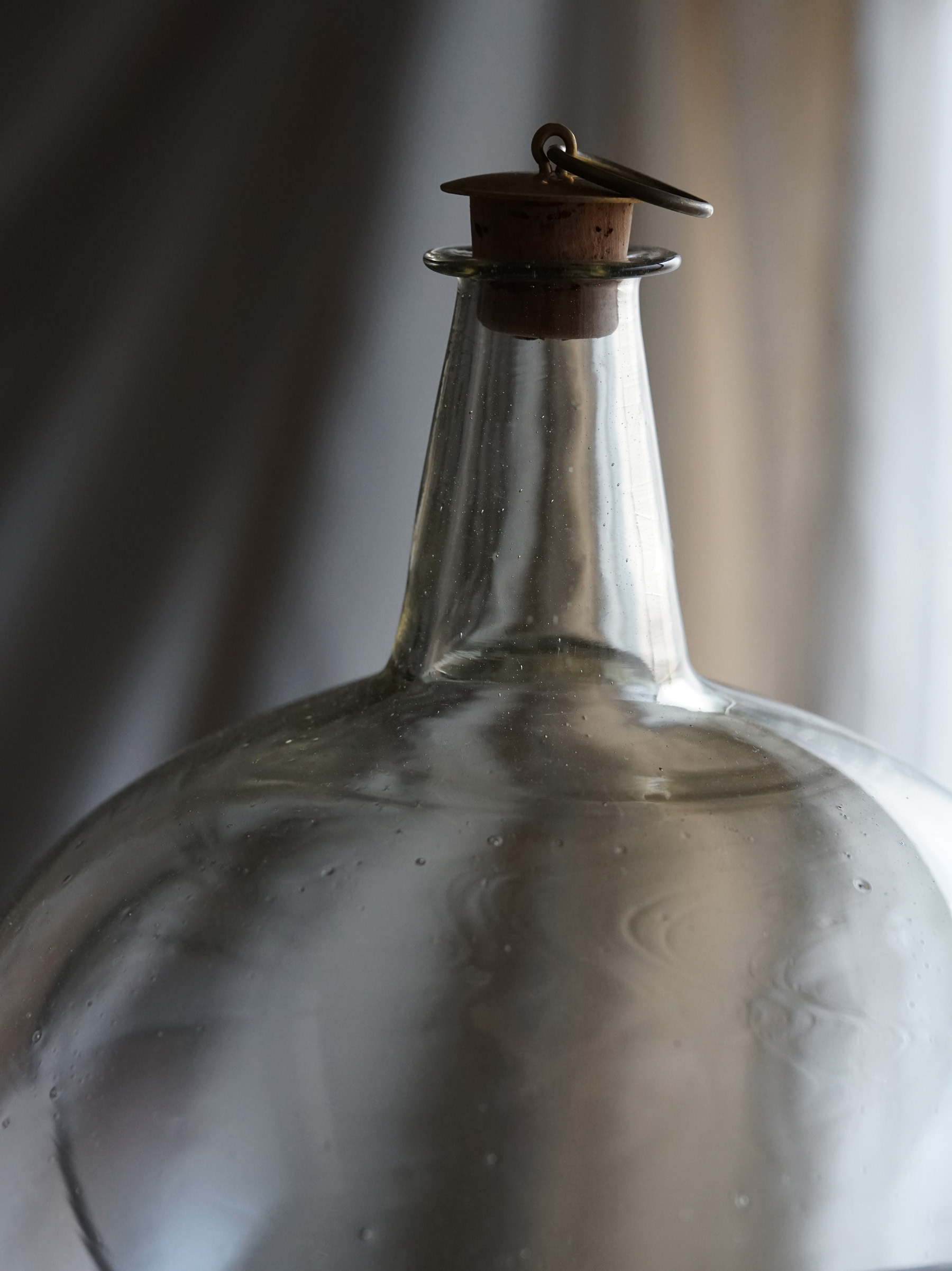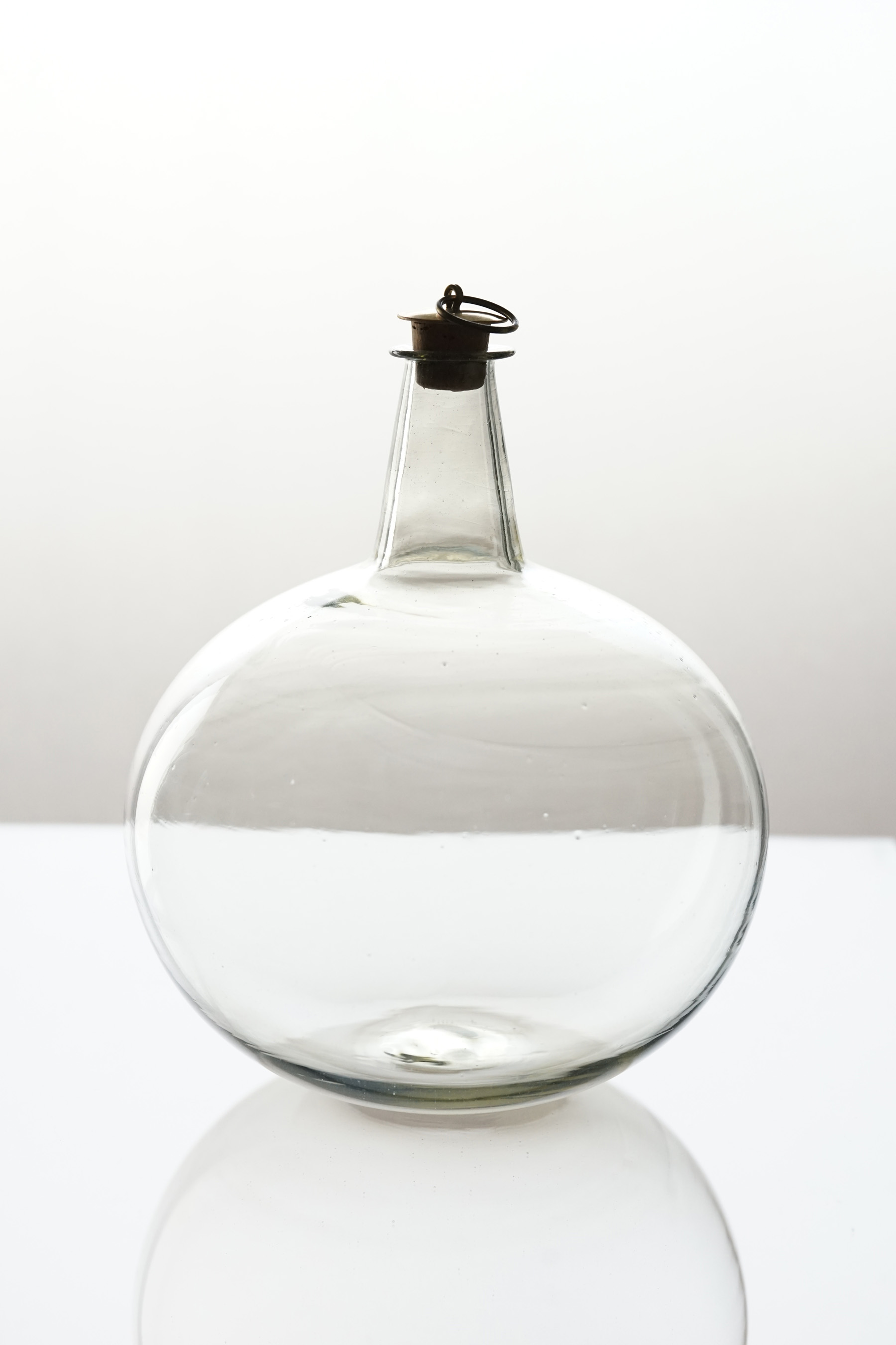 手吹きのニュアンスが美しい丸型酒瓶。 ただ置いておくだけでも美しい佇まい。