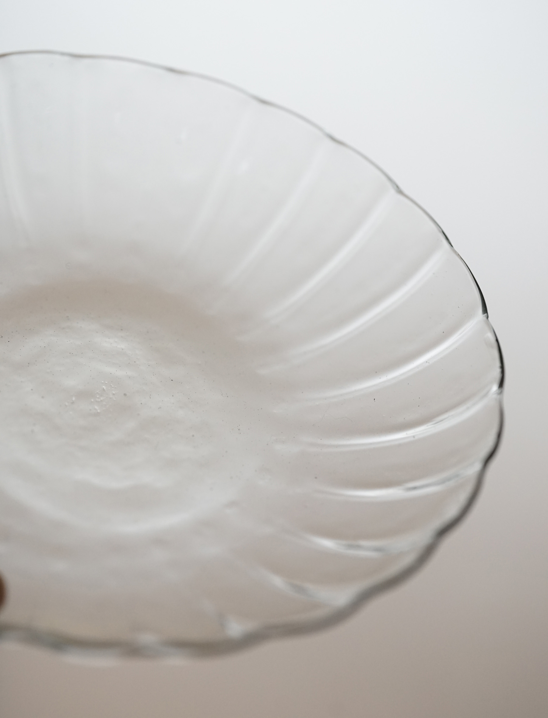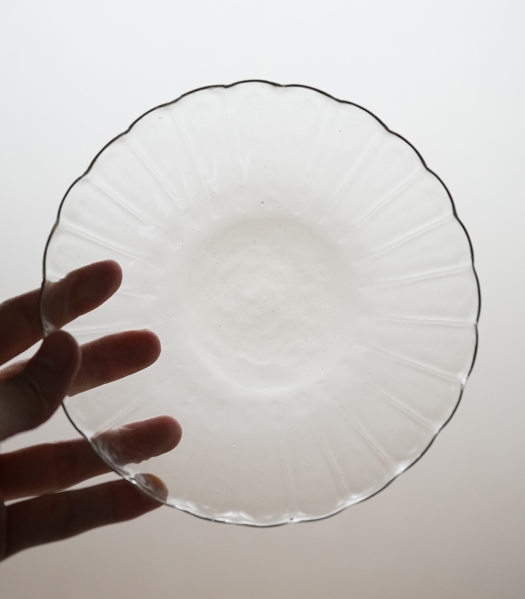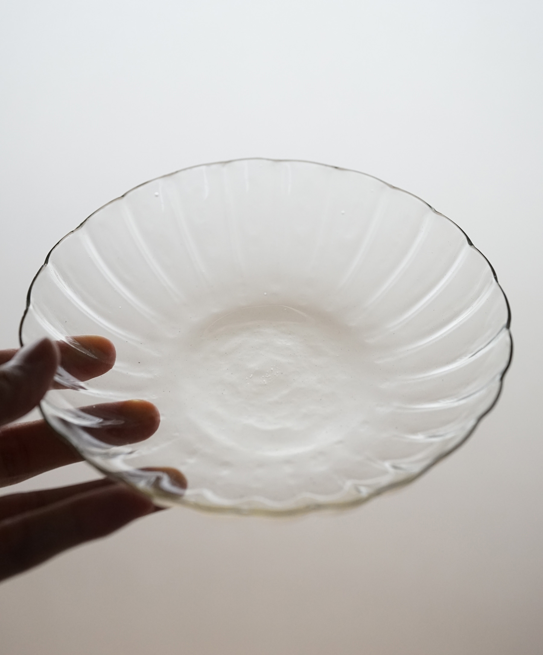 シンプルな型吹きの菊型皿。和にも洋にも合わせやすい表情。
