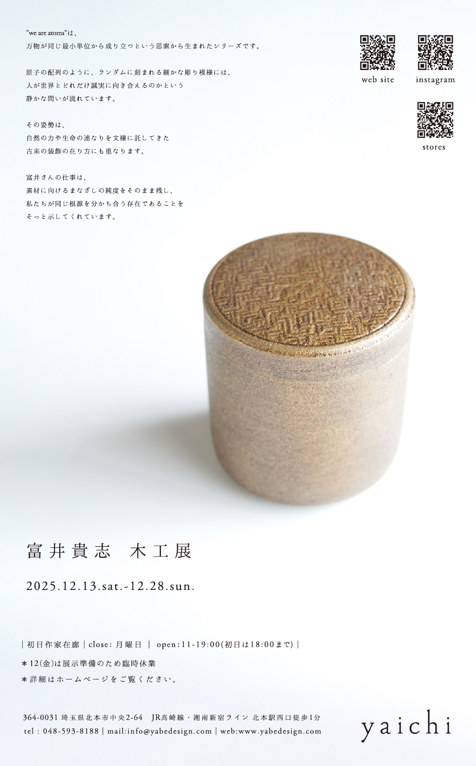 “we are atoms”は、万物が同じ最小単位から成り立つ という思索から生まれたシリーズです。 原子の配列のように、ランダムに刻まれる細かな彫り模様には、 人が世界とどれだけ誠実に向き合えるのかという 静かな問いが流れています。 その姿勢は、 自然の力や生命の連なりを文様に託してきた 古来の装飾の在り方にも重なります。 富井さんの仕事は、 素材に向けるまなざしの純度をそのまま残し、 私たちが同じ根源を分かち合う存在であることを そっと示してくれています。 “We are atoms” is a series born from the idea that all things are composed of the same smallest units. Like the arrangement of atoms, the finely carved, randomly etched patterns carry a quiet question: How sincerely can we face the world? This attitude resonates with the ancient approach to ornamentation, in which the forces of nature and the continuity of life were entrusted to patterns. Tomii’s work preserves the purity of his gaze toward the material, gently reminding us that we, too, share the same fundamental origin. |